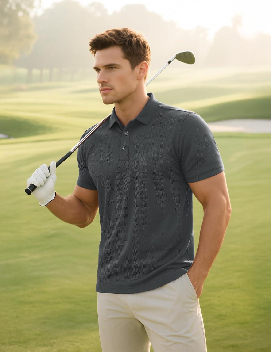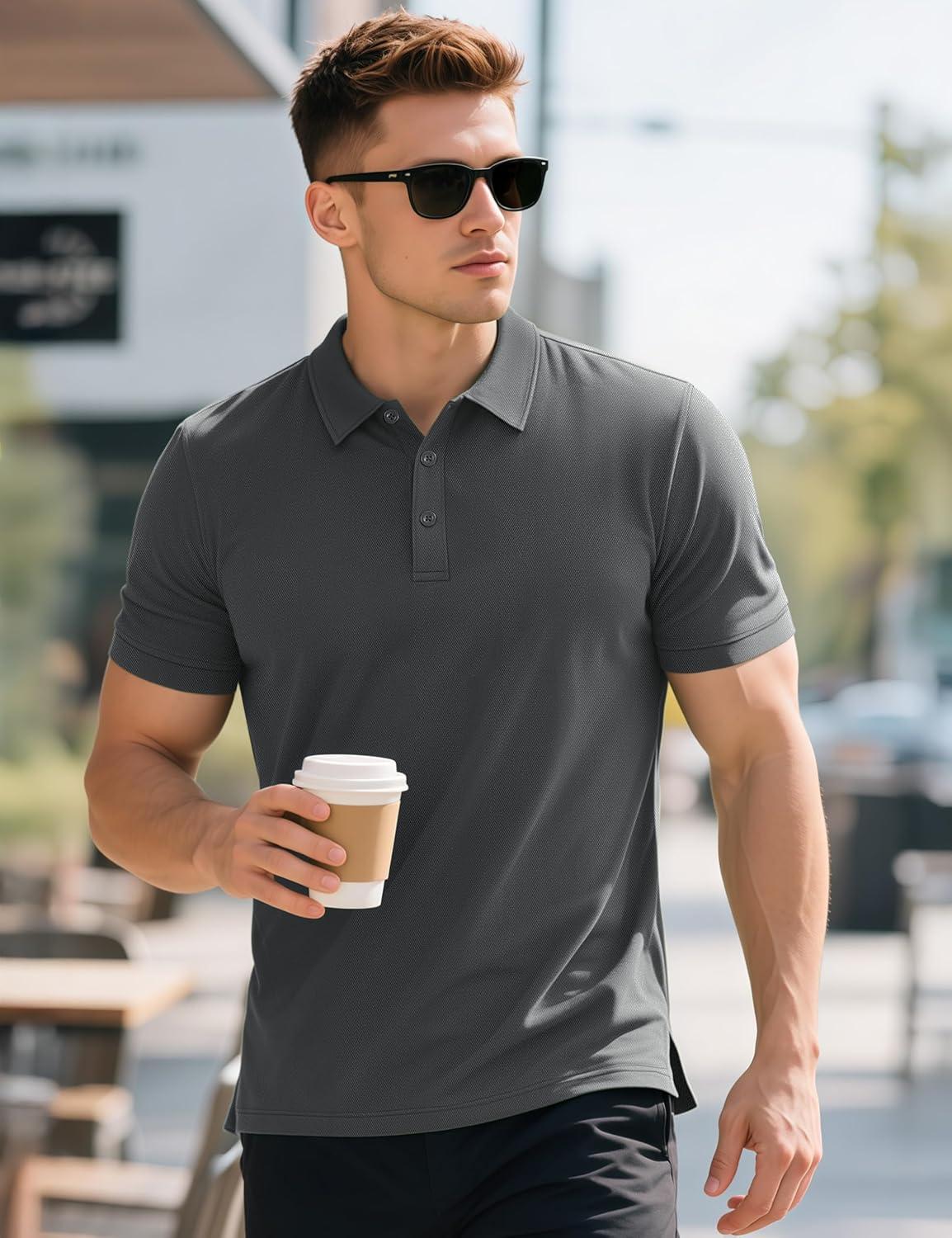 Polo shirts for men are made of 100% polyester fabric,featuring moisture wicking,quick dry and machine-washable.They are lightweight and equipped with a 3-button placket,self-fabric collar and split hem design,making them flexible and breathable,suitable for various occasions such as outdoor outings,daily commuting and fitness activities.