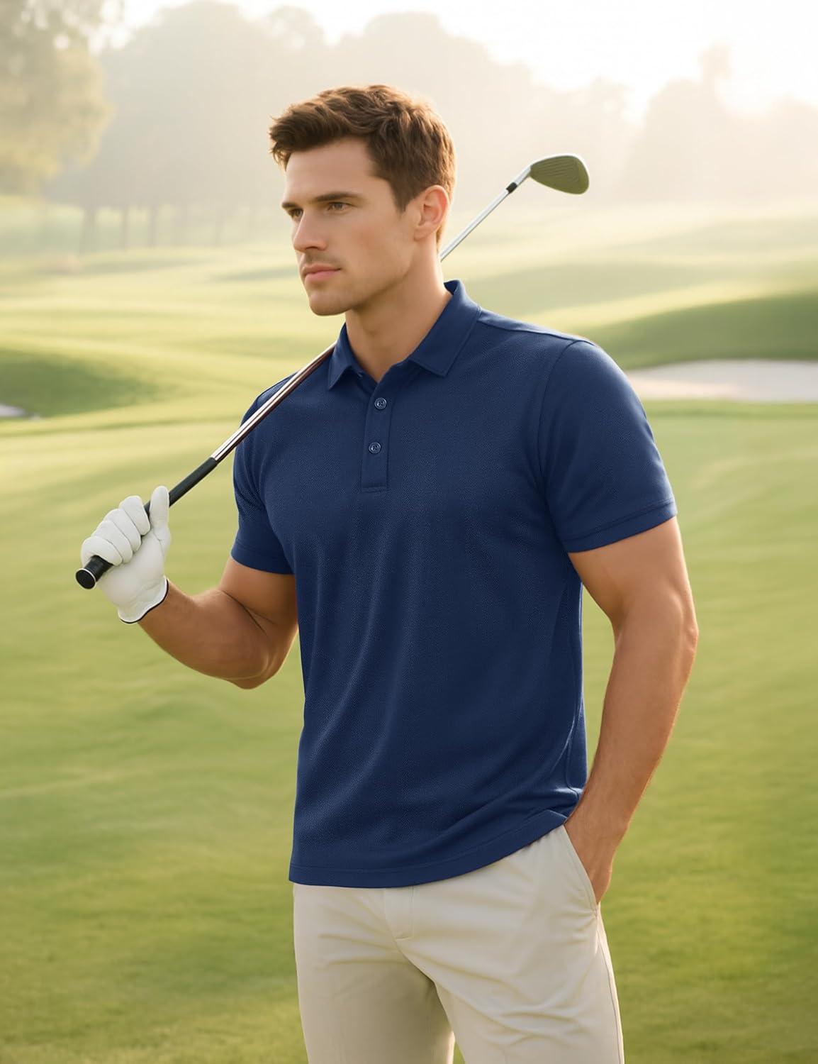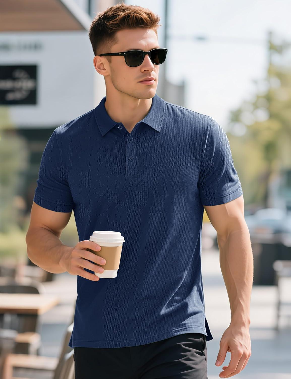 Polo shirts for men are made of 100% polyester fabric,featuring moisture wicking,quick dry and machine-washable.They are lightweight and equipped with a 3-button placket,self-fabric collar and split hem design,making them flexible and breathable,suitable for various occasions such as outdoor outings,daily commuting and fitness activities.