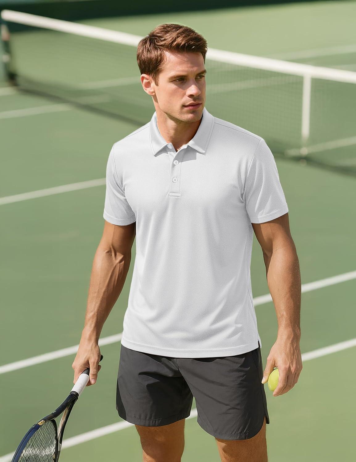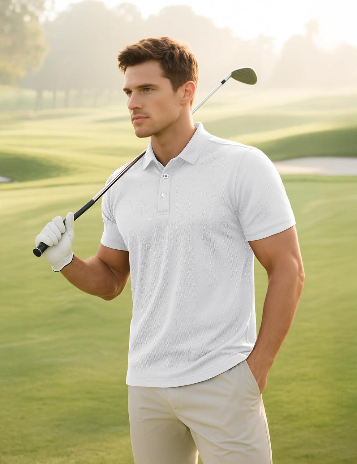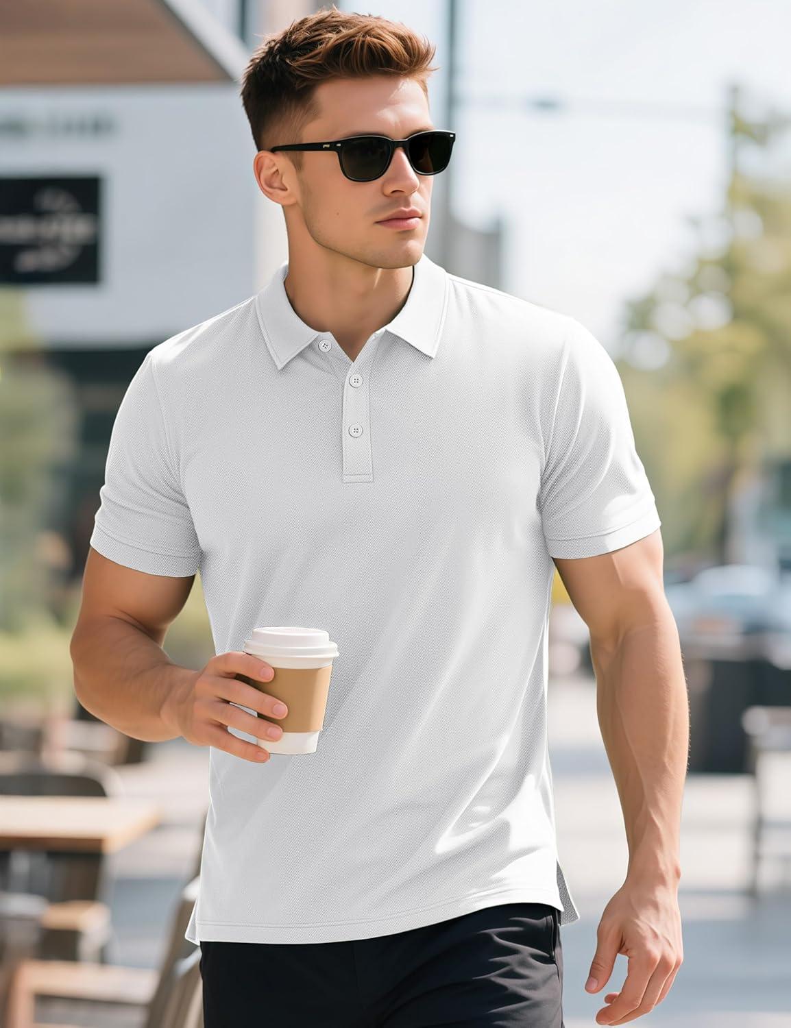 Polo shirts for men are made of 100% polyester fabric,featuring moisture wicking,quick dry and machine-washable.They are lightweight and equipped with a 3-button placket,self-fabric collar and split hem design,making them flexible and breathable,suitable for various occasions such as outdoor outings,daily commuting and fitness activities.