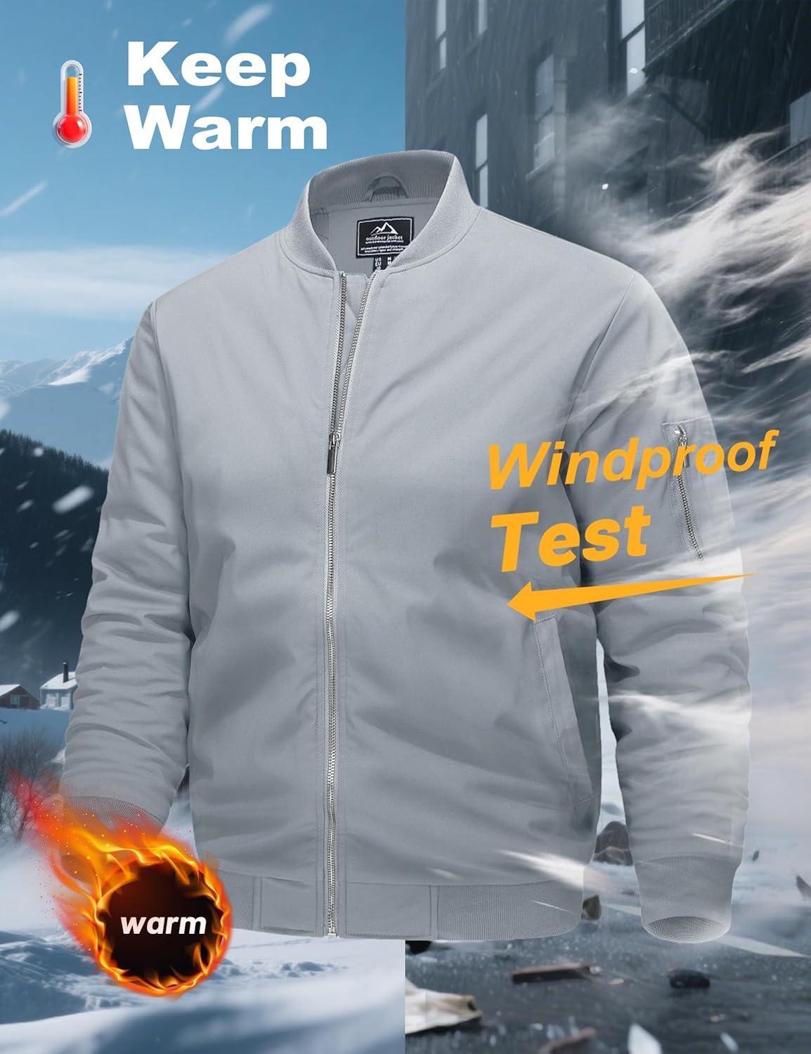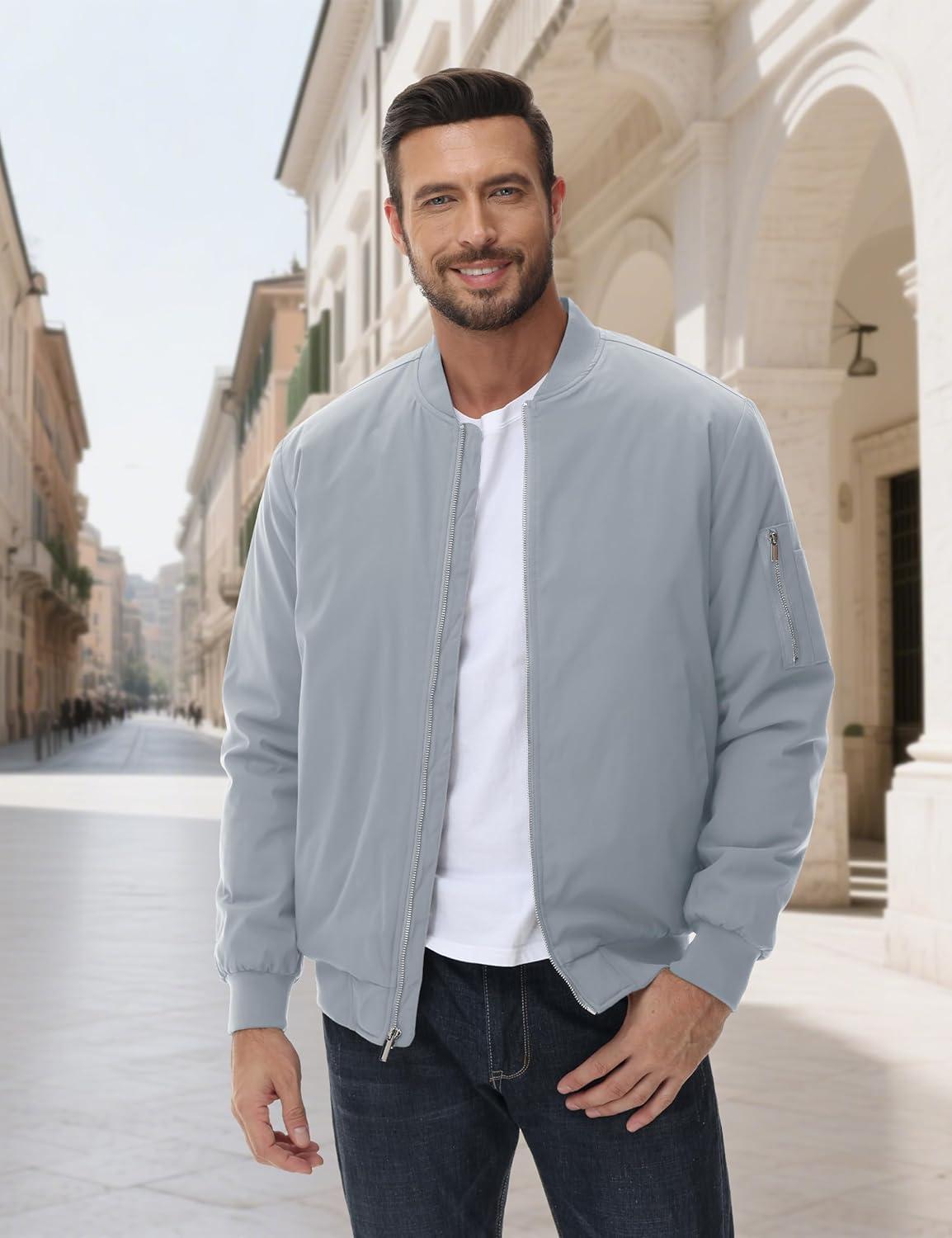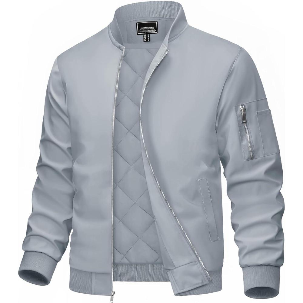 MAGCOMSEN Men’s Bomber Jacket Casual Windproof Quilted Jacket Full Zip Windbreaker Winter Warm Varsity Jacket with Pockets(Light Grey)