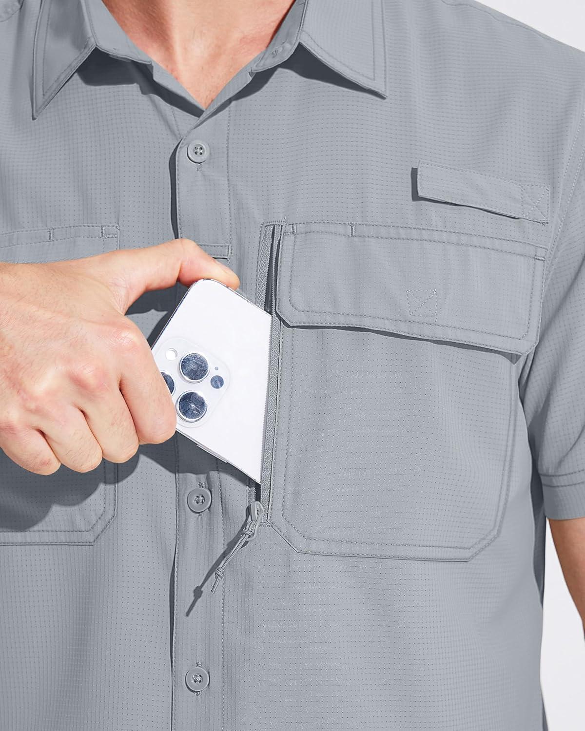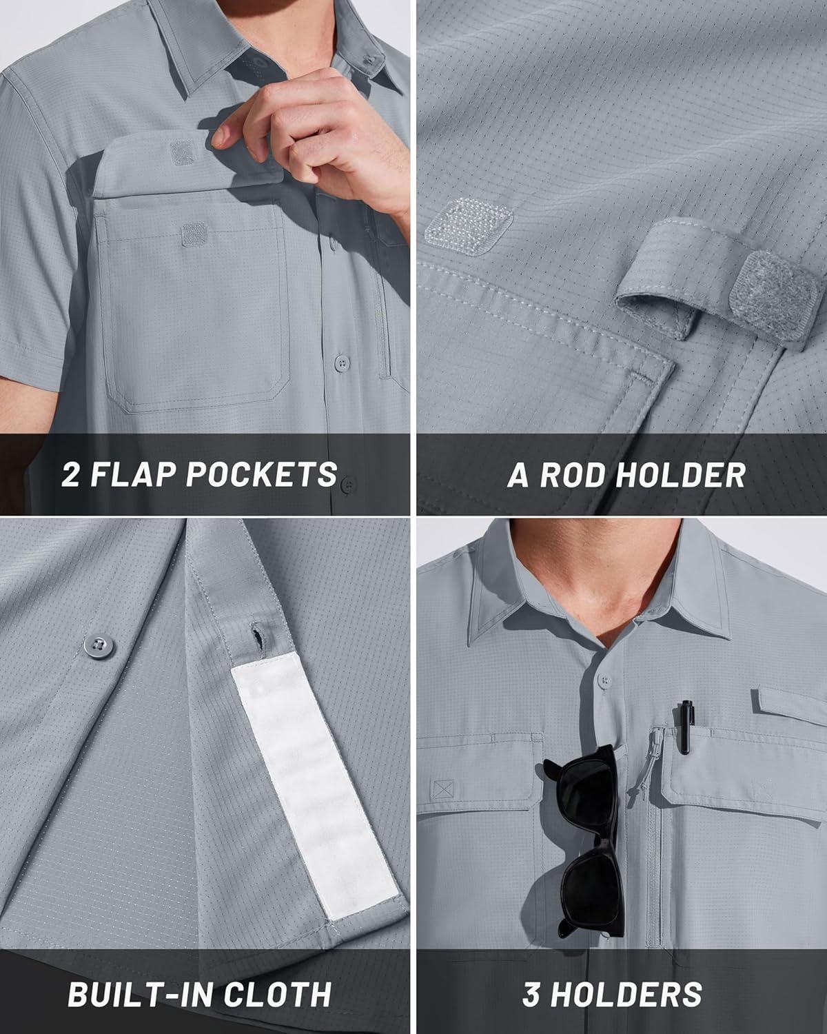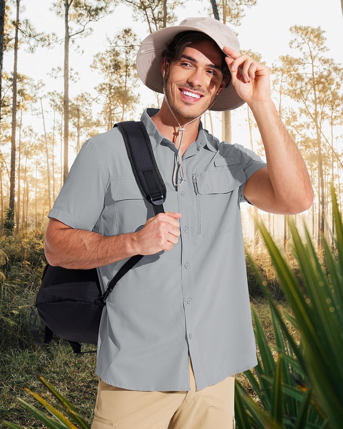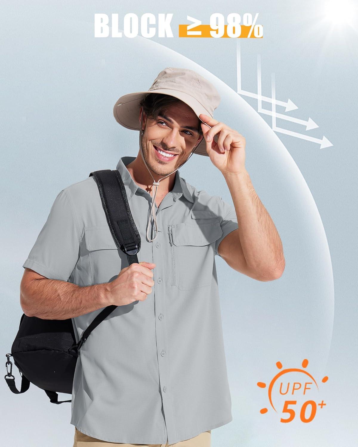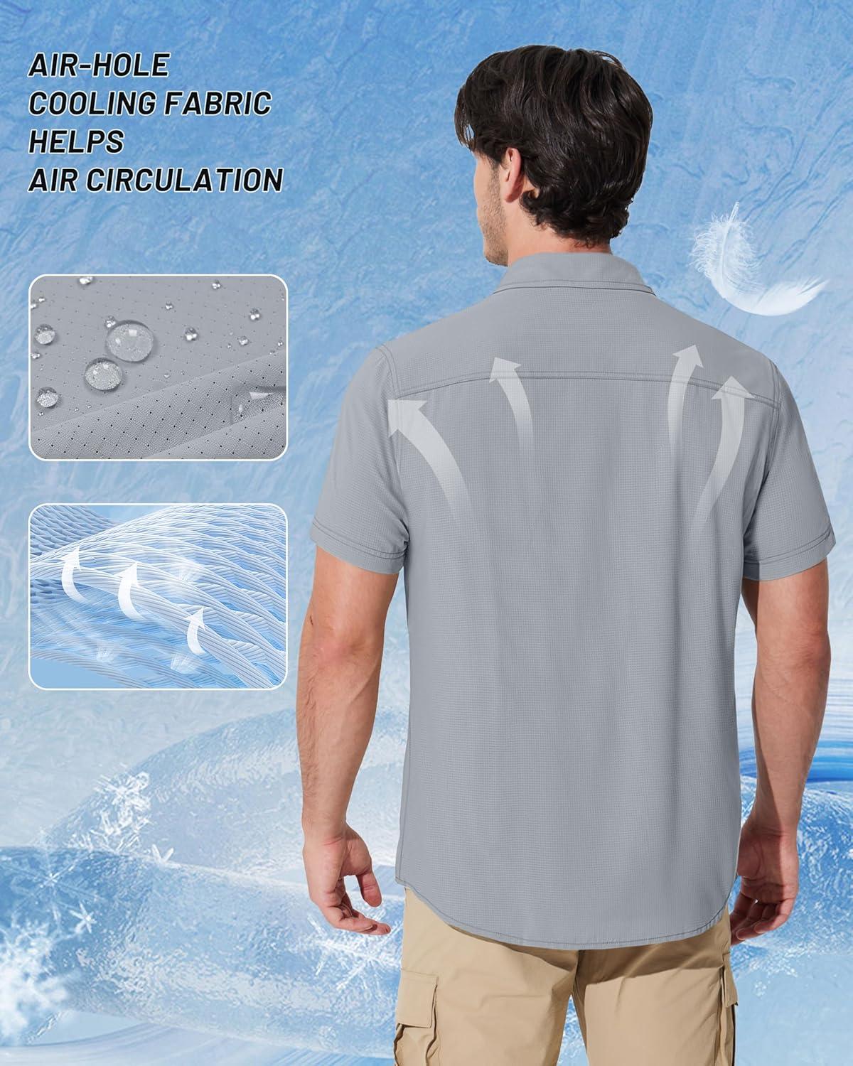 MAGCOMSEN Men’s Fishing Shirts UPF 50+ Short Sleeve Sun Protection Shirts Quick Dry Cooling Button Down Shirt Hiking Safari(Light Grey)