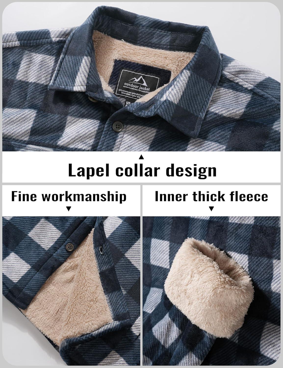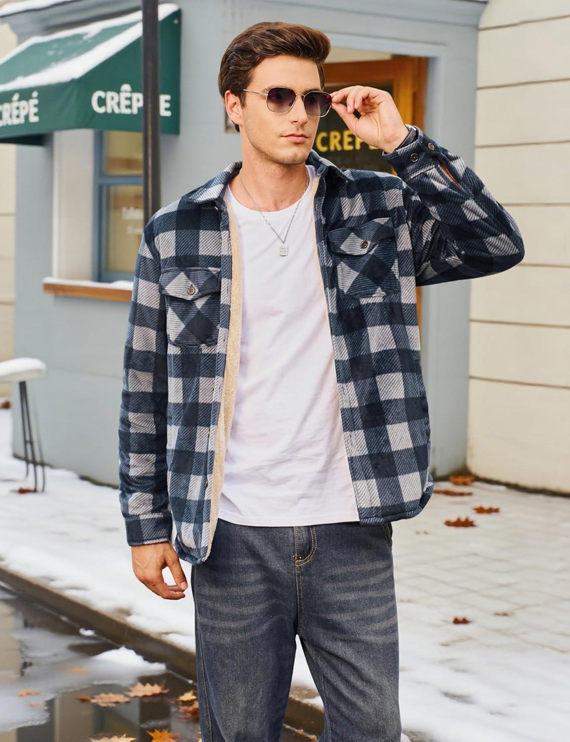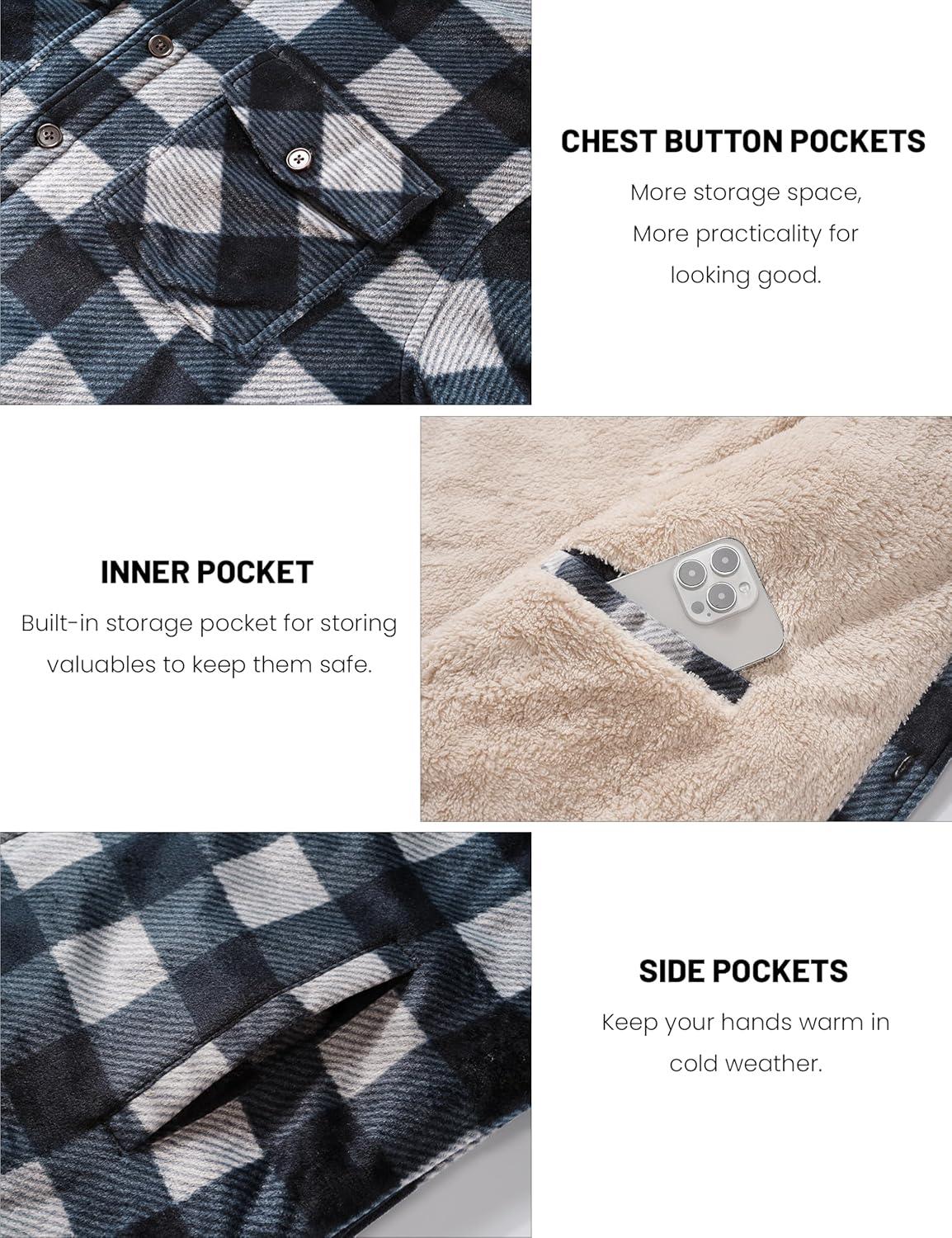 MAGCOMSEN Mens Flannel Shirt Jacket Fleece Lined Thick Long Sleeve Coat Winter Warm Plaid Shacket Jackets with 5 Pockets(Black Grey)