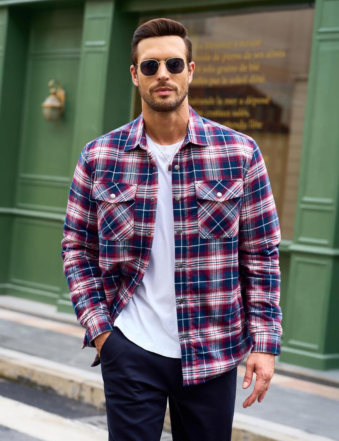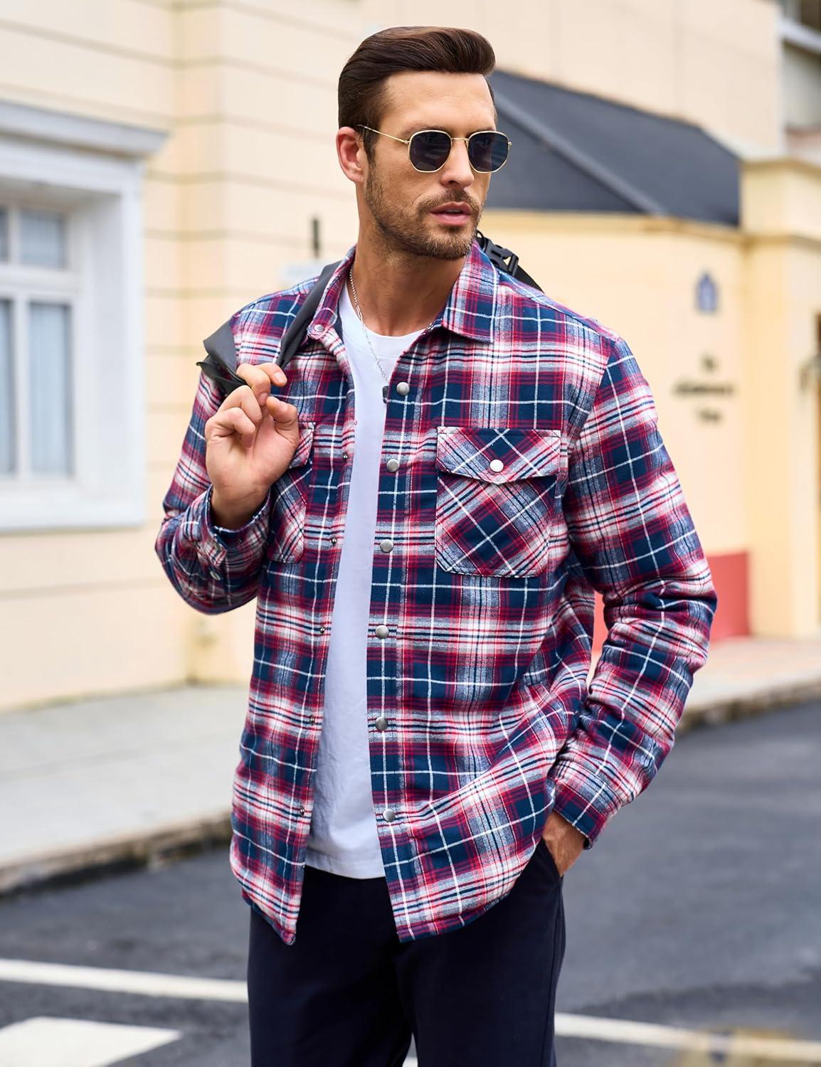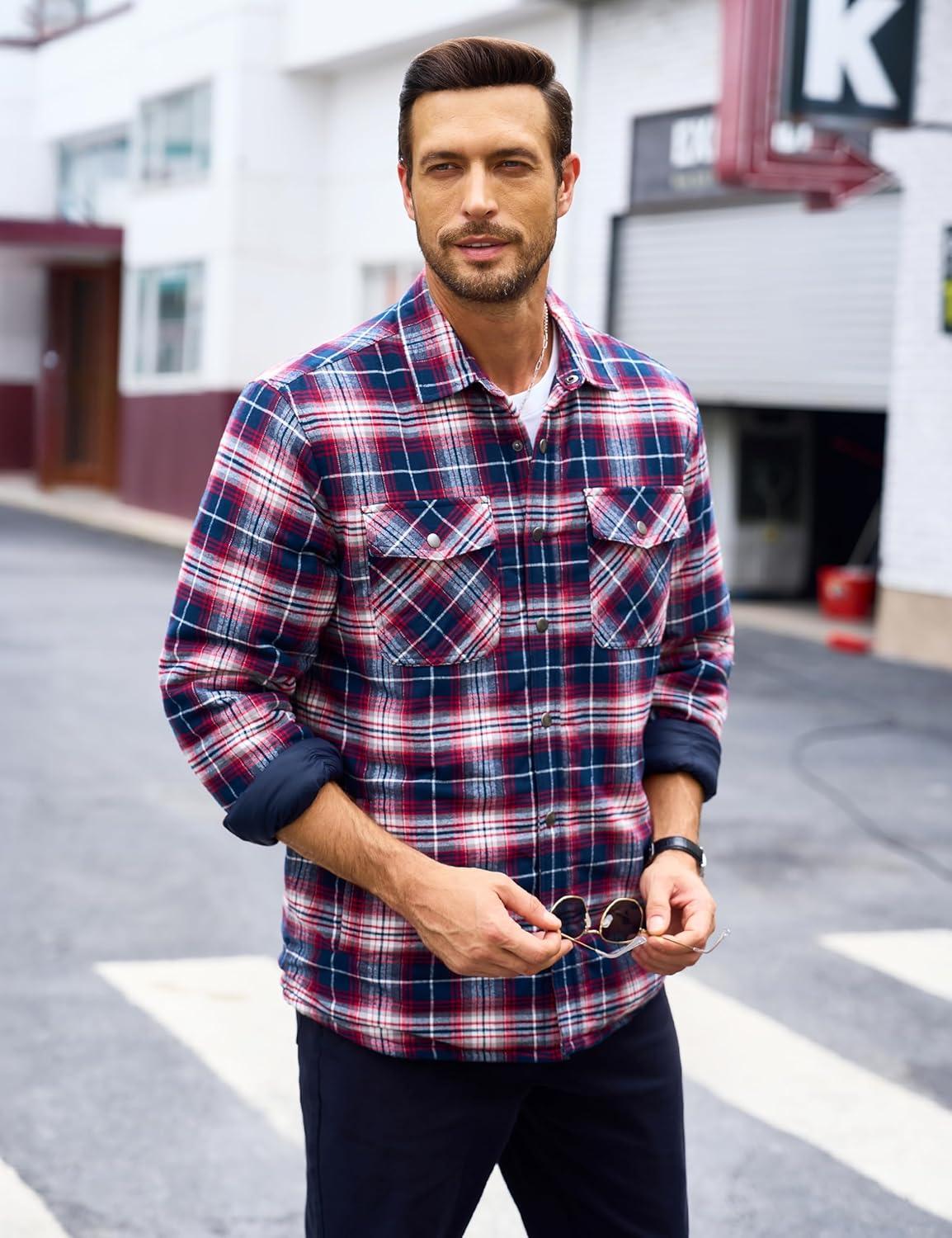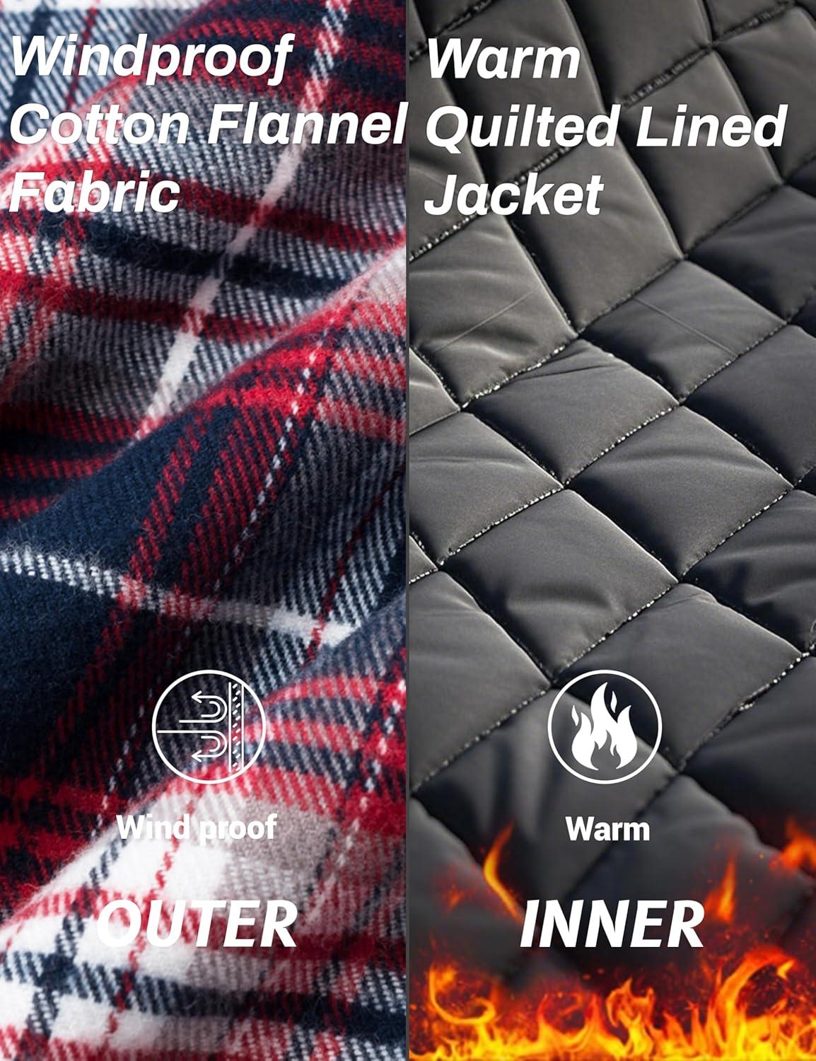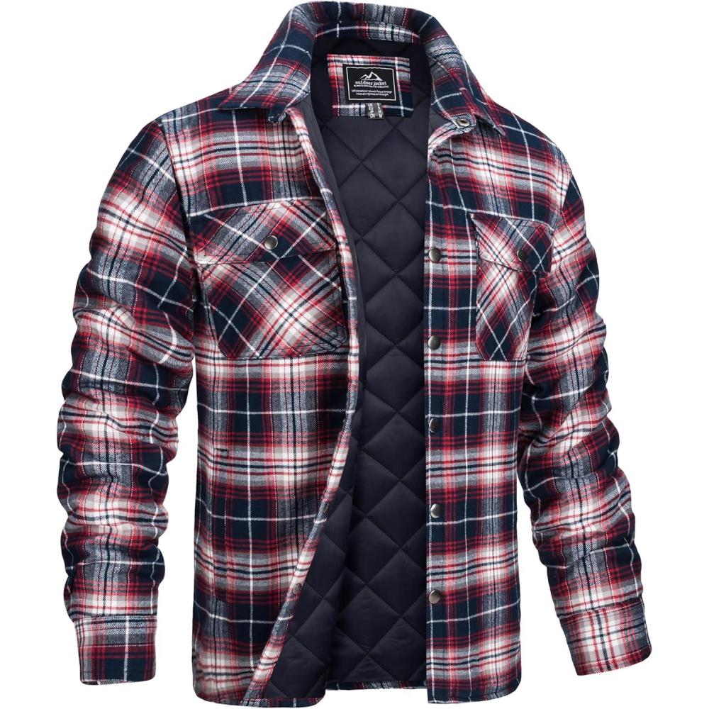 MAGCOMSEN Men’s Flannel Shirts Long Sleeve Quilted Lined Button Down Plaid Flannel Jacket Heavyweight Warm Winter Coat(Red)