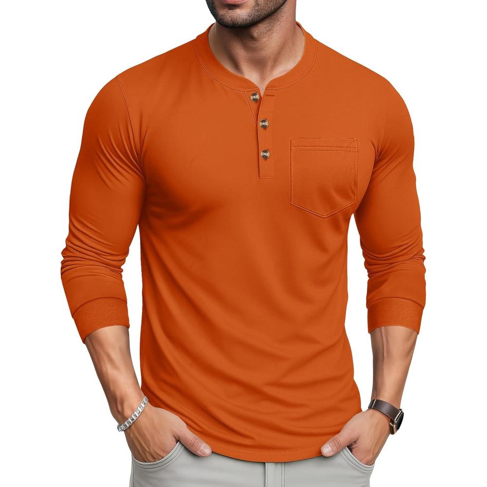 MAGCOMSEN Men’s Henley Long Sleeve Shirt Cotton Lightweight Tee Shirts Casual Basic Tees with Pocket(Dark Orange)
