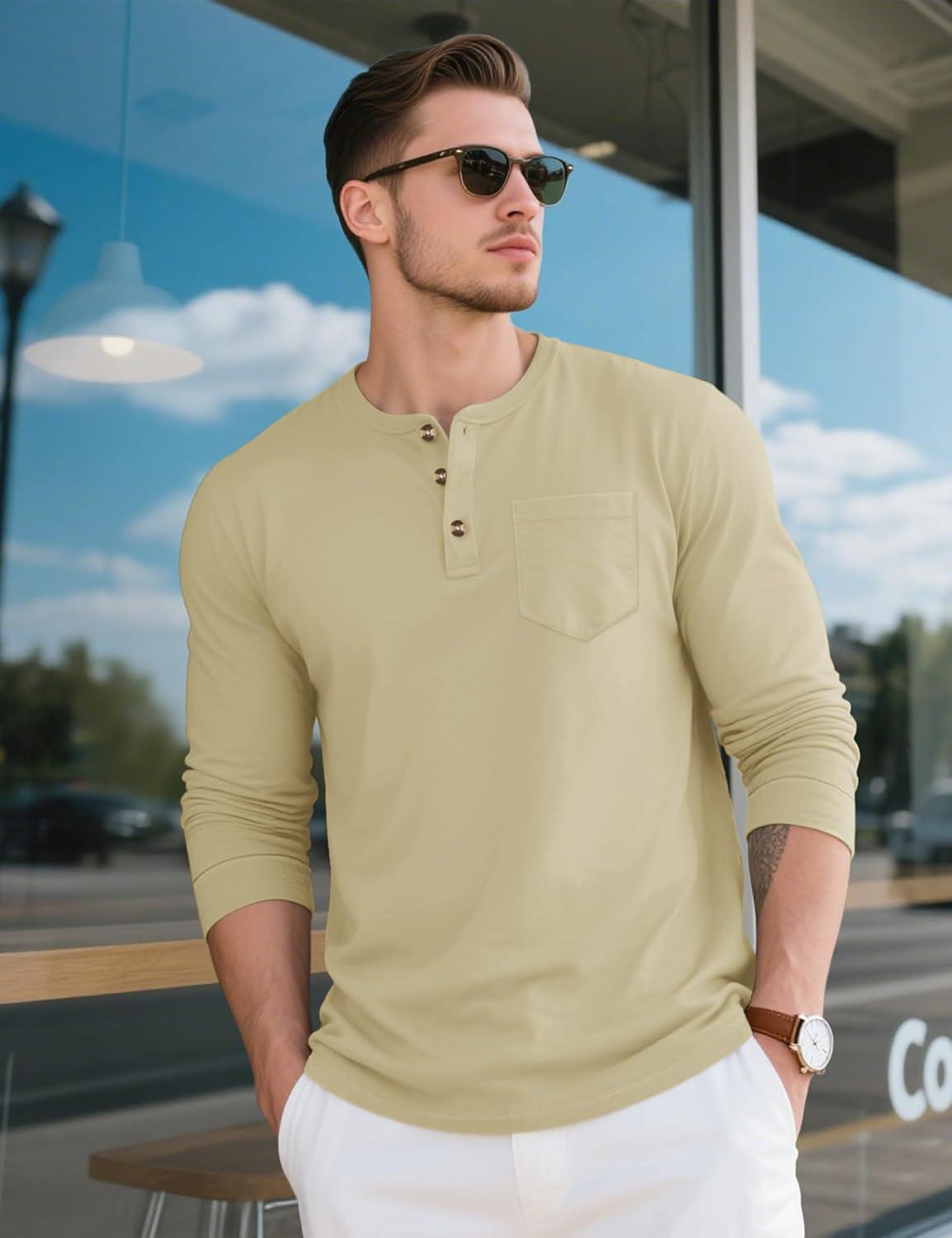 MAGCOMSEN Men’s Henley Long Sleeve Shirt Cotton Lightweight Tee Shirts Casual Basic Tees with Pocket(Khaki)