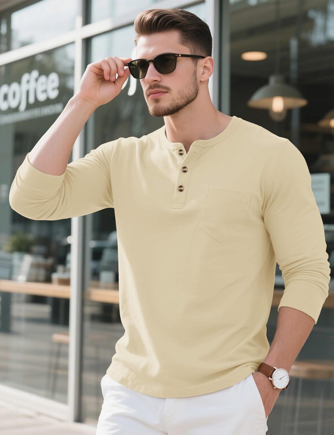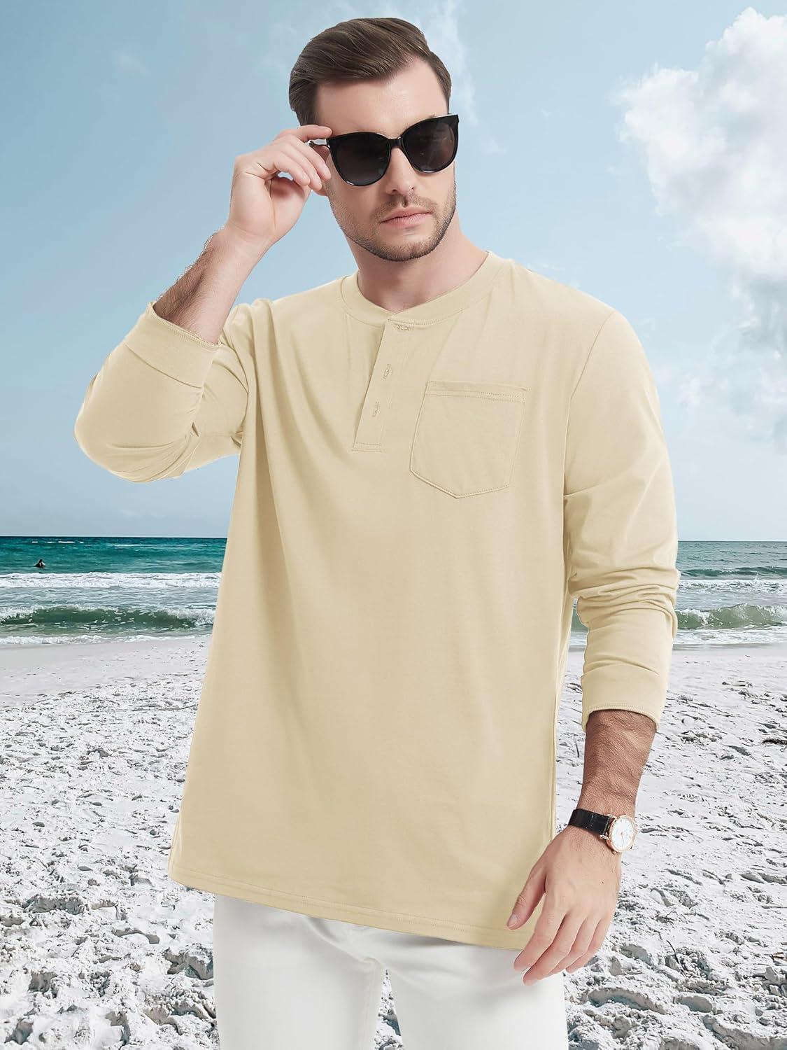 MAGCOMSEN Men’s Henley Long Sleeve Shirt Cotton Lightweight Tee Shirts Casual Basic Tees with Pocket(Light Apricot)