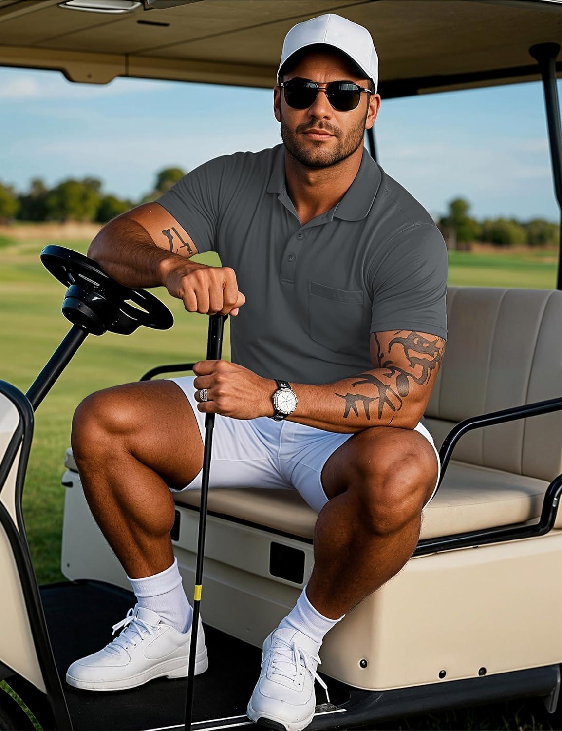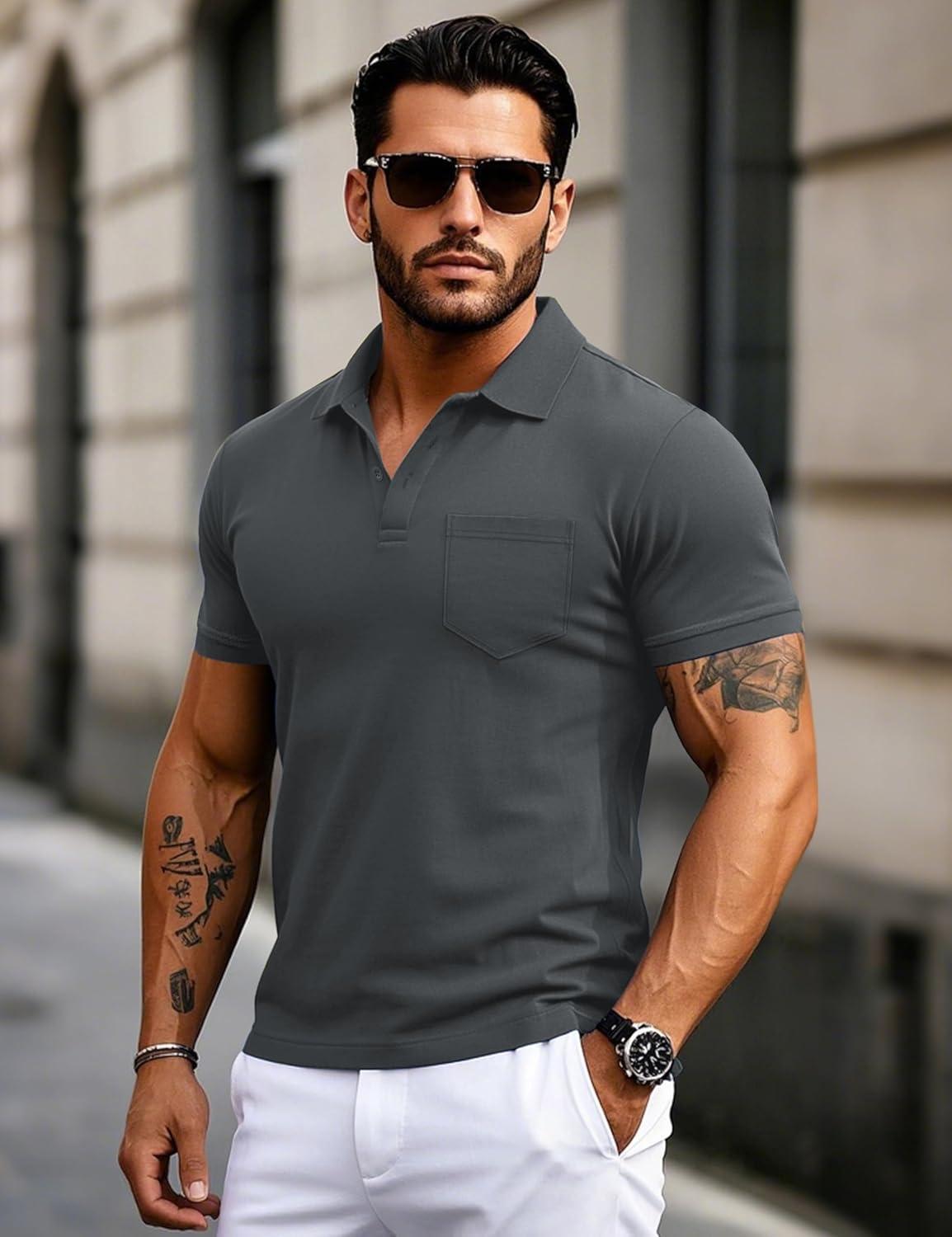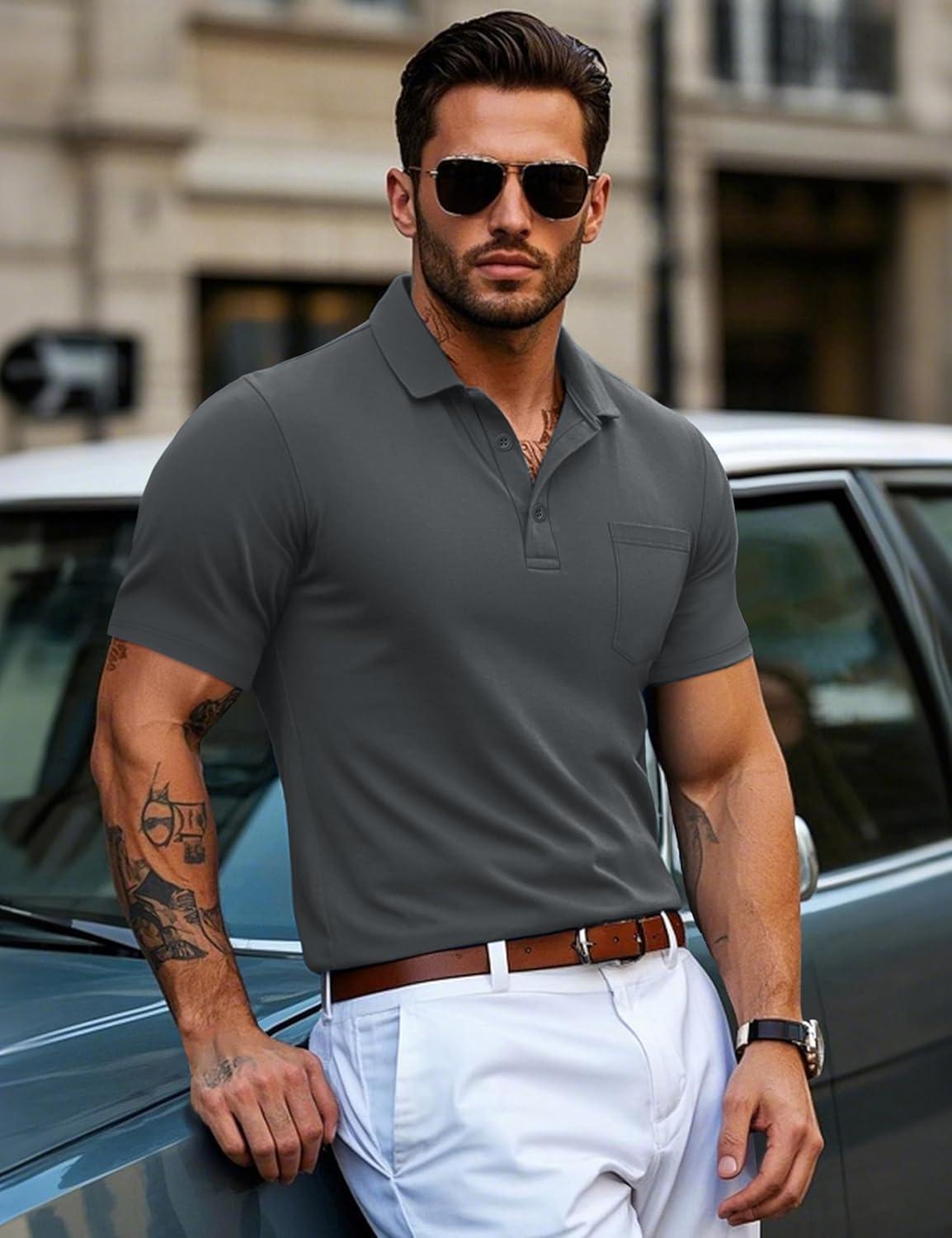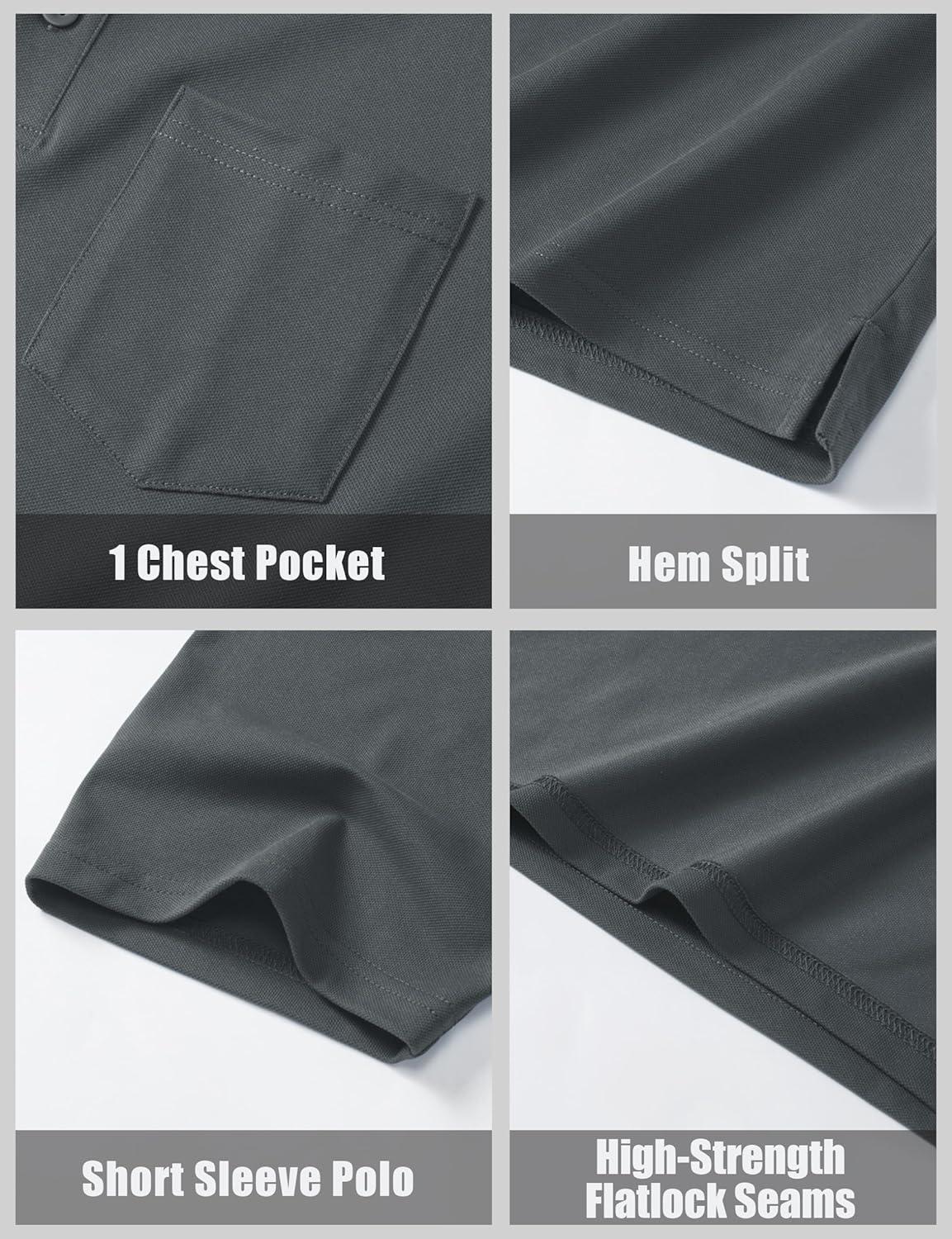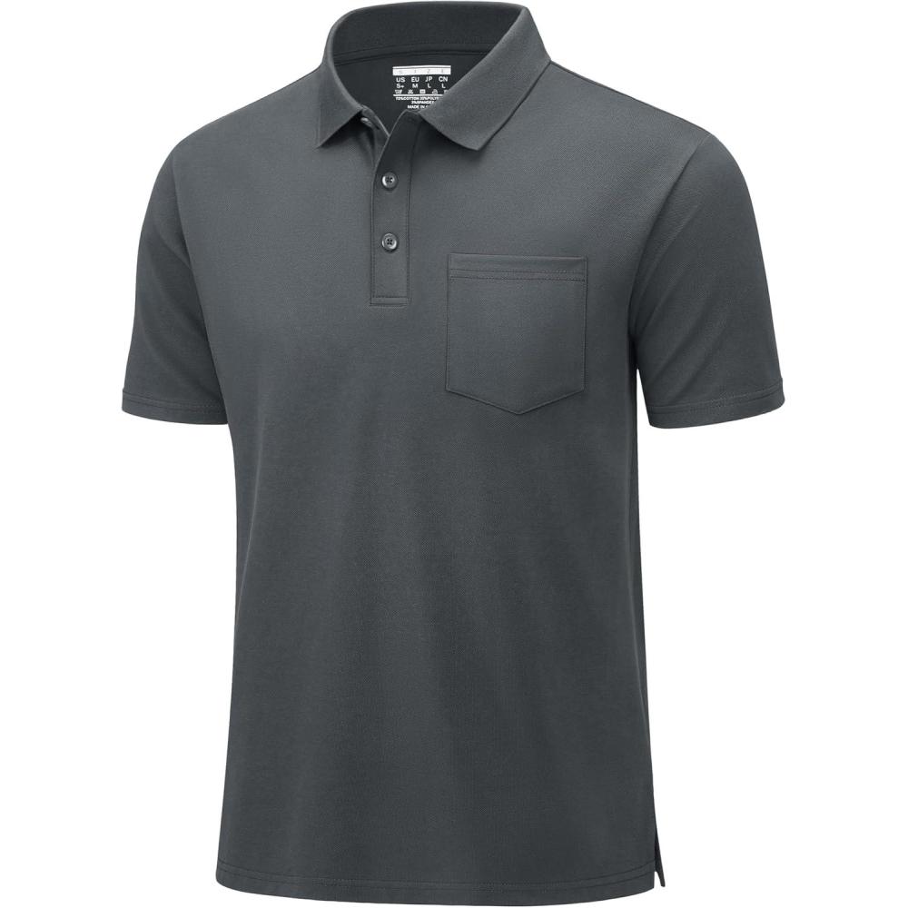 MAGCOMSEN Mens Polo Shirts Short Sleeve Cotton Pique Golf Shirts with Pocket Casual Performance Moisture Wicking Polos Dark Grey L