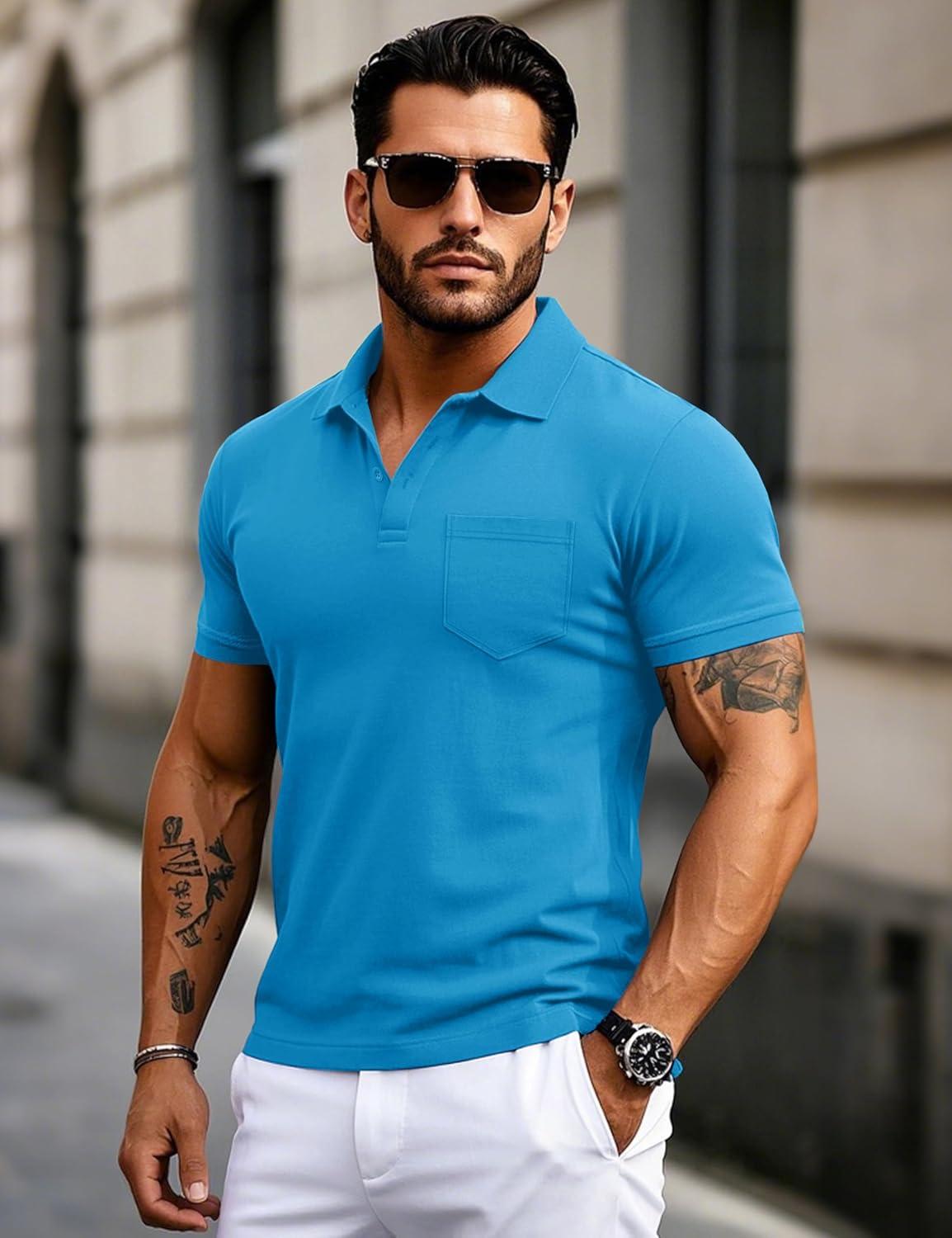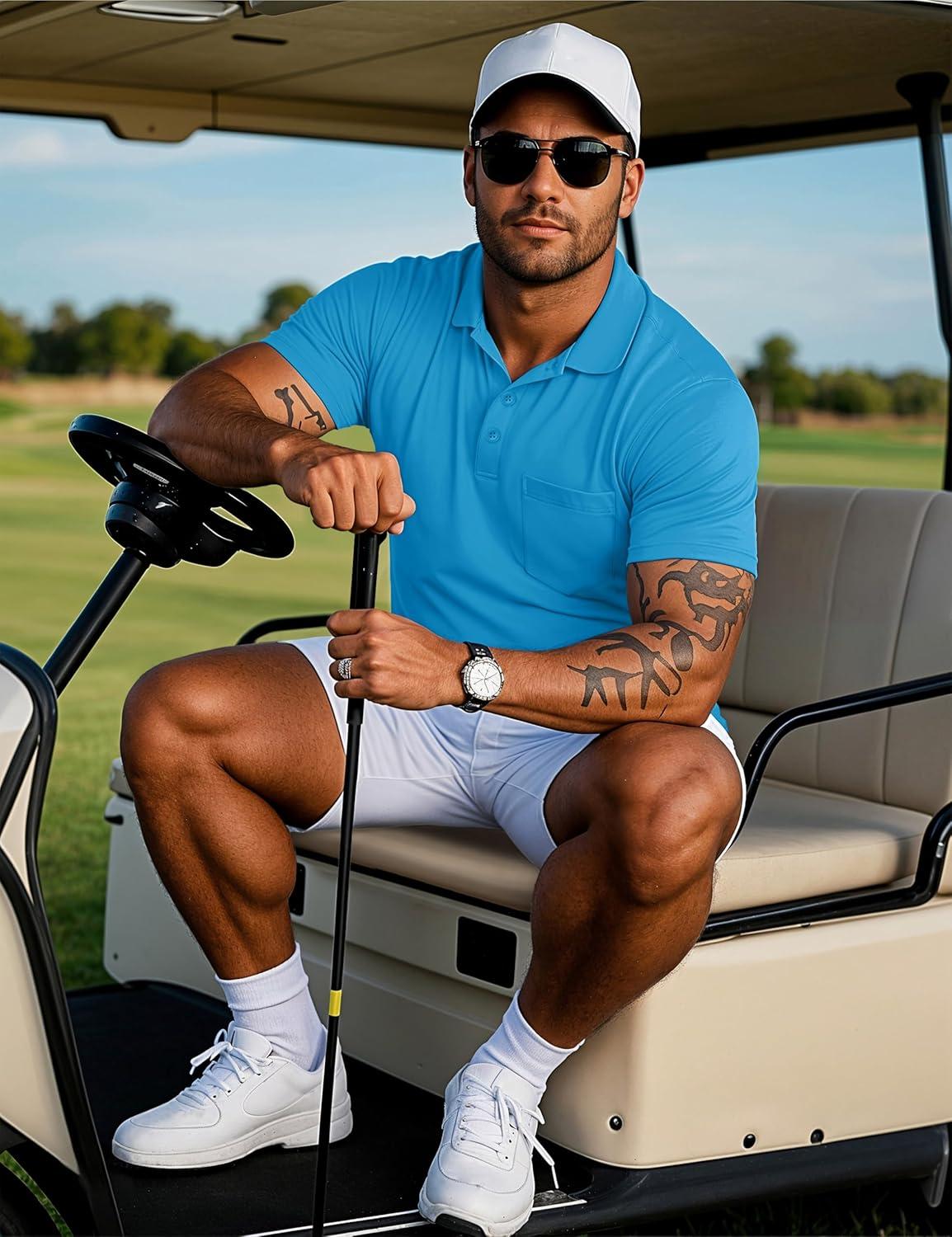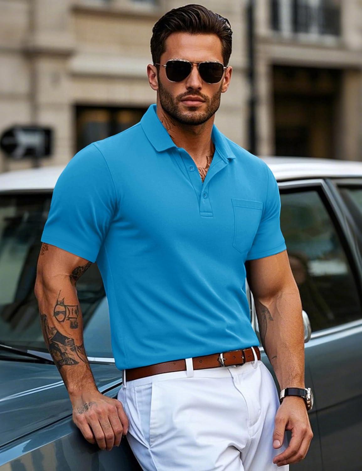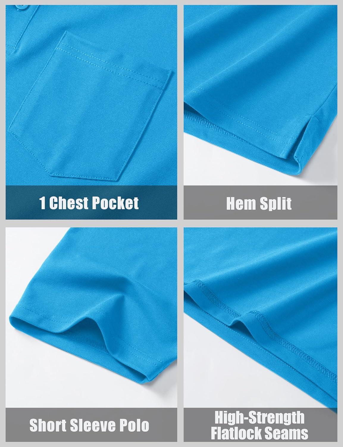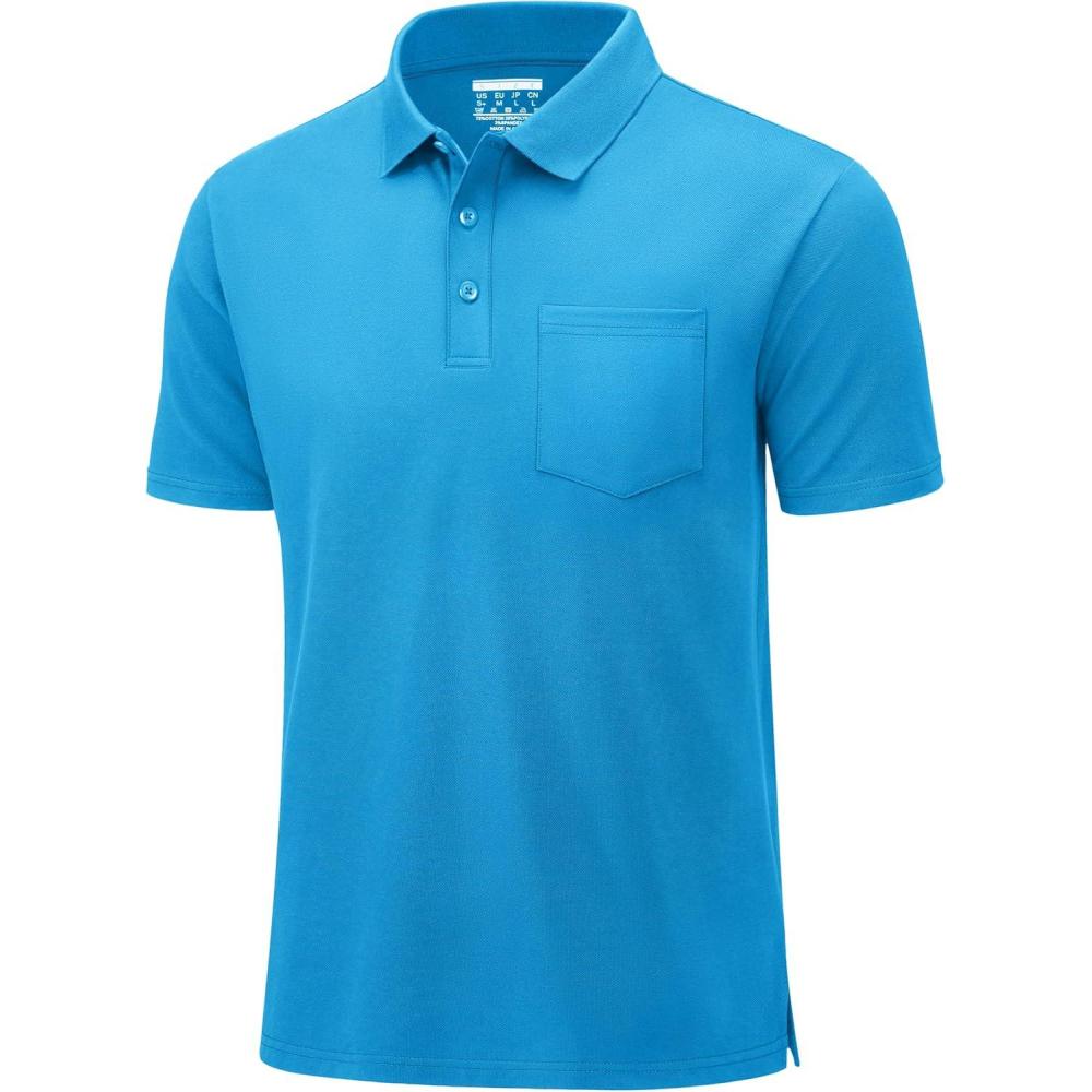 MAGCOMSEN Mens Polo Shirts Short Sleeve Cotton Pique Golf Shirts with Pocket Casual Performance Moisture Wicking Polos(Azure)