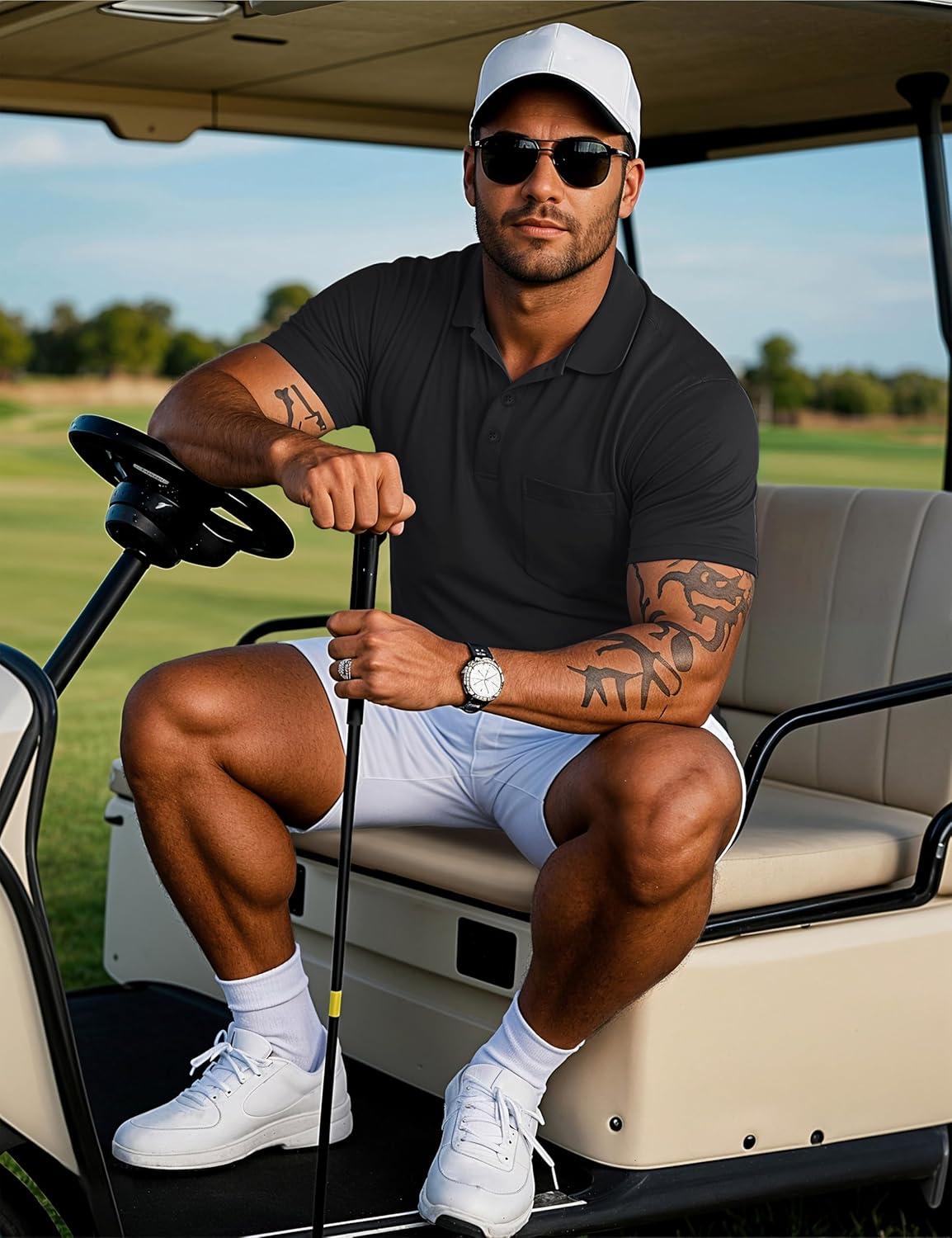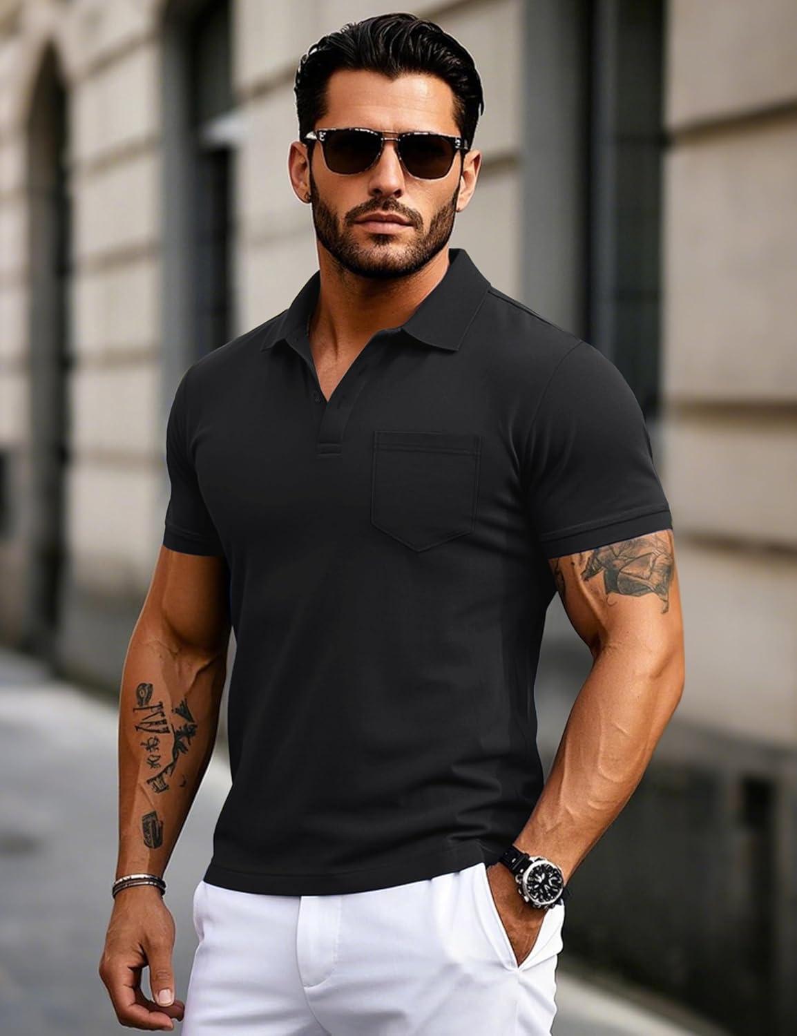 MAGCOMSEN Mens Polo Shirts Short Sleeve Cotton Pique Golf Shirts with Pocket Casual Performance Moisture Wicking Polos(Black)