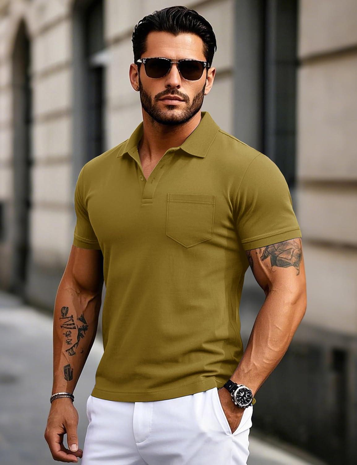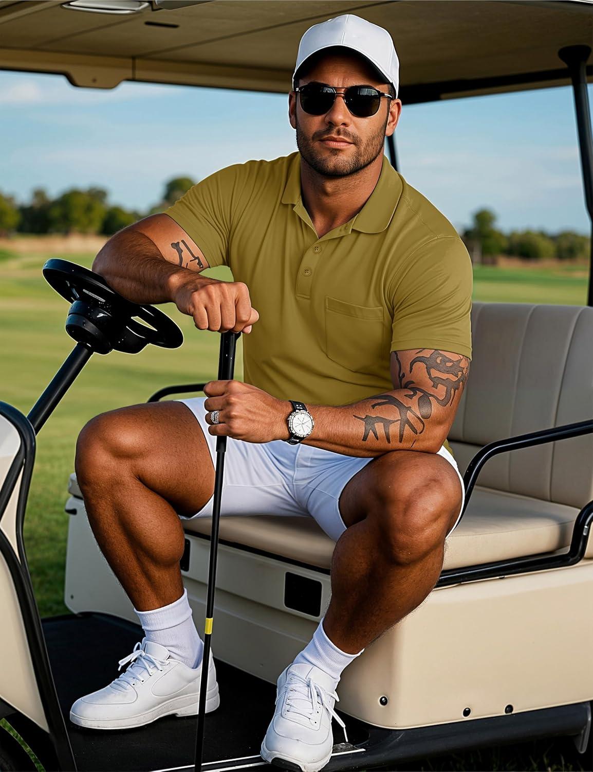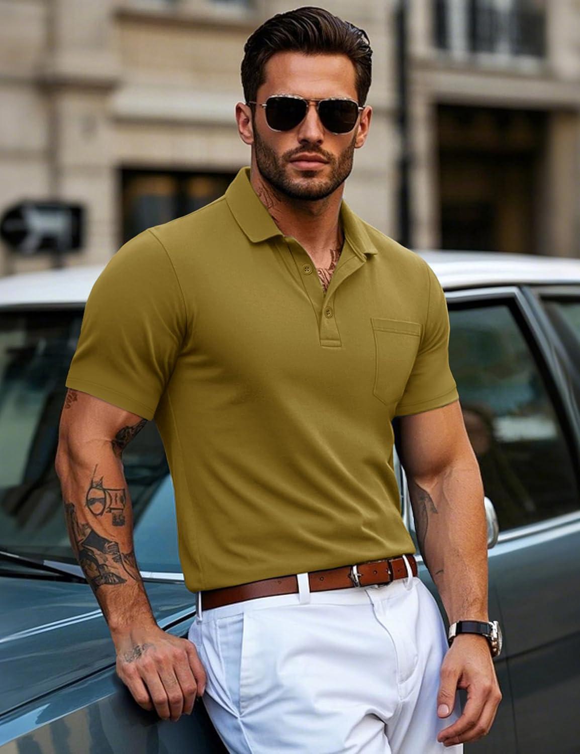 MAGCOMSEN Mens Polo Shirts Short Sleeve Cotton Pique Golf Shirts with Pocket Casual Performance Moisture Wicking Polos(Brown)
