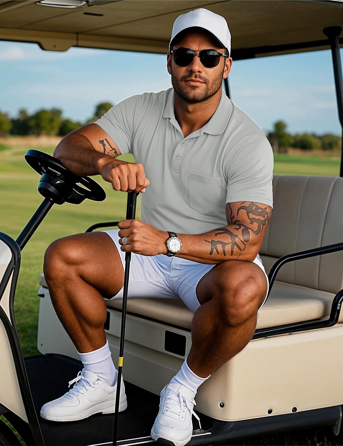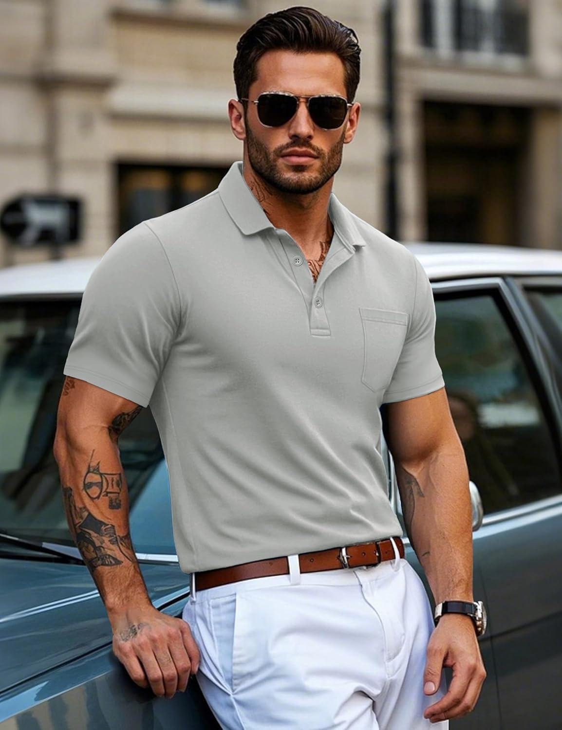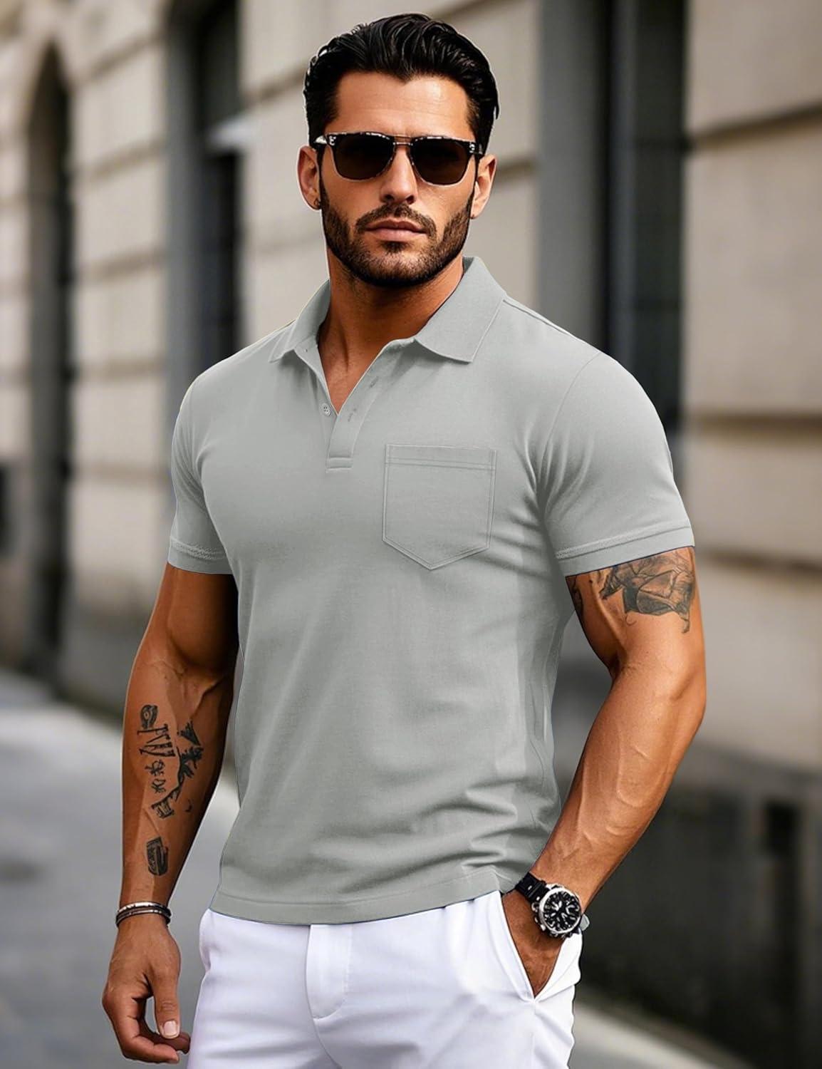 MAGCOMSEN Mens Polo Shirts Short Sleeve Cotton Pique Golf Shirts with Pocket Casual Performance Moisture Wicking Polos(Lite Gray)