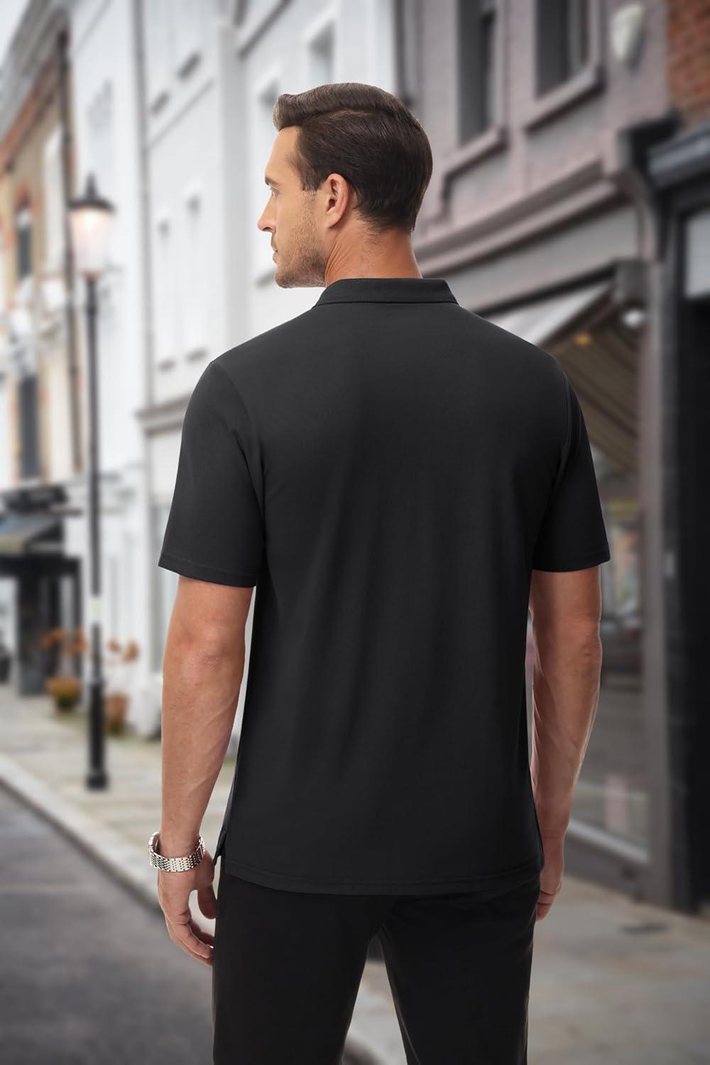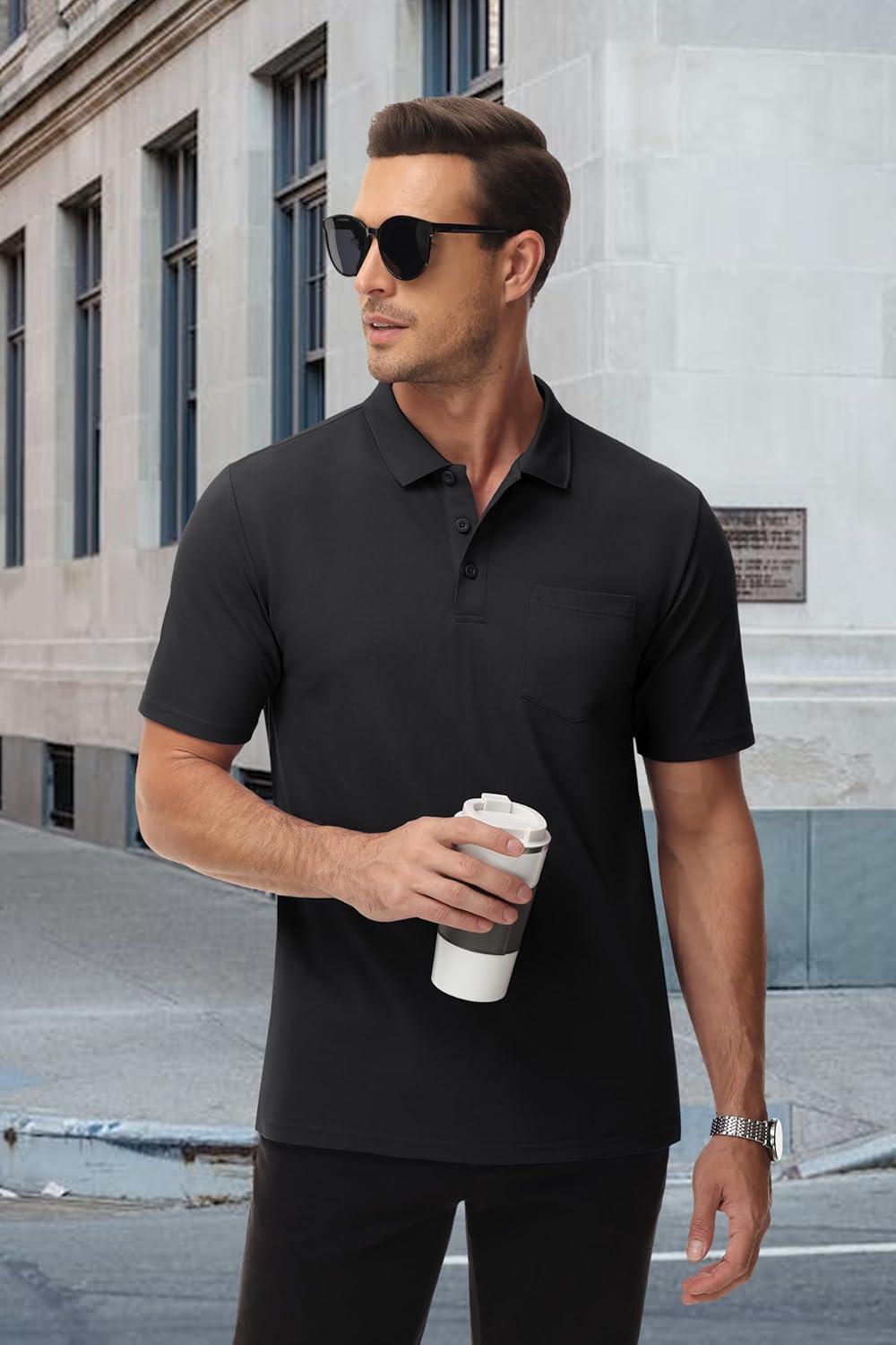 MAGCOMSEN Mens Polo Shirts with Pocket Cotton Pique Short Sleeve Collared Shirt Moisture Wicking Golf Shirts 3-Button Shirts(Black)