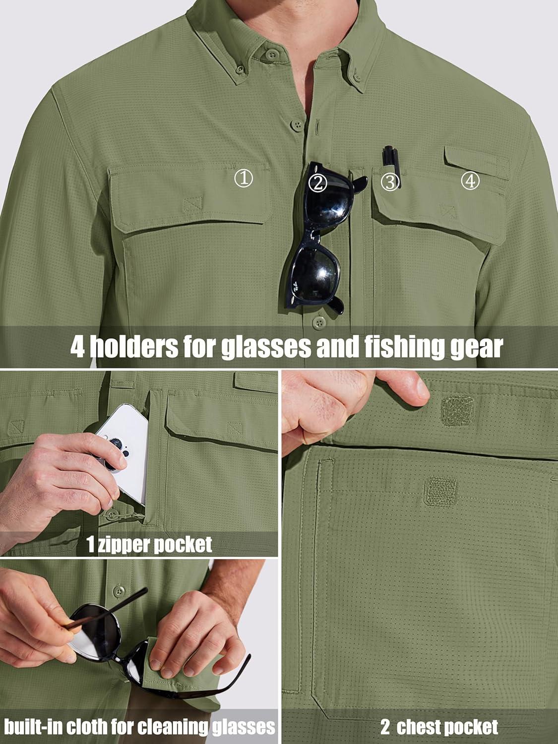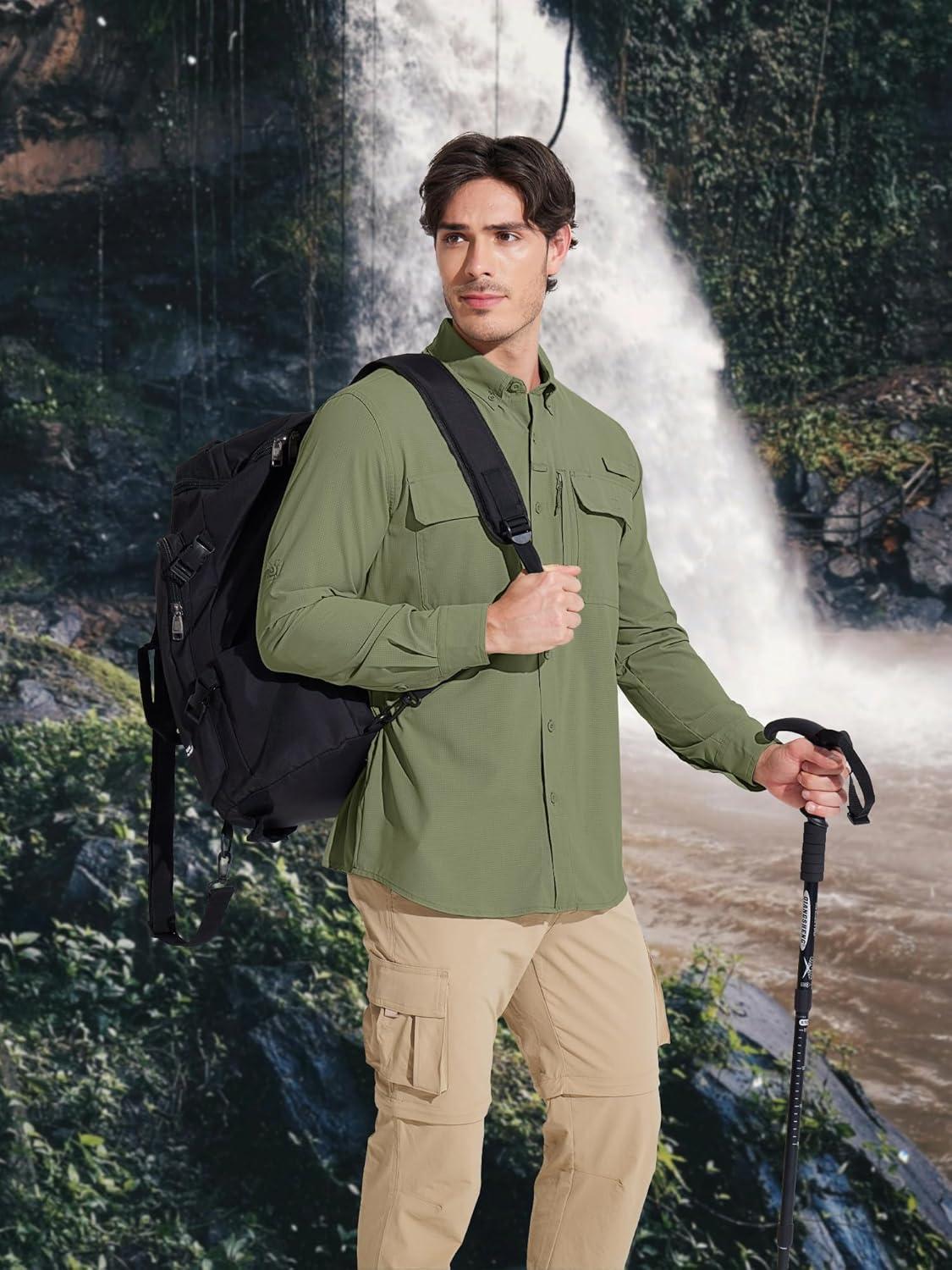 MAGCOMSEN Men’s Sun Protection Fishing Shirts Long Sleeve UPF 50+ Quick Dry Cooling Button Down Shirt for Hiking Safari(Light Green)