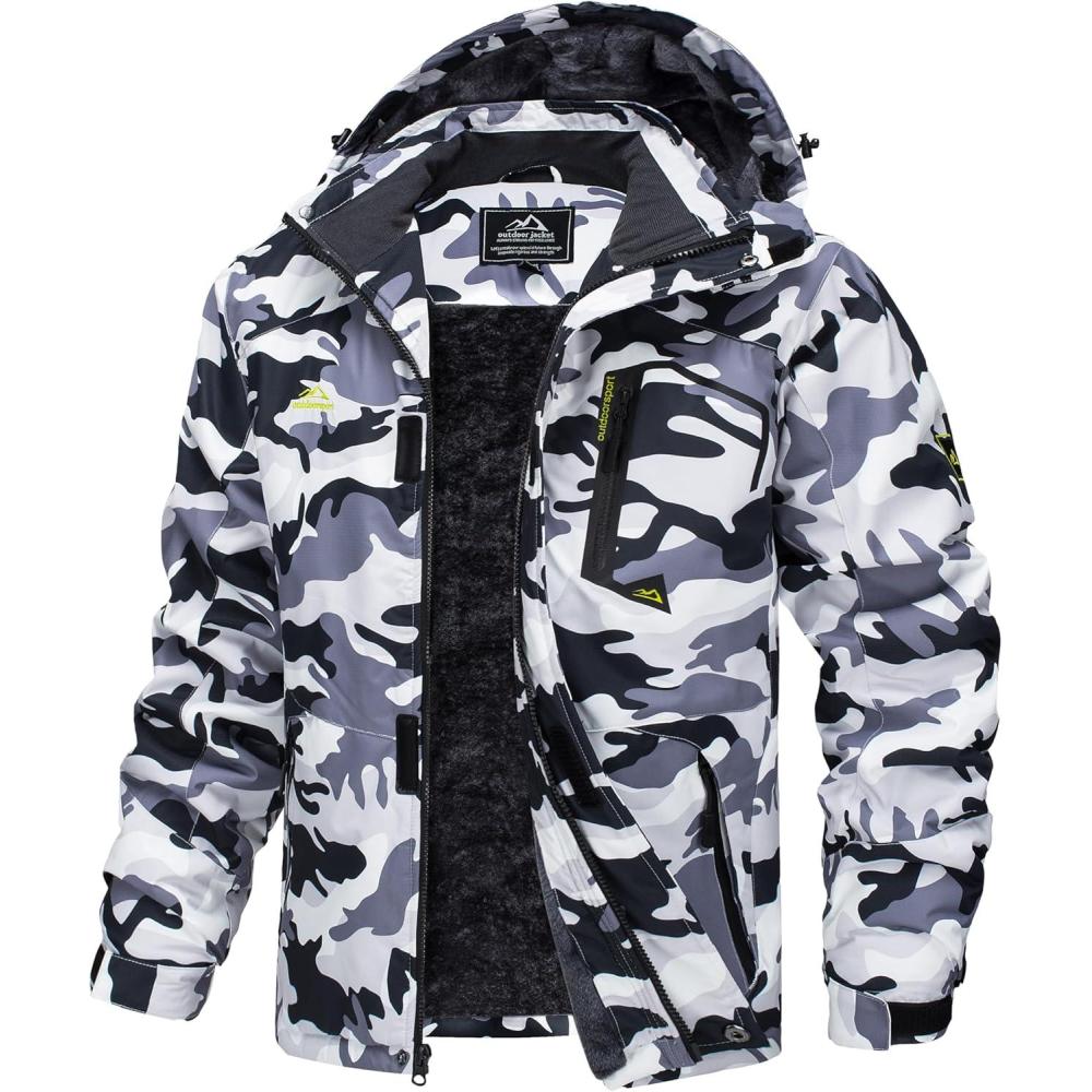 MAGCOMSEN Men’s Winter Coats Water Resistant Ski Snow Jacket Warm Fleece Jacket Parka Raincoats With Hood Multi-Pockets(Light Grey Camo)