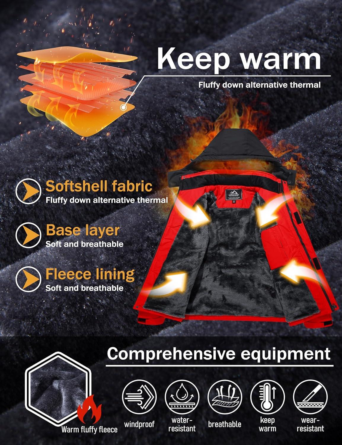 MAGCOMSEN Men’s Winter Coats Water Resistant Ski Snow Jacket Warm Fleece Jacket Parka Raincoats With Hood Multi-Pockets(Red)