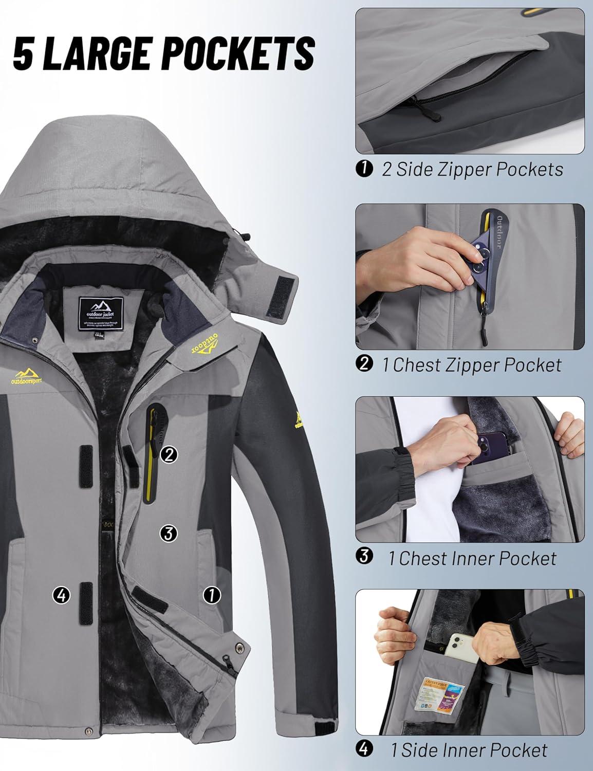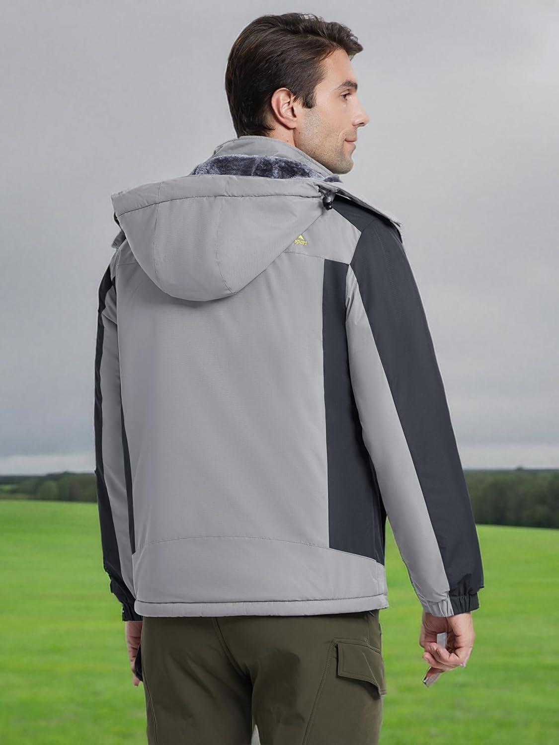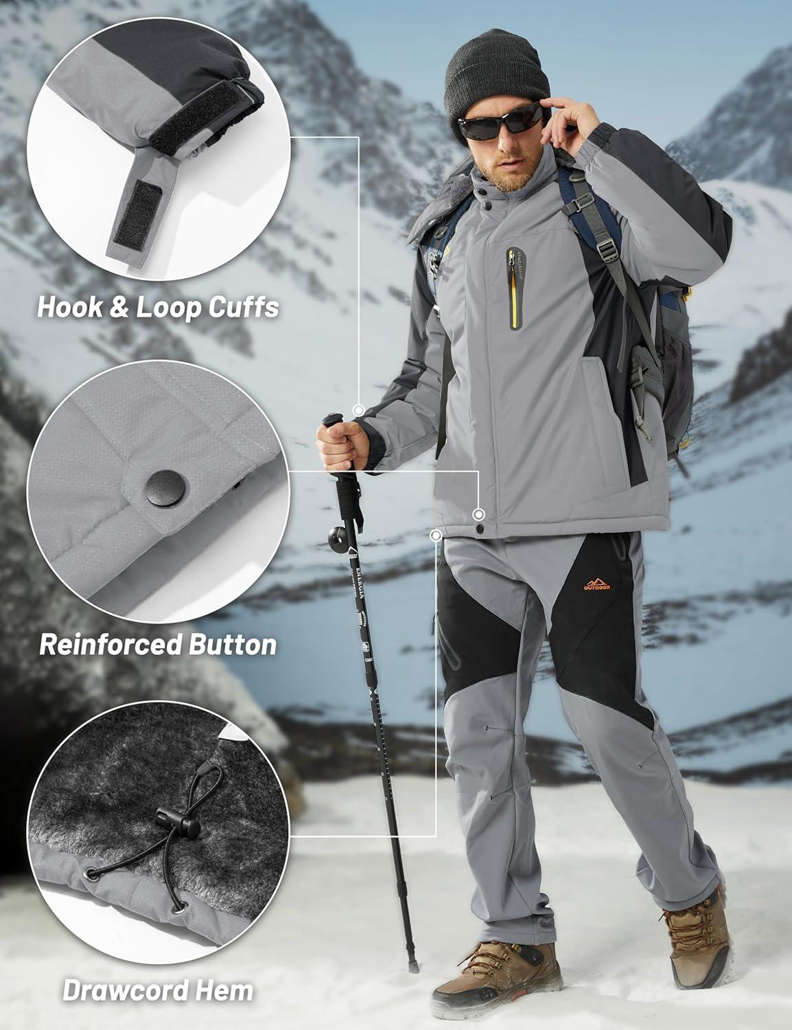 MAGCOMSEN Men’s Winter Jacket Ski Snow Waterproof Fleece Coats Snowboard Warm Parka Raincoats with Hood 5 Pockets(Light Grey)