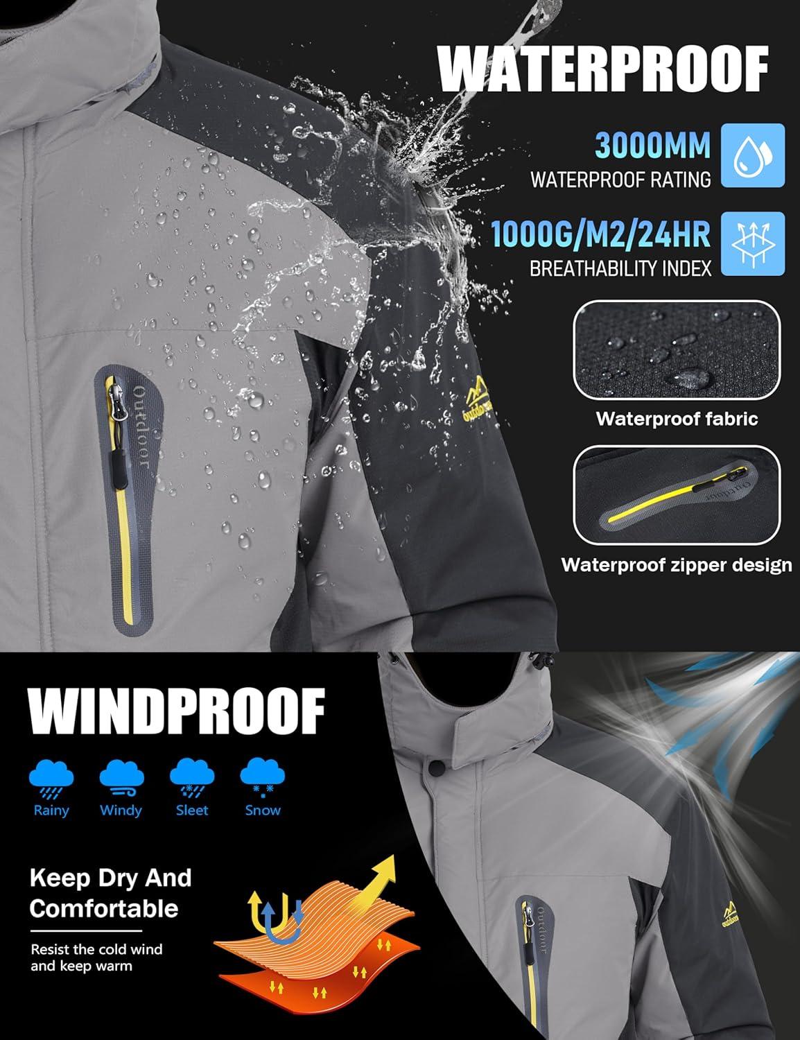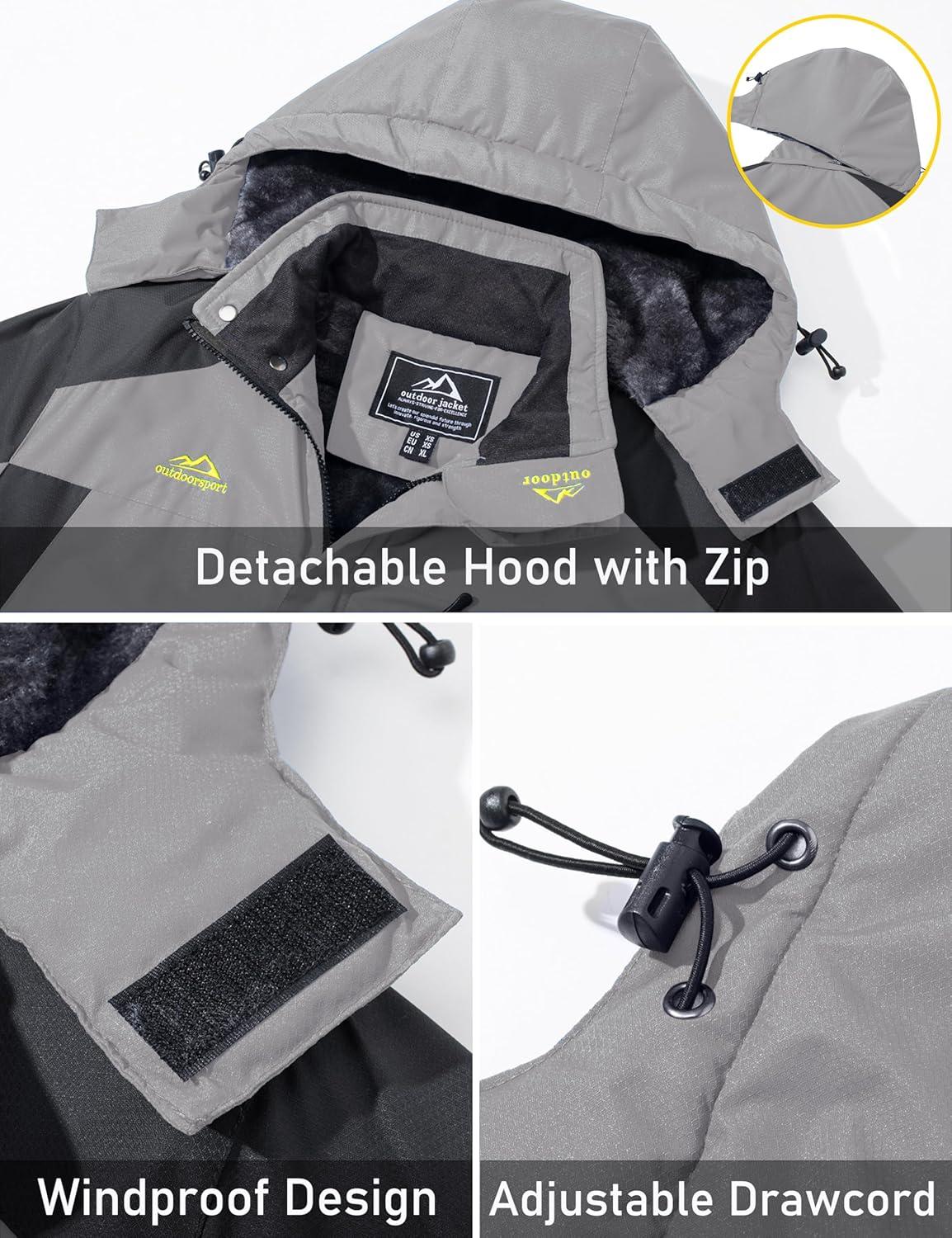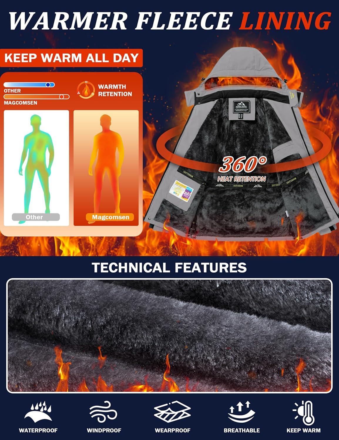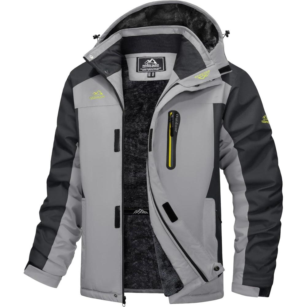 MAGCOMSEN Men’s Winter Jacket Ski Snow Waterproof Fleece Coats Snowboard Warm Parka Raincoats with Hood 5 Pockets(Light Grey)