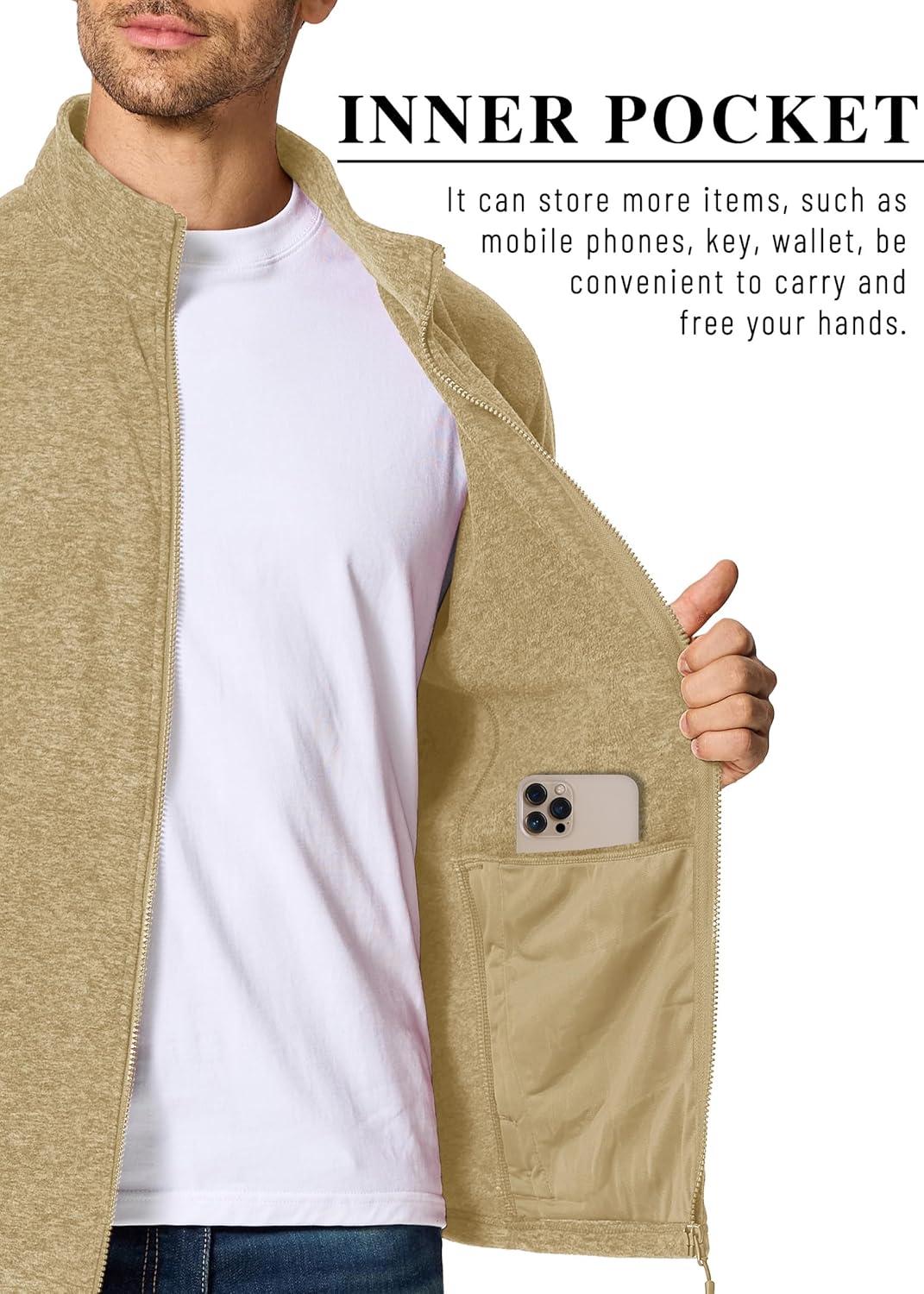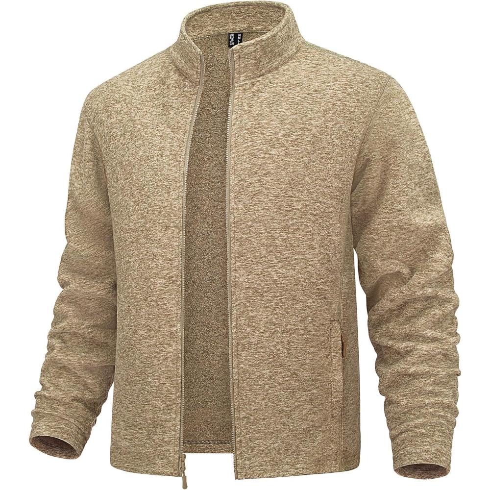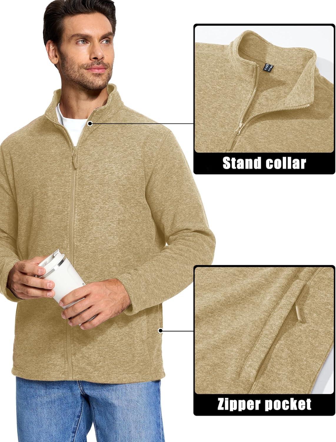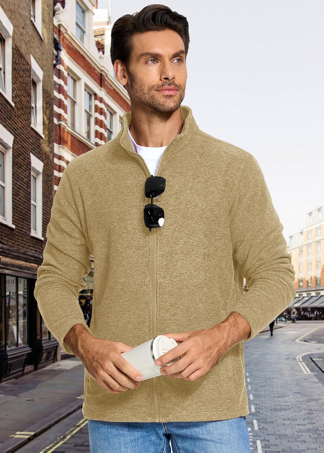 MAGCOMSEN Mens Zip Up Sweatshirt Casual Fleece Jacket with Zipper Pockets and Stand Collar(Khaki)