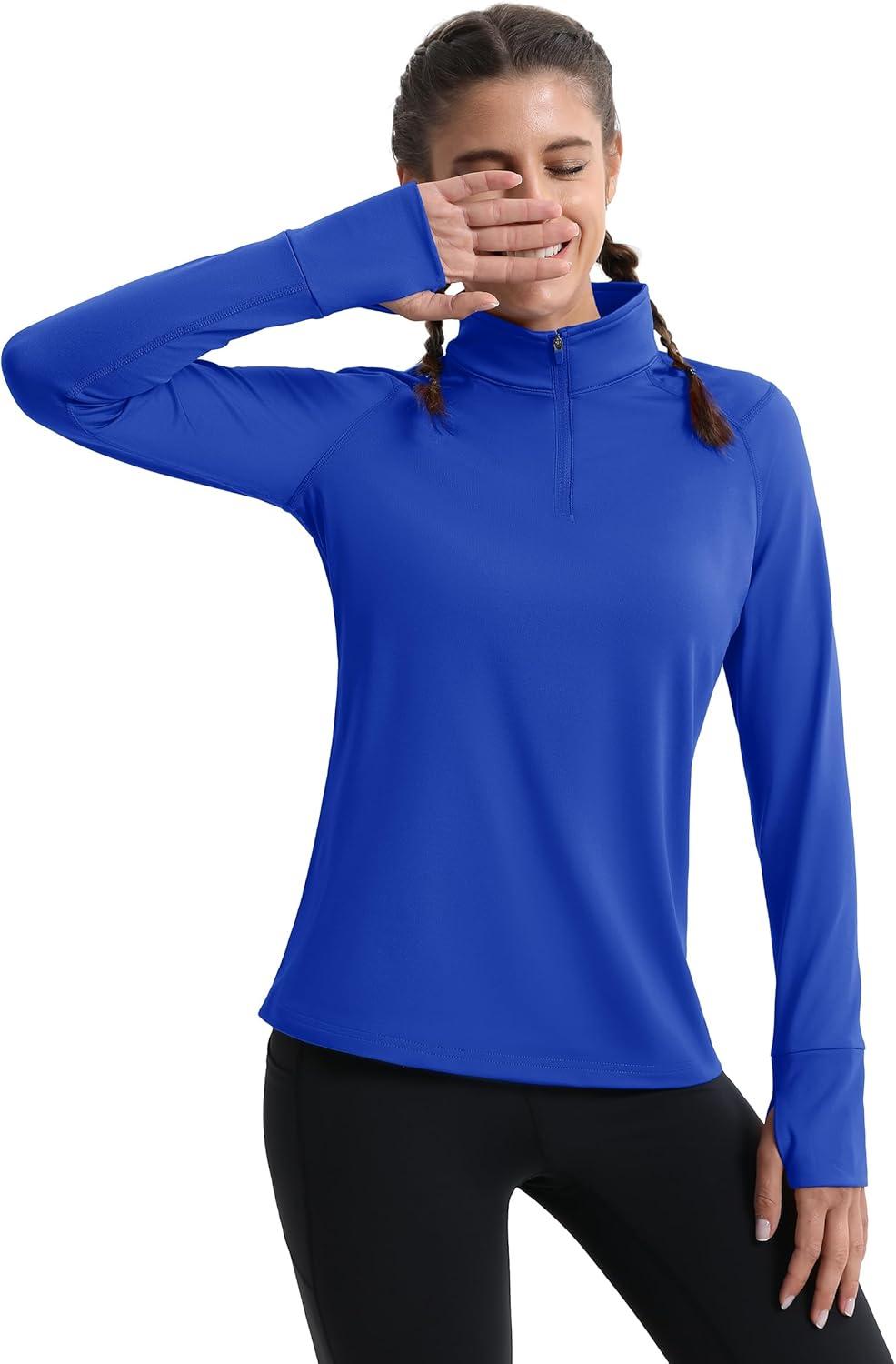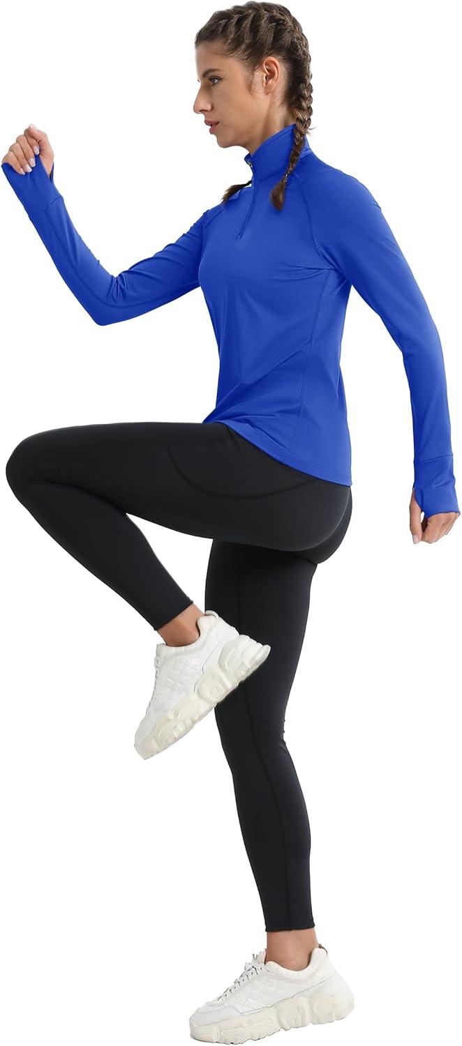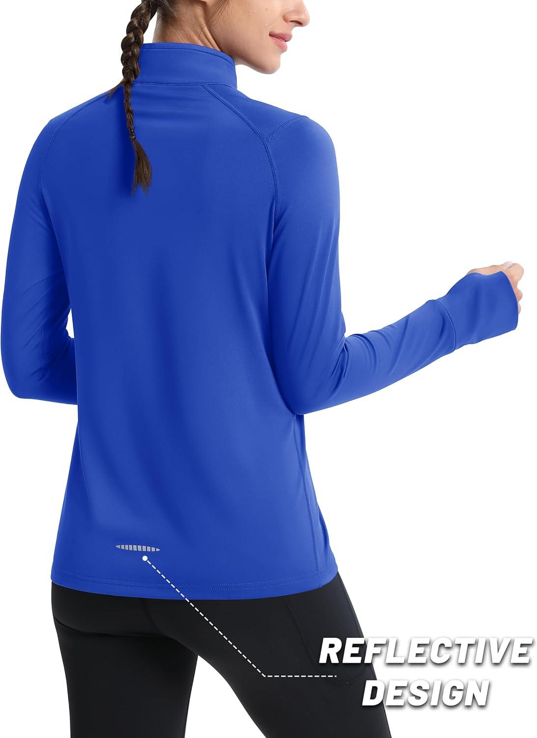 MAGCOMSEN Quarter Zip Pullover Women Fleece Shirt Thermal Long Sleeve Athletic Running Tops Thumb Hole(Coloured Blue)