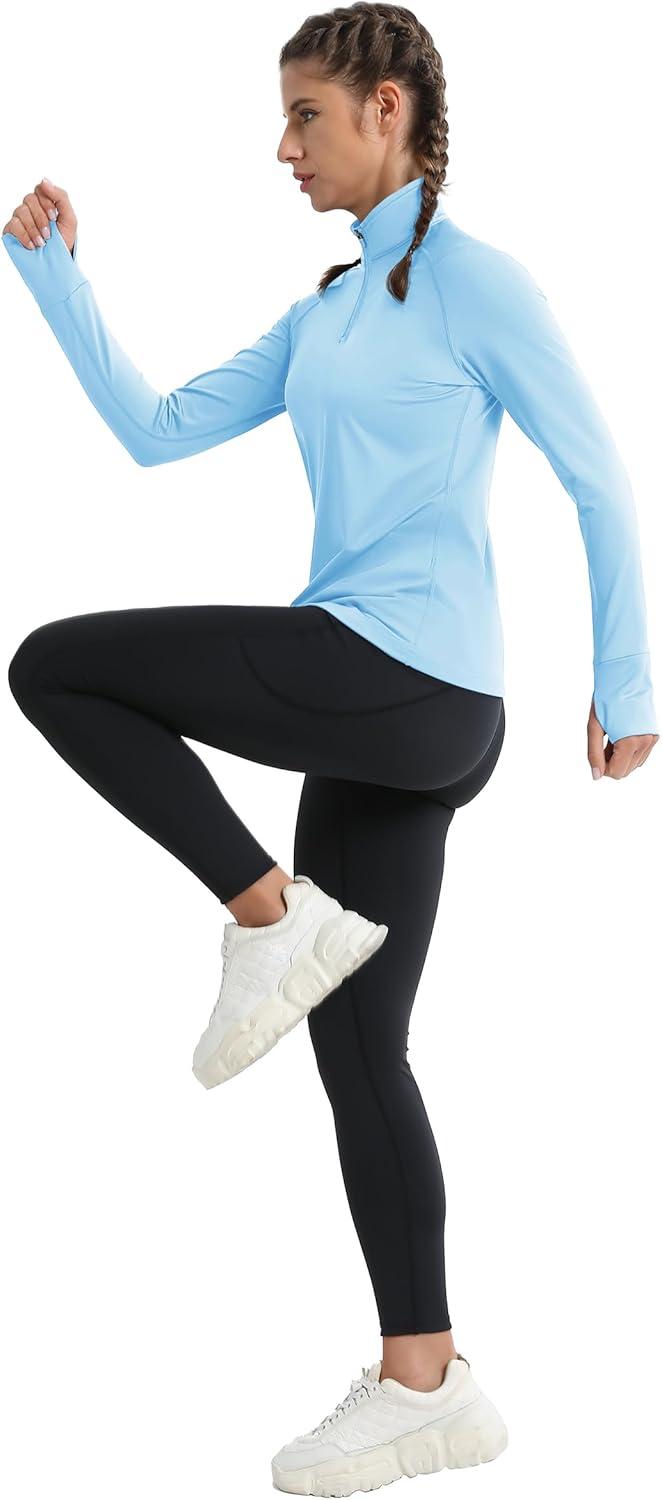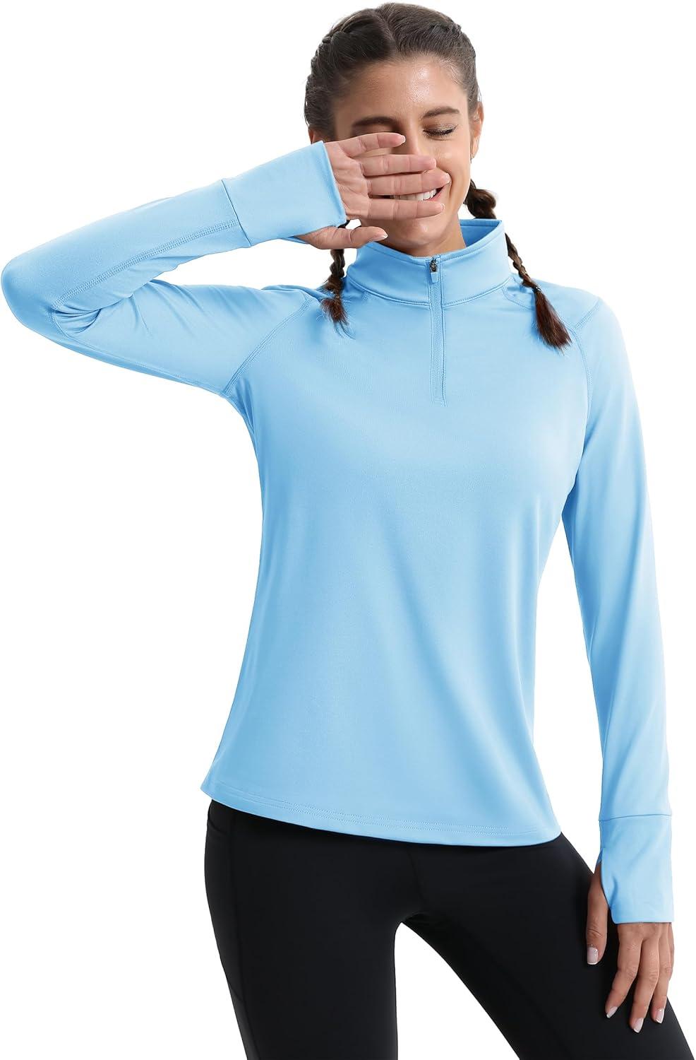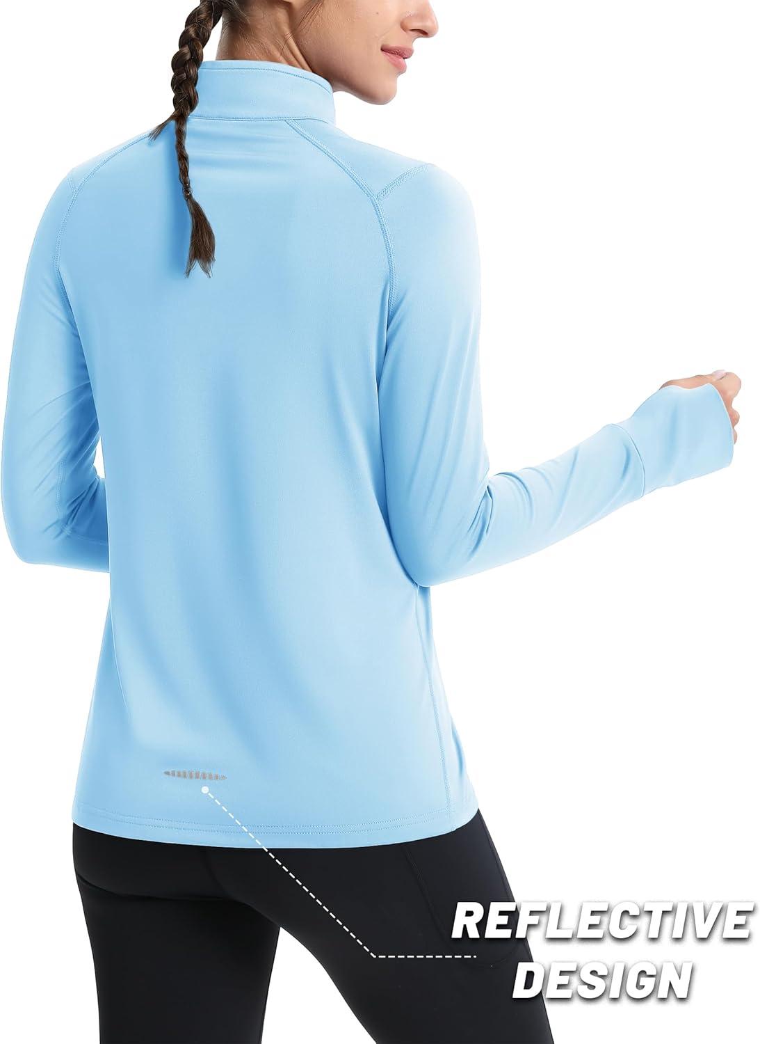MAGCOMSEN Quarter Zip Pullover Women Fleece Shirt Thermal Long Sleeve Athletic Running Tops Thumb Hole(Light Sky Blue)