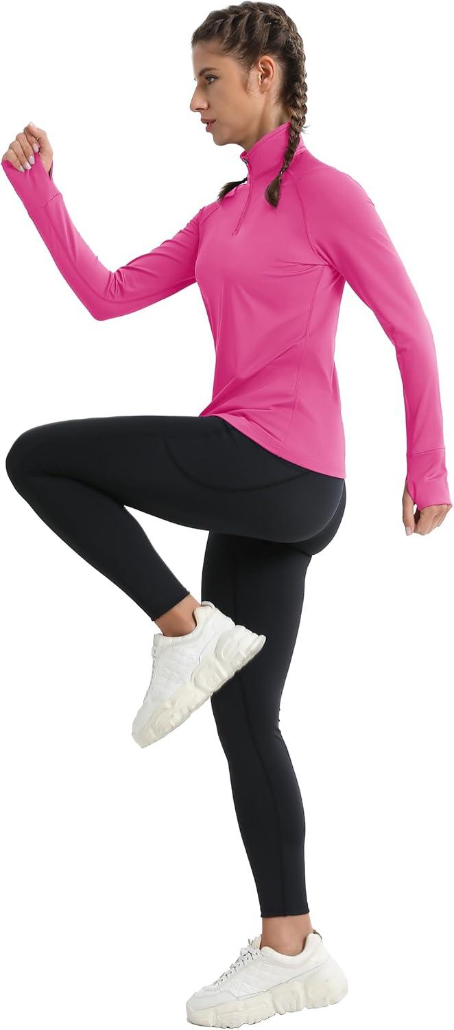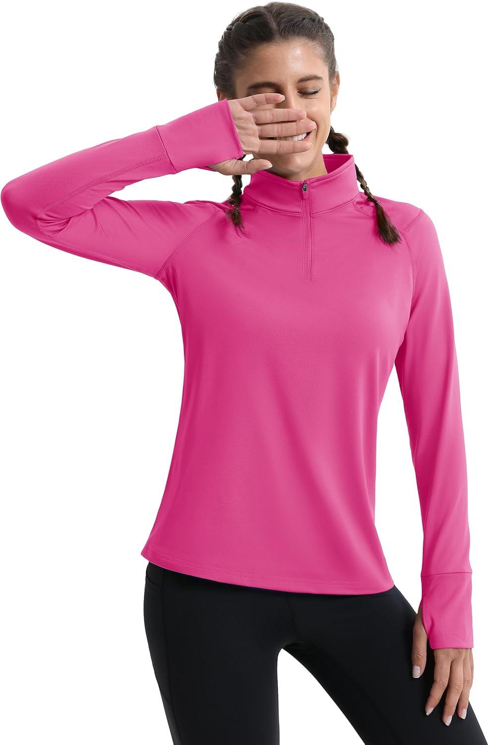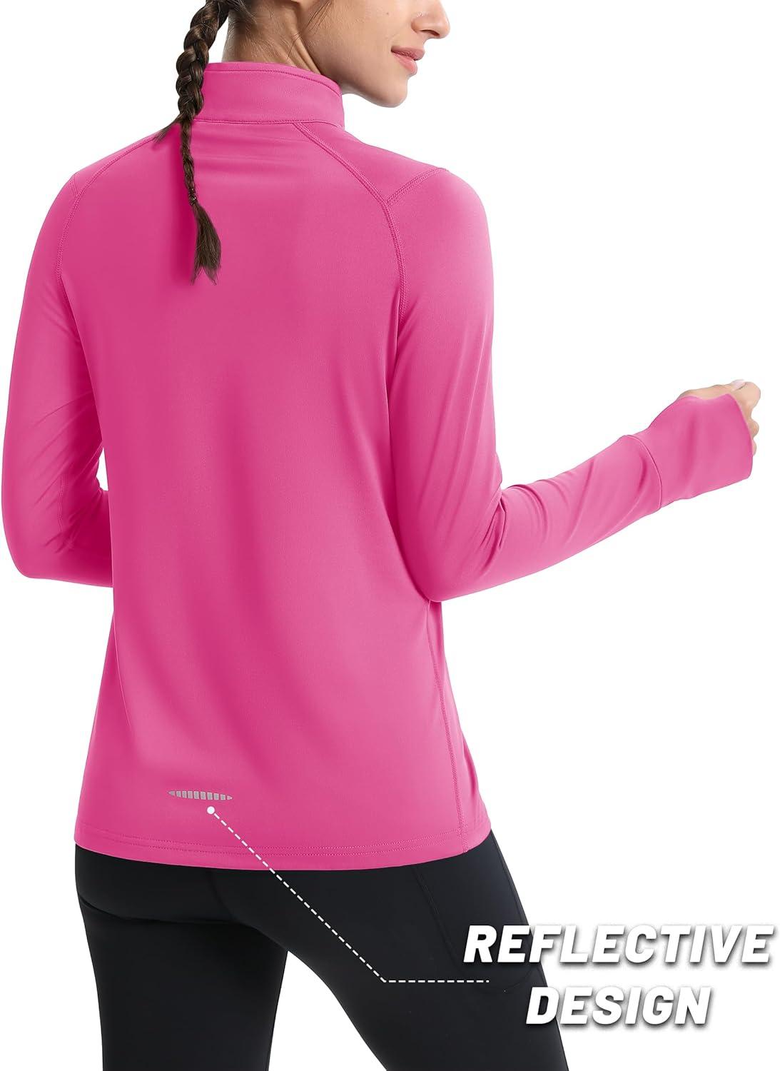 MAGCOMSEN Quarter Zip Pullover Women Fleece Shirt Thermal Long Sleeve Athletic Running Tops Thumb Hole(Rose Red)