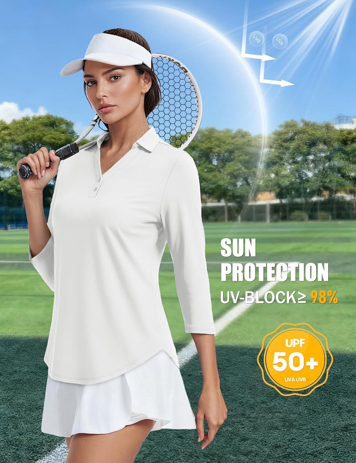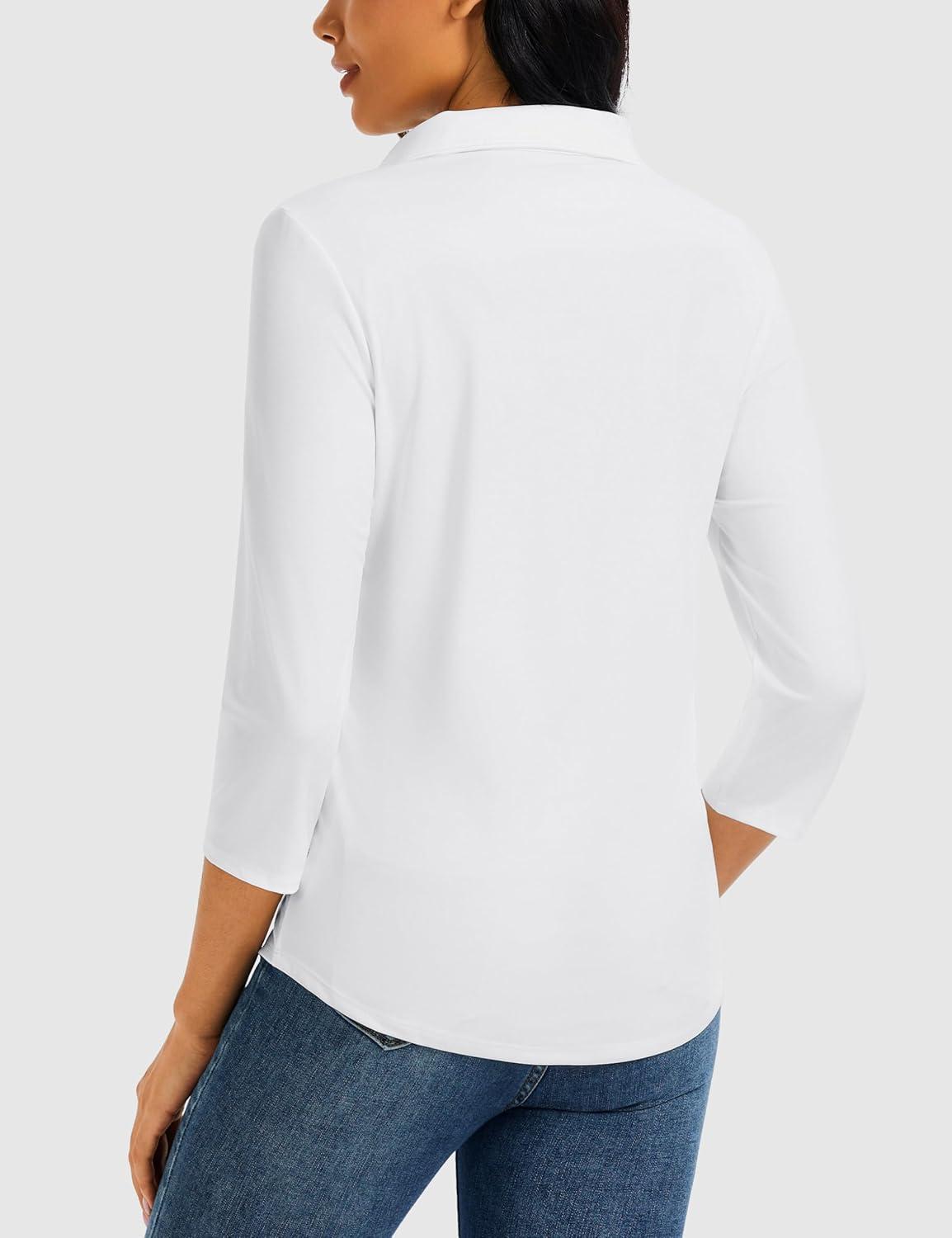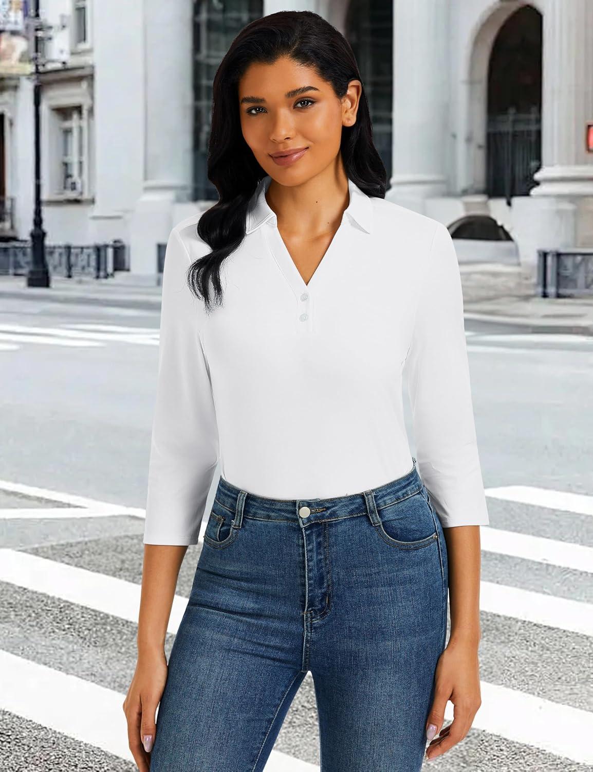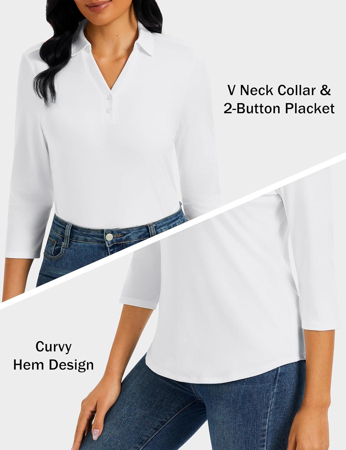 MAGCOMSEN Women’s 3/4 Long Sleeve Polo Shirts Collared V Neck Golf Shirts UPF 50+ Quick Dry Casual Work Tops(White)