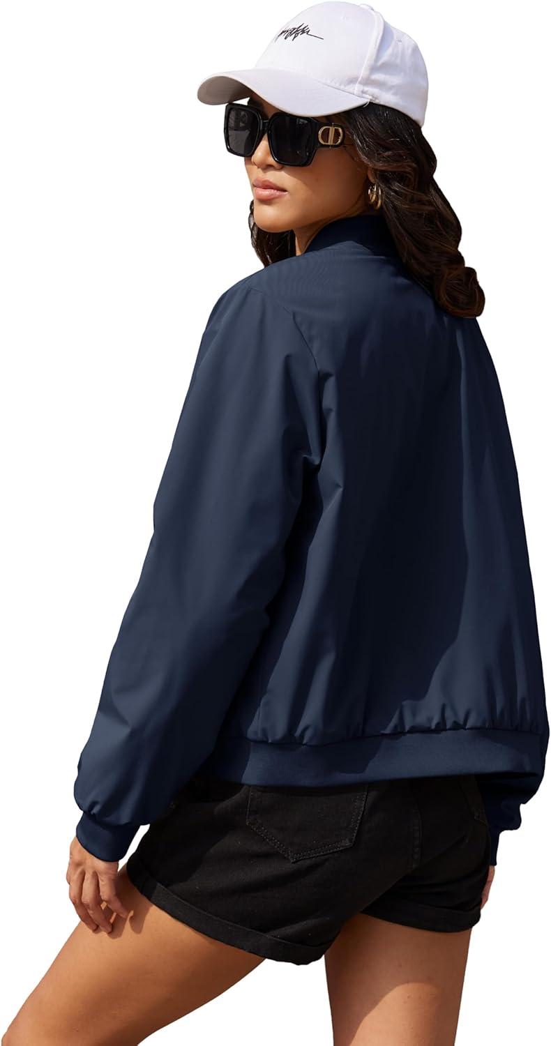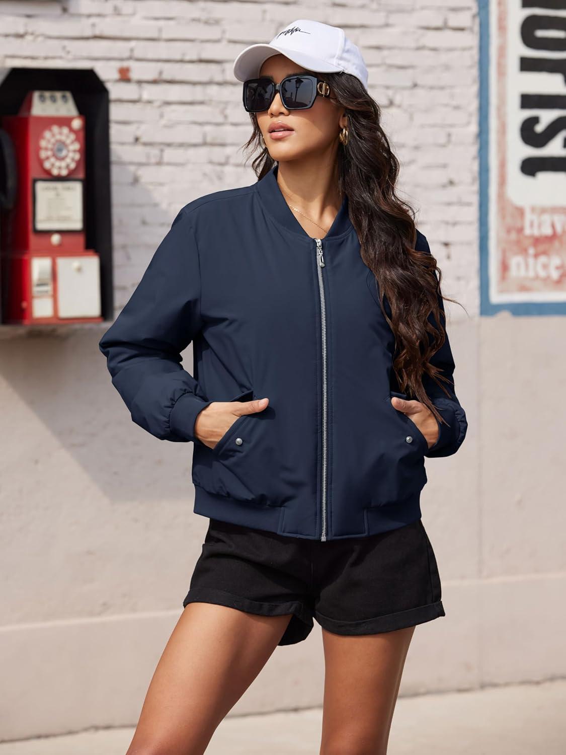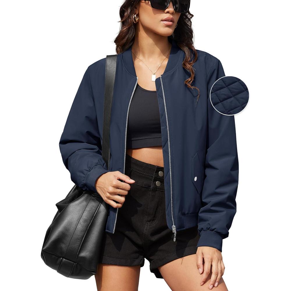 MAGCOMSEN Women’s Bomber Jacket Casual Quilted Lined Coat Zip Up Winter Fall Windbreaker Fashion Outerwear with Pockets(Navy)
