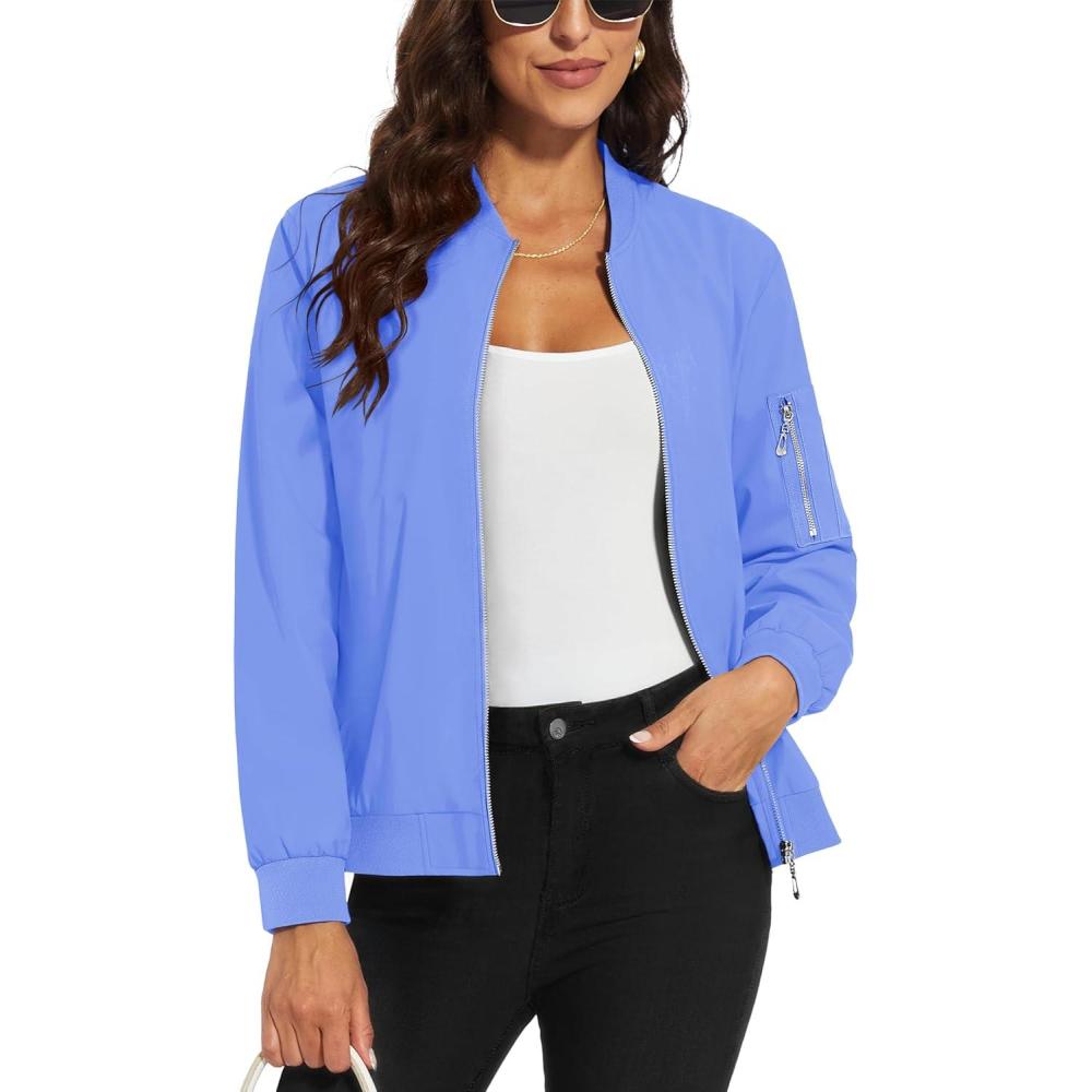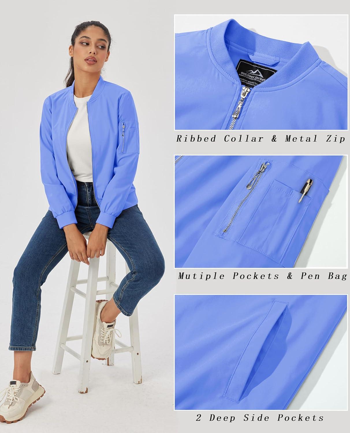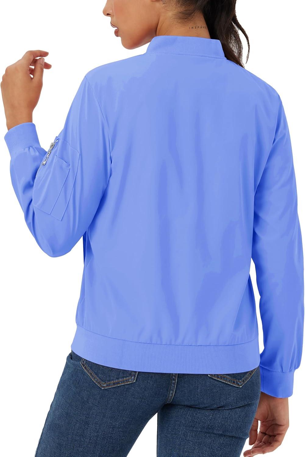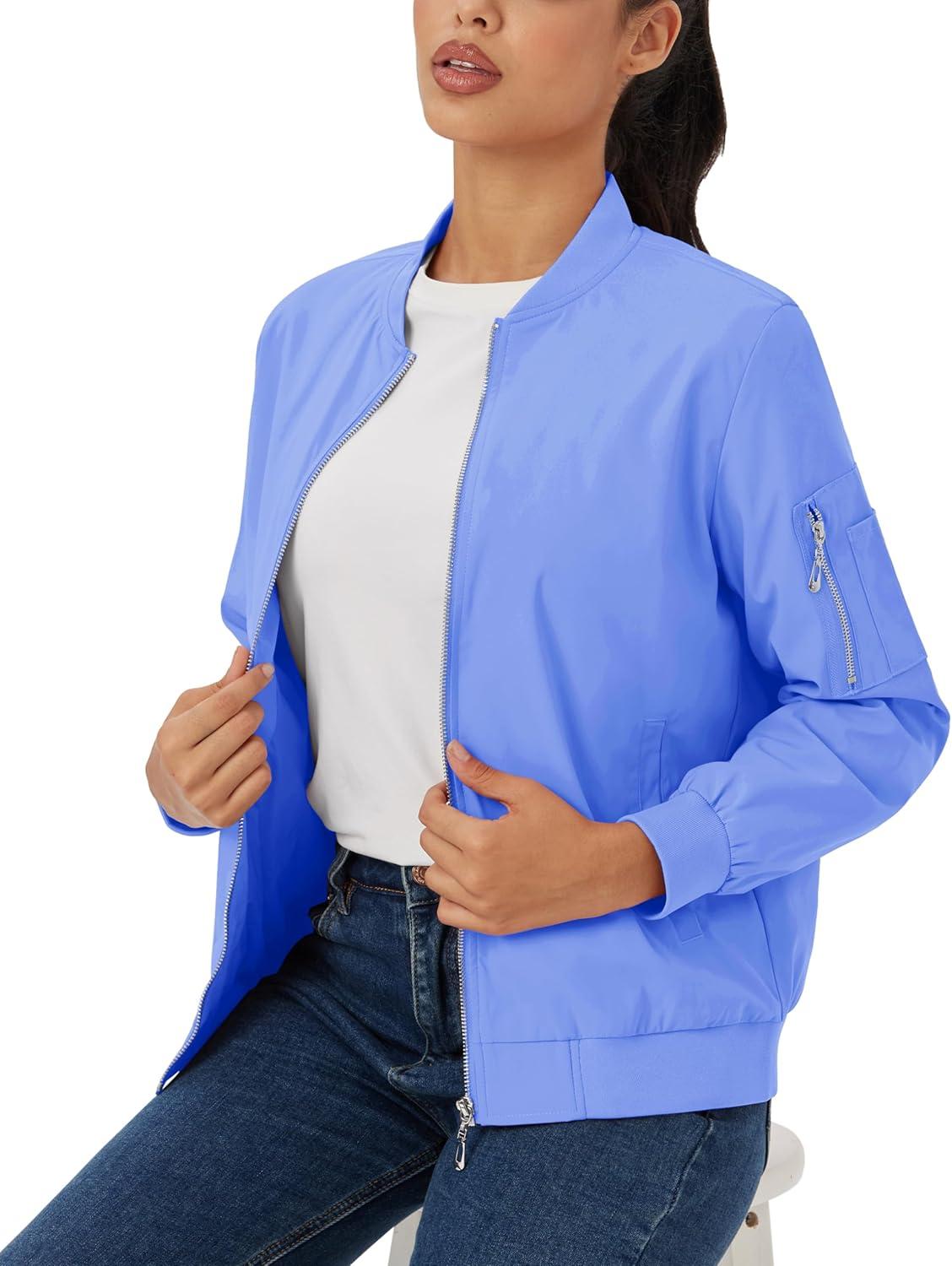 MAGCOMSEN Women’s Casual Jacket Lightweight Bomber Jackets 5 Pockets Windbreaker Zip-up Spring Fall Outerwear(Light Blue)