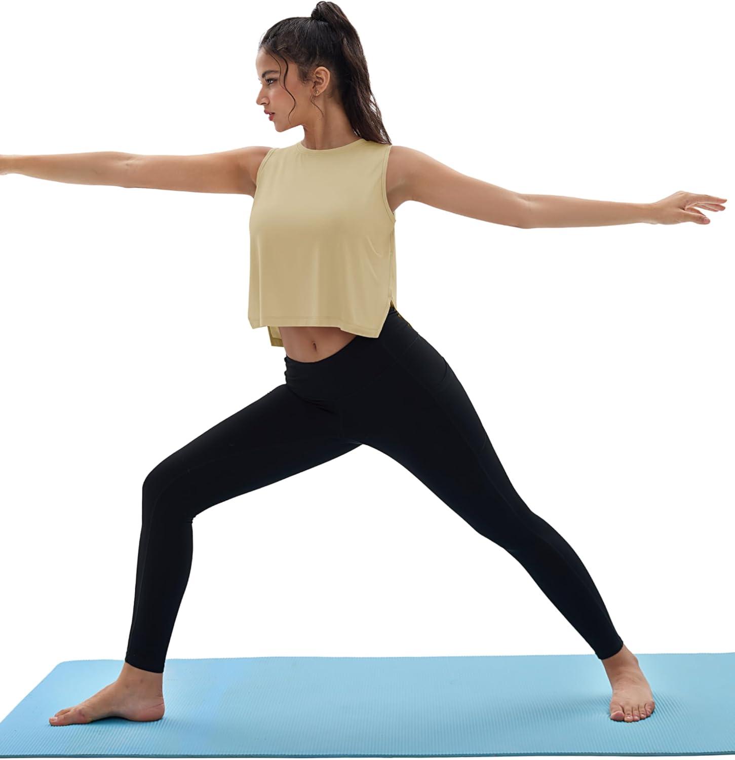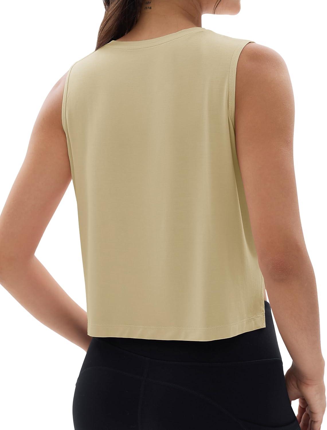 MAGCOMSEN Women’s Crop Tank Tops Workout Sleeveless Shirts Loose Fit Gym Yoga Top with Side Slits(Light Khaki)