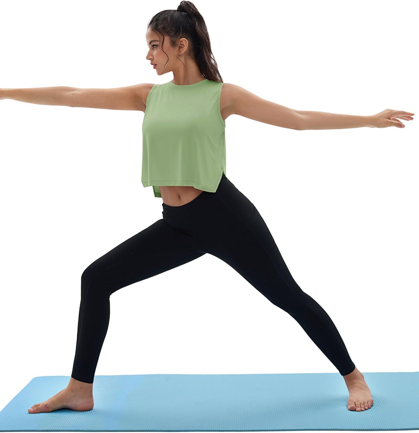 MAGCOMSEN Women’s Crop Tank Tops Workout Sleeveless Shirts Loose Fit Gym Yoga Top with Side Slits(Mist Green)