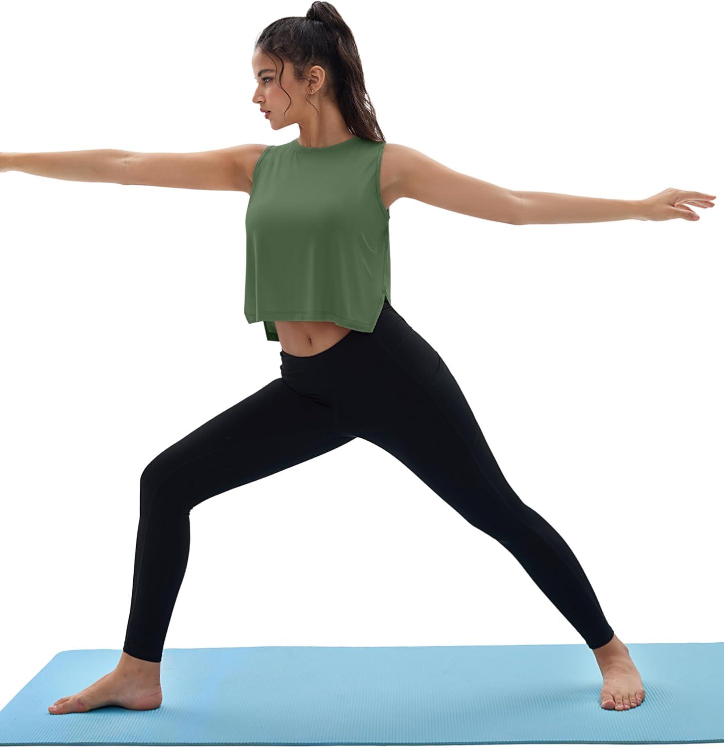 MAGCOMSEN Women’s Crop Tank Tops Workout Sleeveless Shirts Loose Fit Gym Yoga Top with Side Slits(Moss Green)