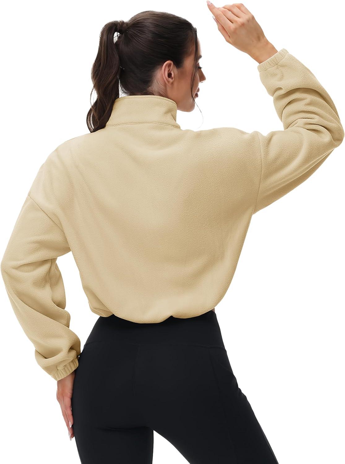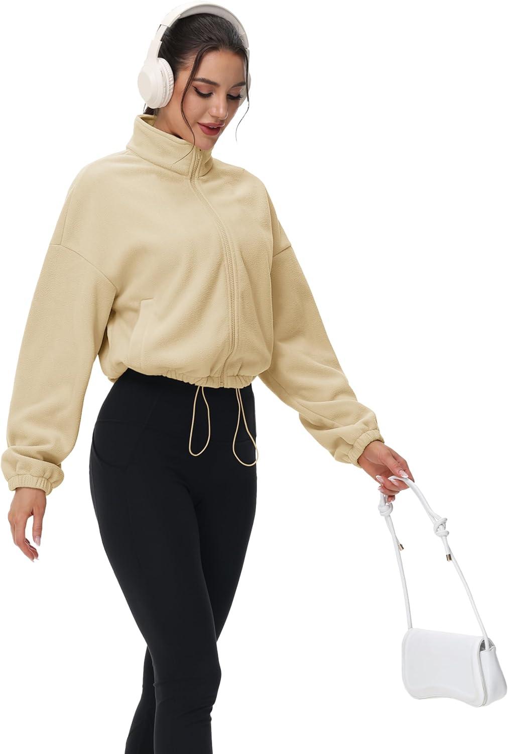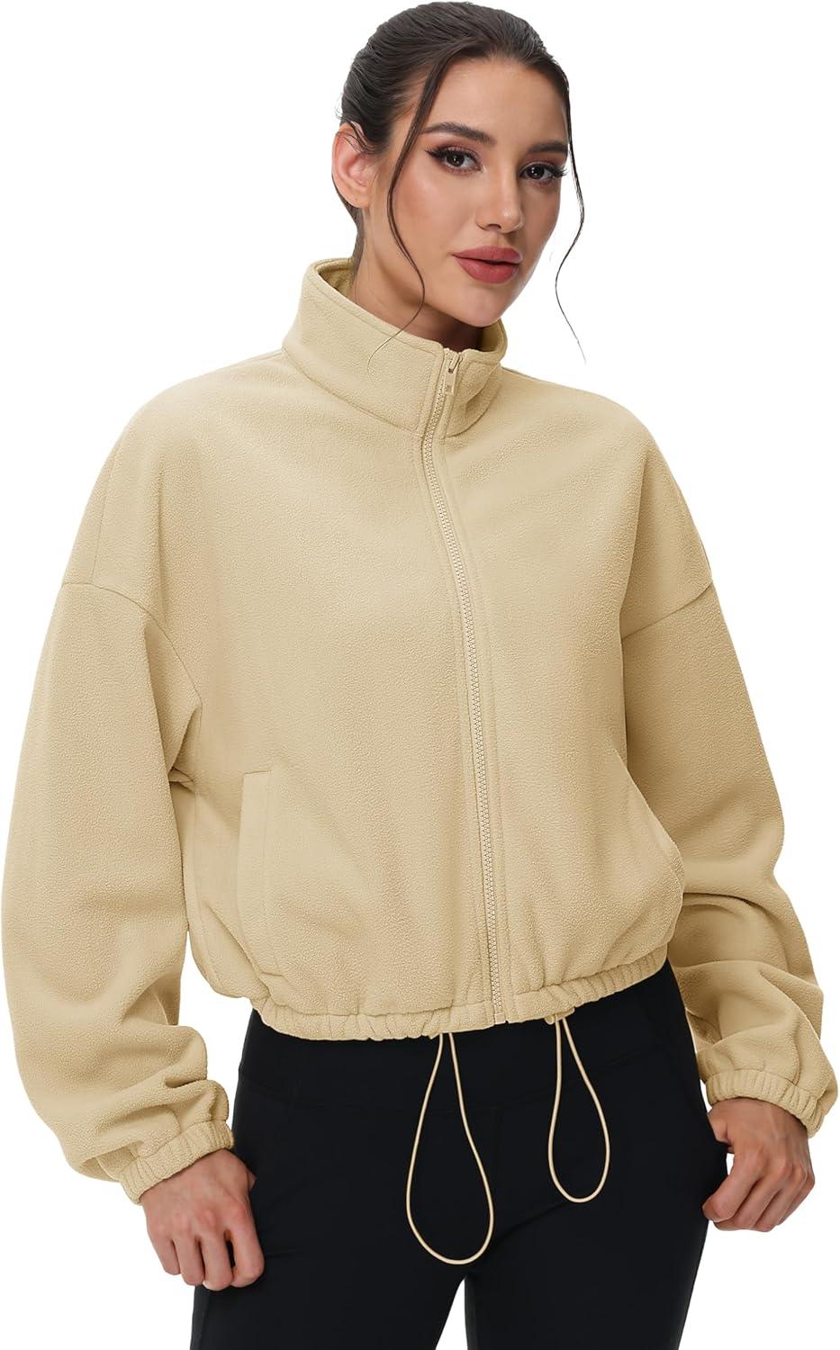 MAGCOMSEN Women’s Cropped Fleece Jacket Full Zip Stand Collar Workout Short Sherpa Coat Winter Sweatshirt(Light Khaki)