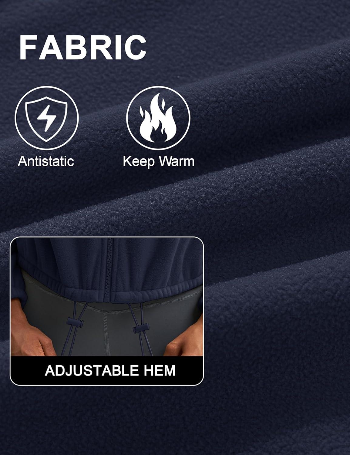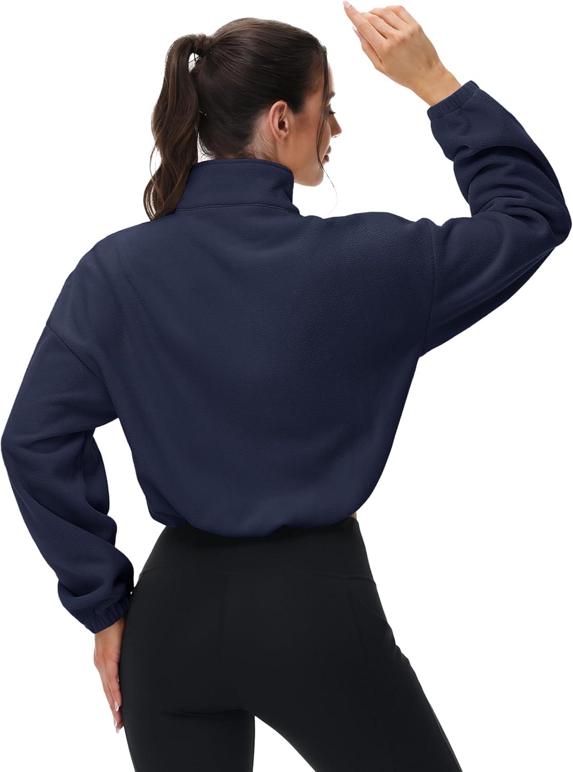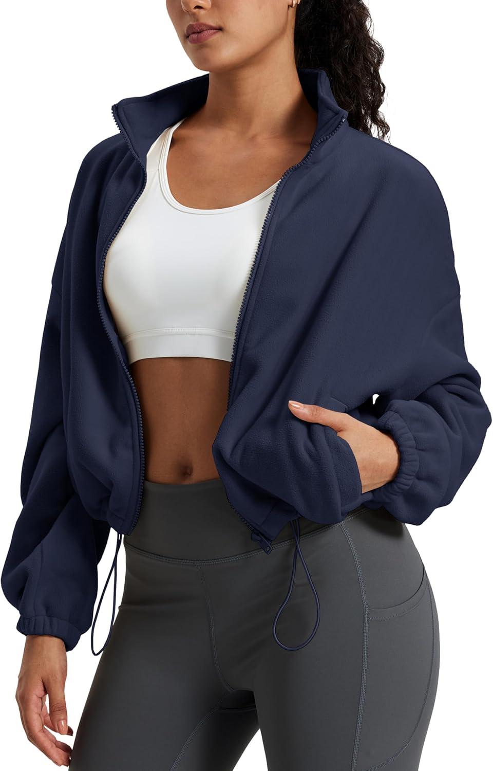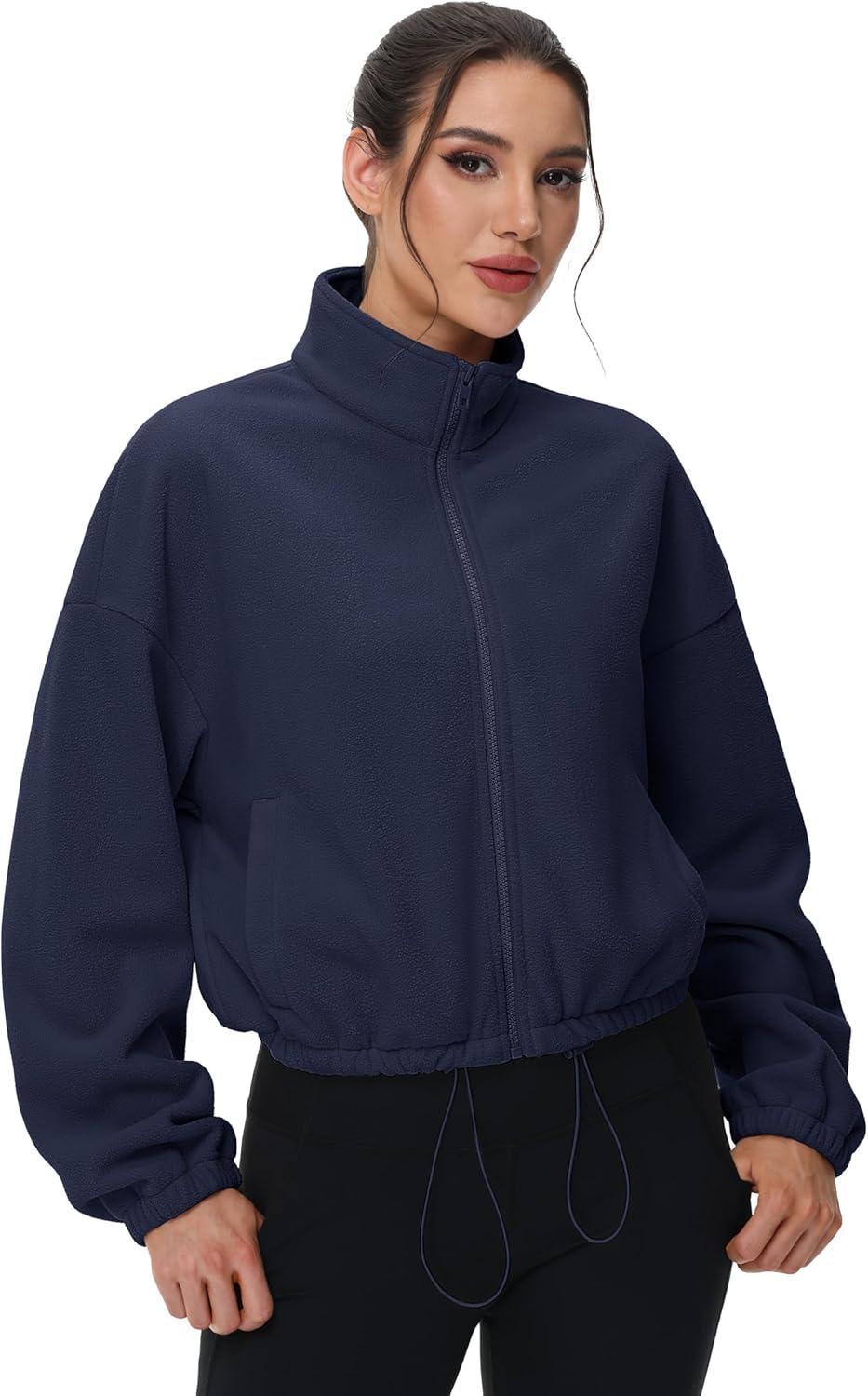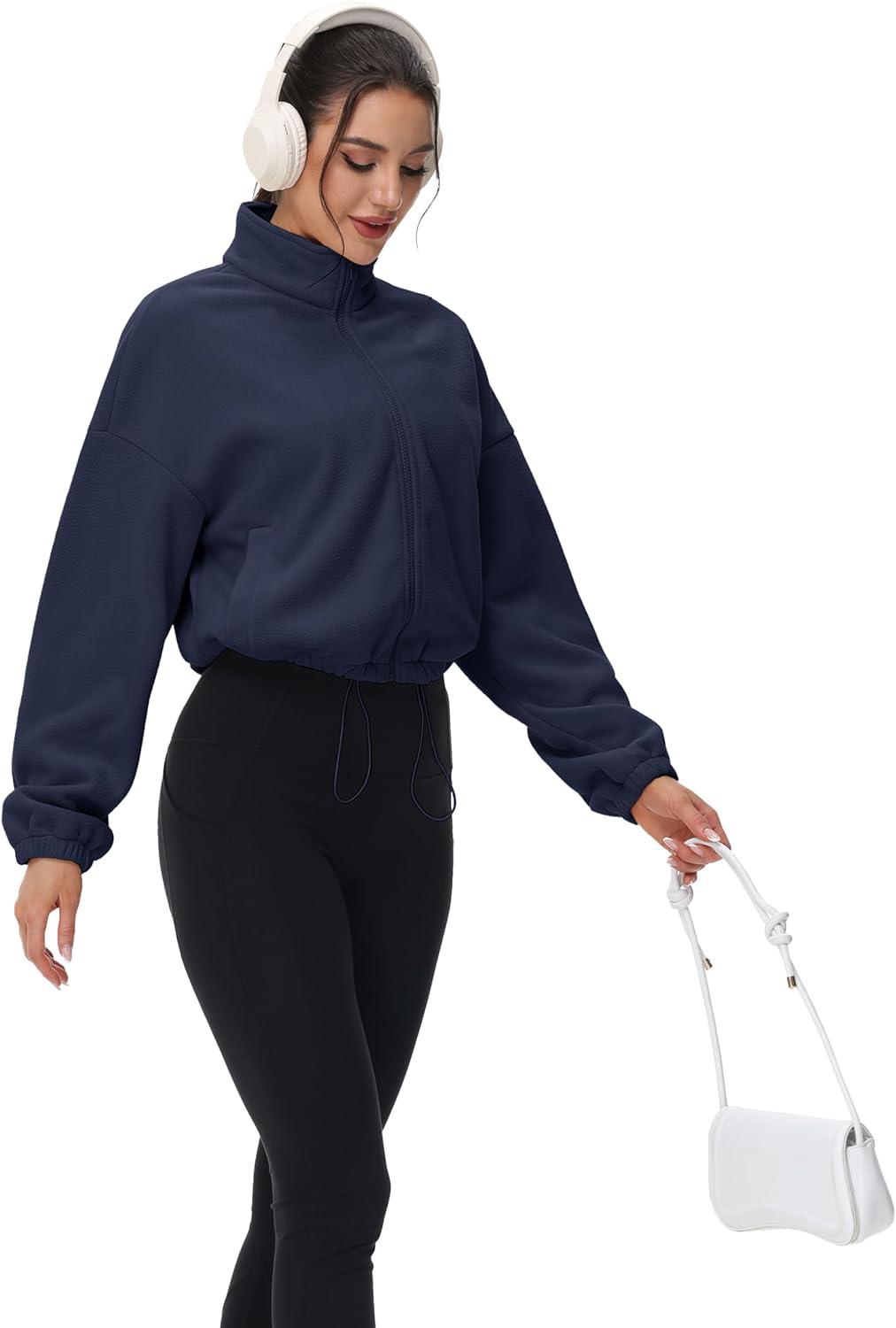 MAGCOMSEN Women’s Cropped Fleece Jacket Full Zip Stand Collar Workout Short Sherpa Coat Winter Sweatshirt(Navy)