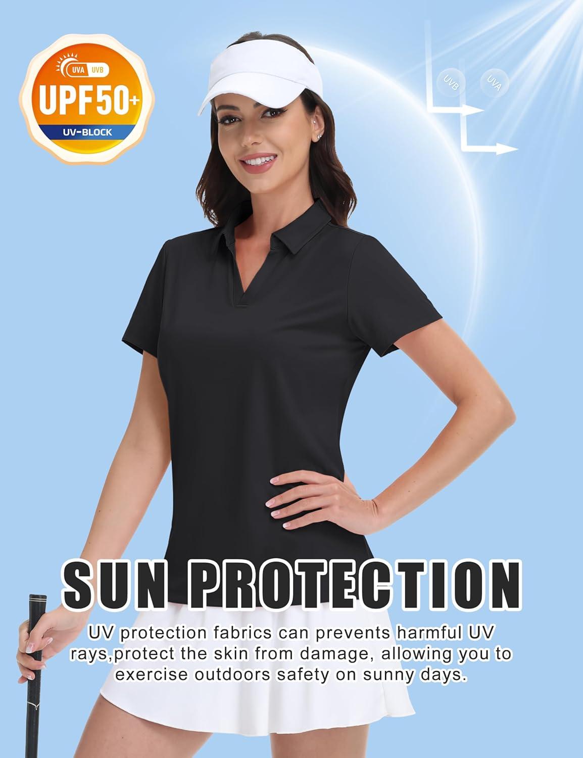 MAGCOMSEN Women’s Golf Shirts Short Sleeve Polo Collared Tennis Shirt V Neck Quick Dry Sun Protection UPF 50+(Black)