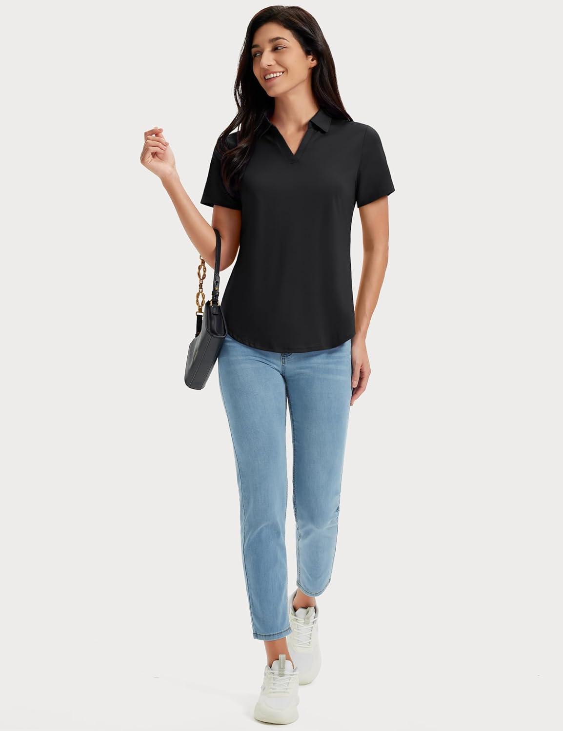 MAGCOMSEN Women’s Golf Shirts Short Sleeve Polo UPF 50+ V Neck Collared Tops Quick Dry Tennis Athletic T Shirts(Black)
