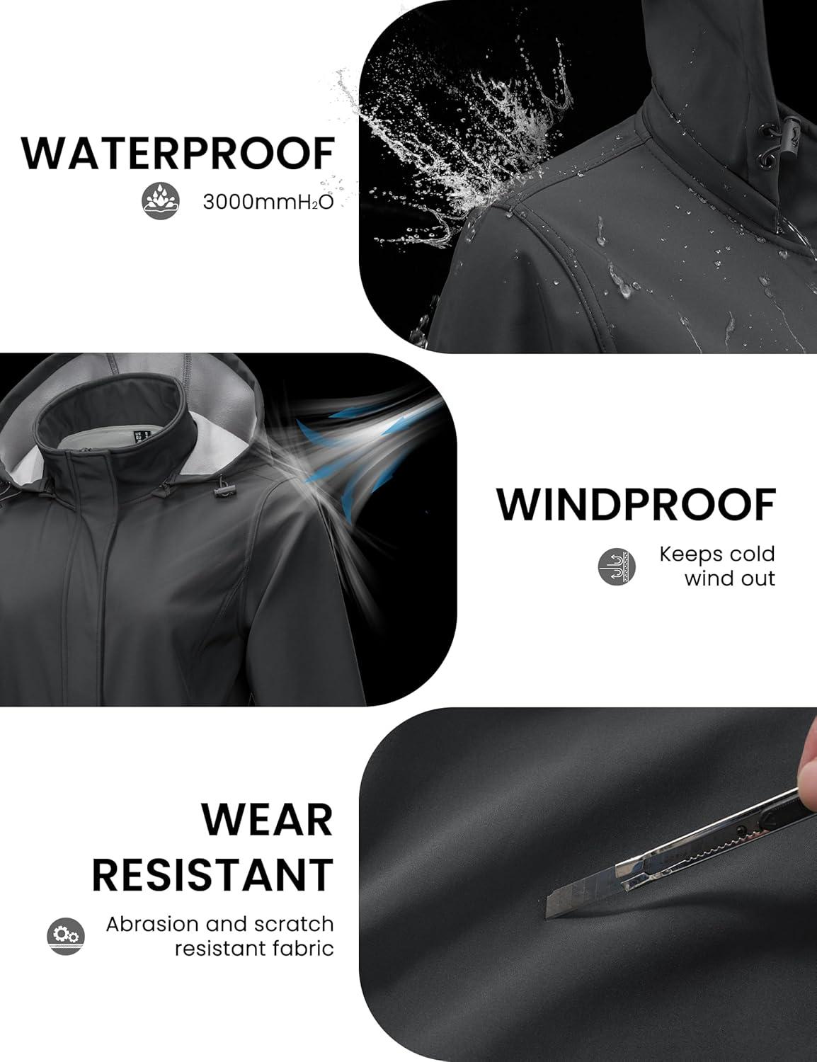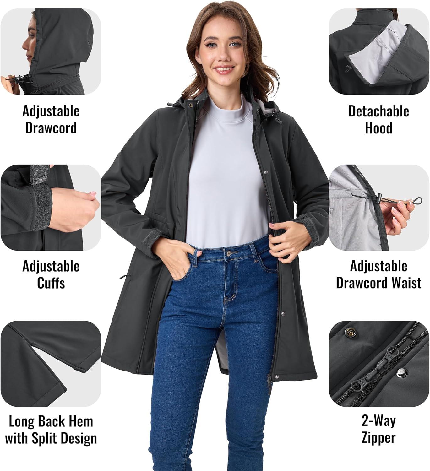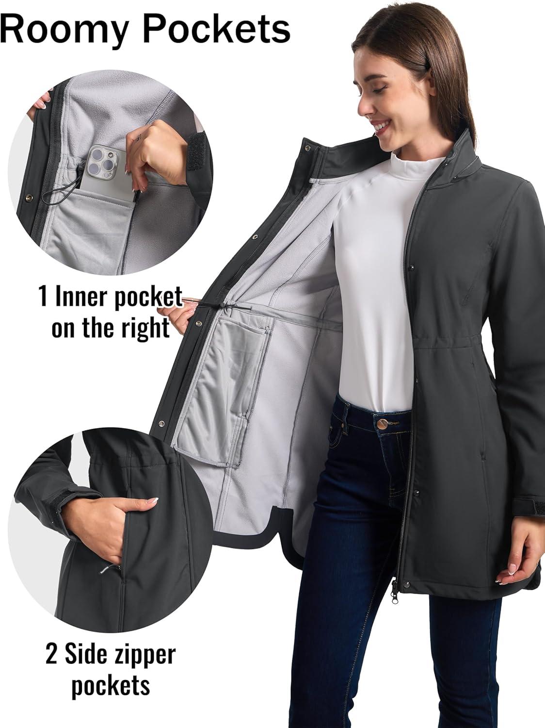 MAGCOMSEN Women’s Long Fleece Lined Jackets Warm Winter Windbreaker Rain Coat Hooded Softshell Windproof Insulated(Dark Grey)