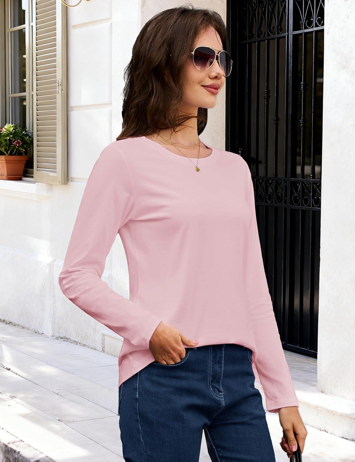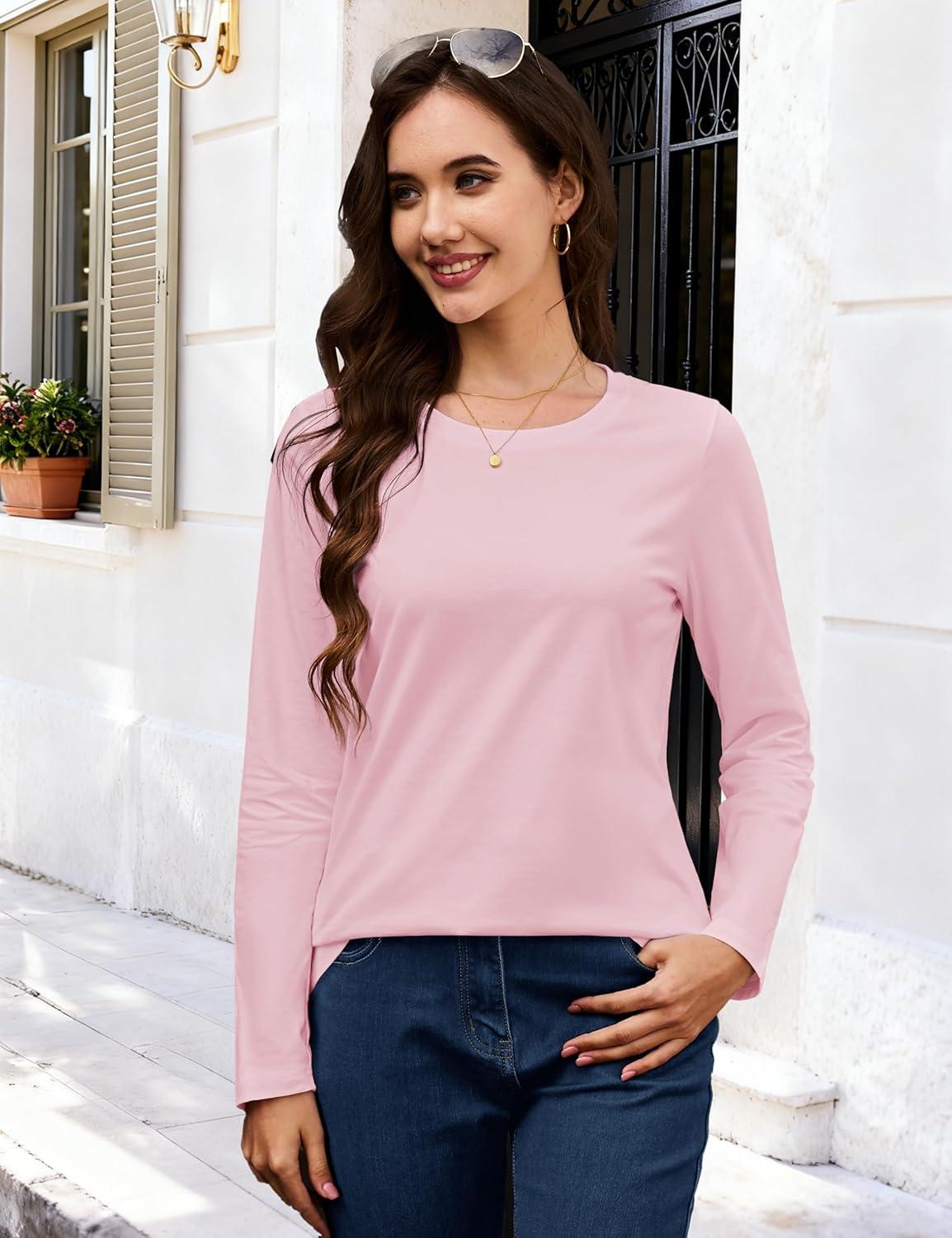 MAGCOMSEN Women’s Long-Sleeve Crew-Neck Cotton T-Shirt Classic-Fit Shirt Soft Breathable Casual Tee Basic Tops(A-light Pink)
