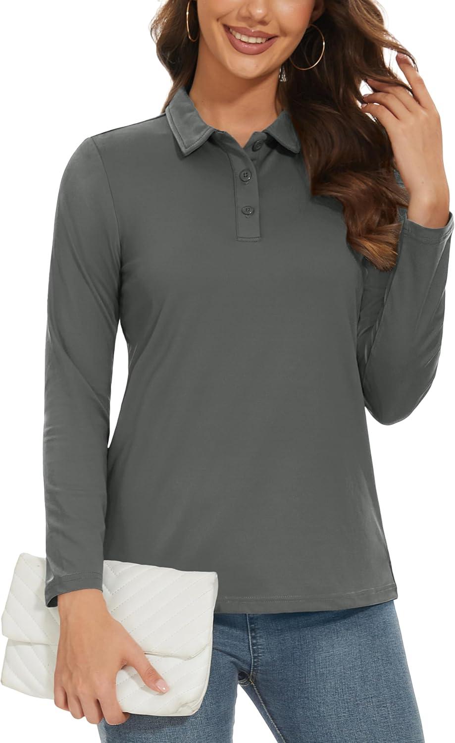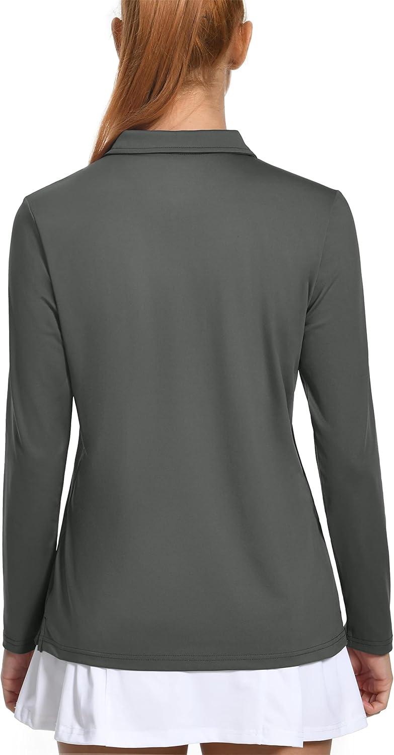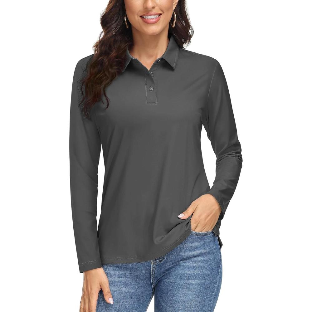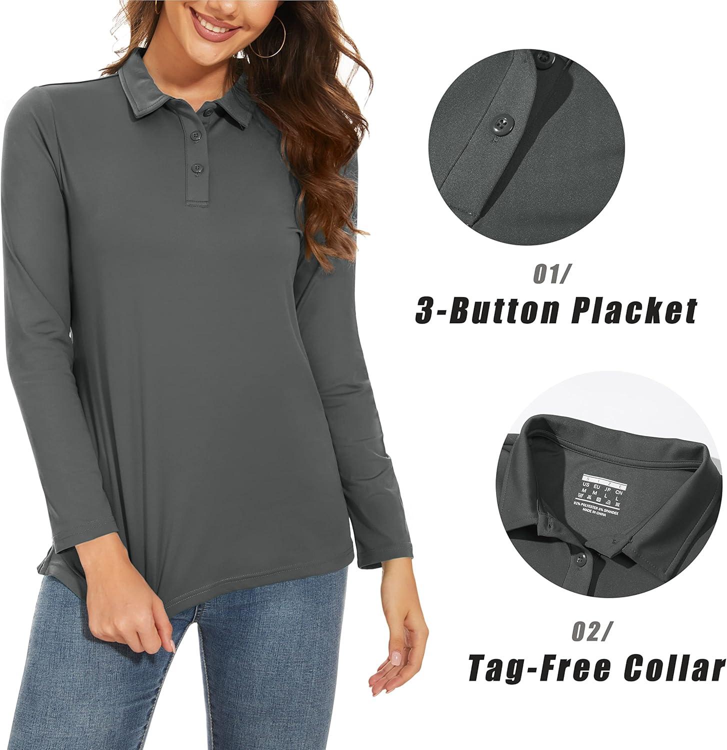 MAGCOMSEN Women’s Long Sleeve Polo Shirts UPF 50+ Golf Tops Moisture Wicking Collared Shirt Tennis 3-Button(Dark Grey)
