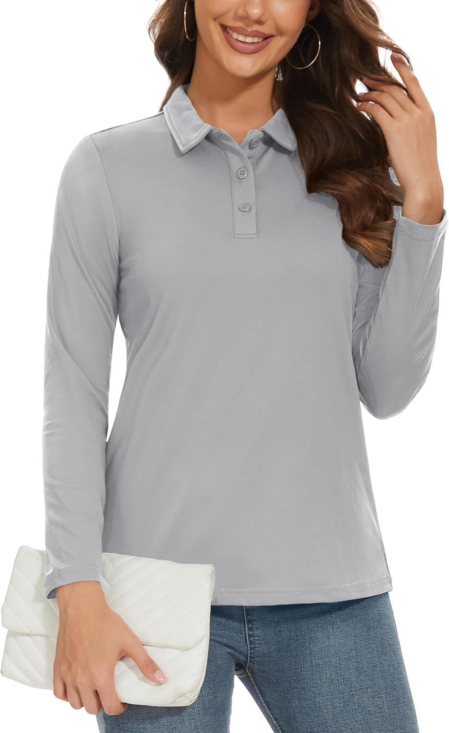 MAGCOMSEN Women’s Long Sleeve Polo Shirts UPF 50+ Golf Tops Moisture Wicking Collared Shirt Tennis 3-Button(Light Grey)
