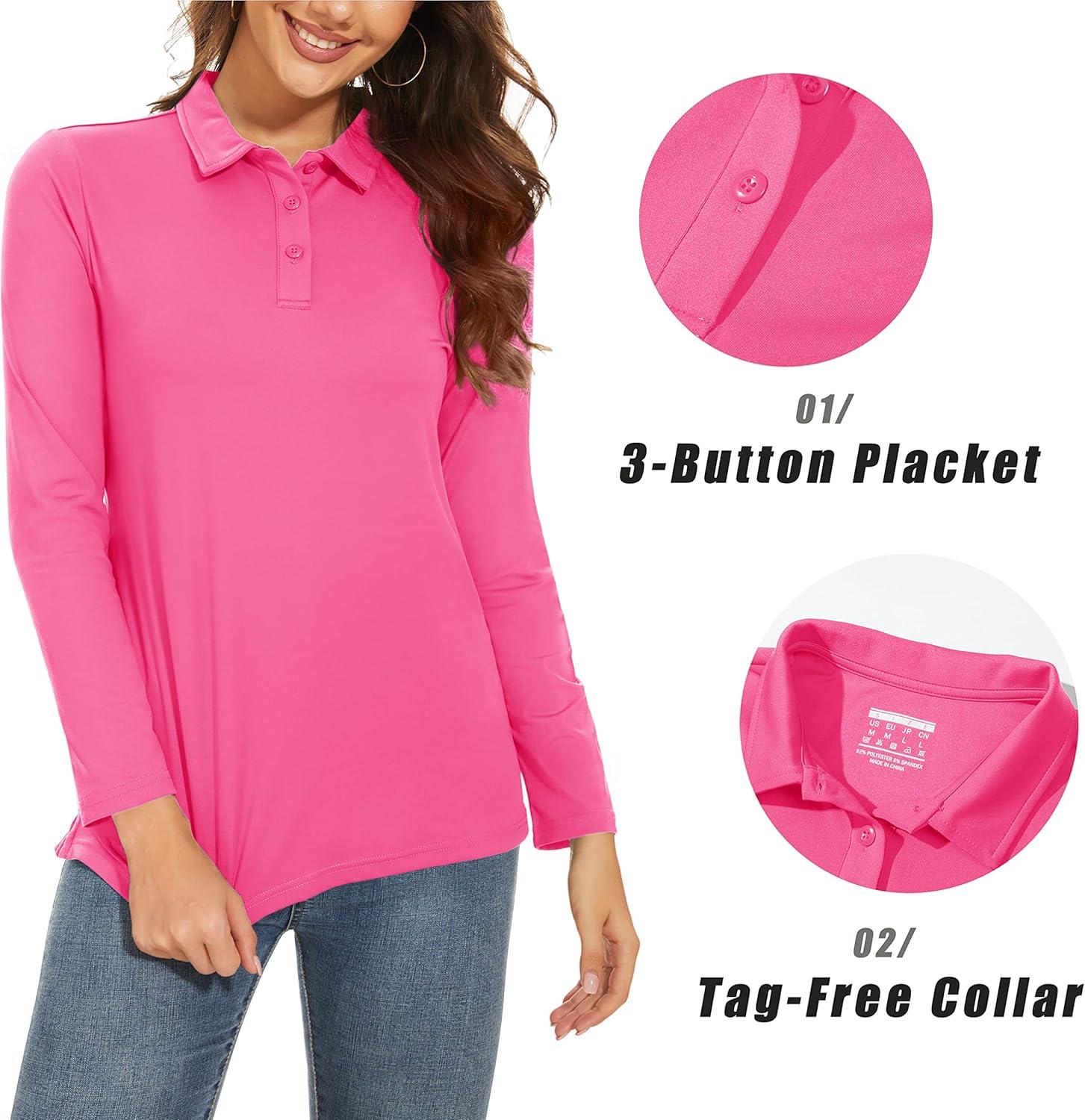MAGCOMSEN Women’s Long Sleeve Polo Shirts UPF 50+ Golf Tops Moisture Wicking Collared Shirt Tennis 3-Button(Pink)