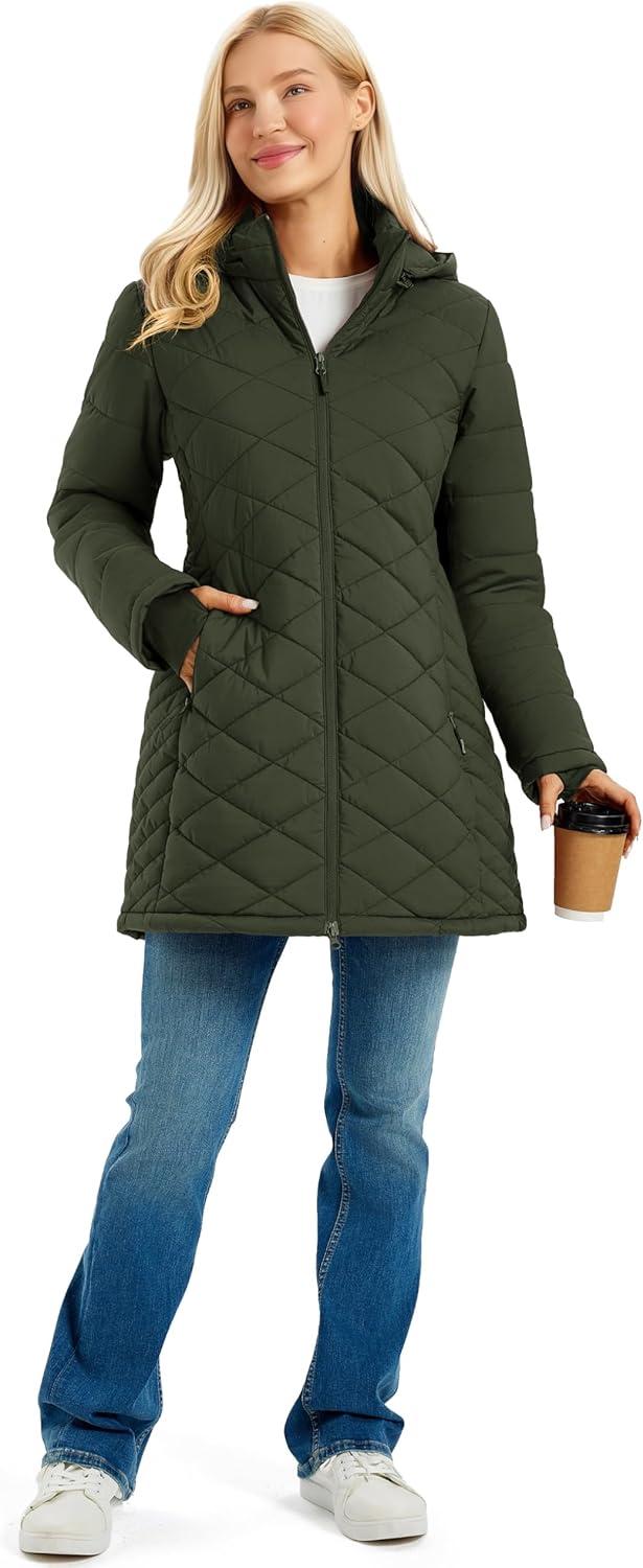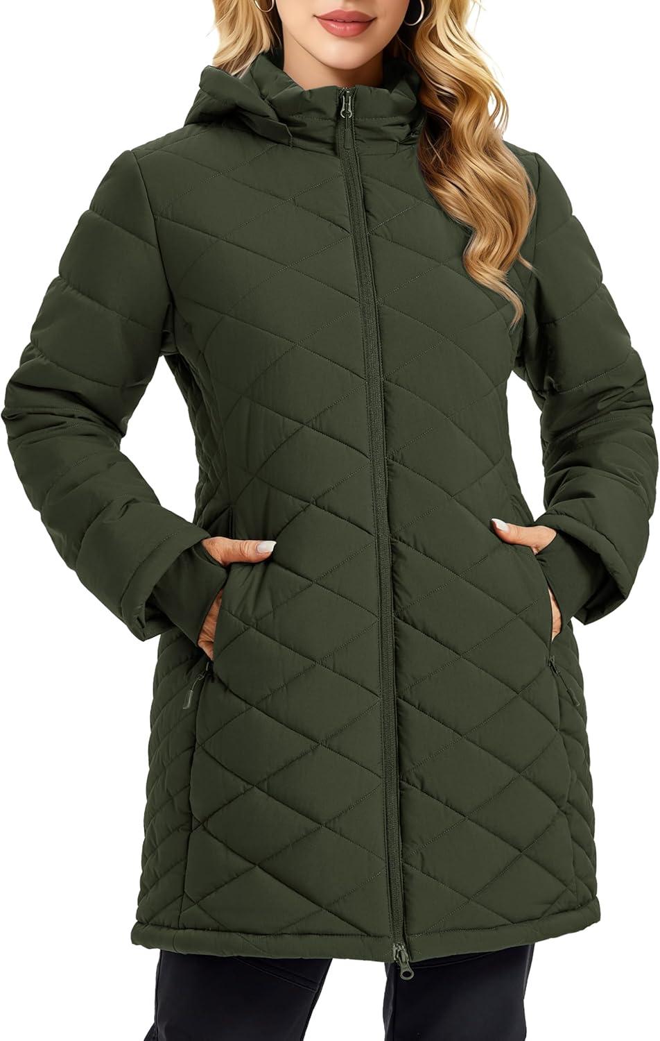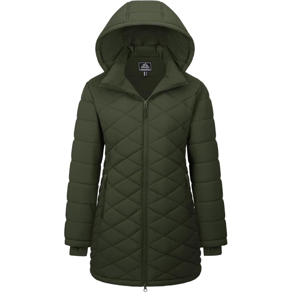 MAGCOMSEN Women’s Long Winter Quilted Puffer Jackets Lightweight Warm Insulated Coat Waterproof Outwear Parkas with Hood(Army Green)