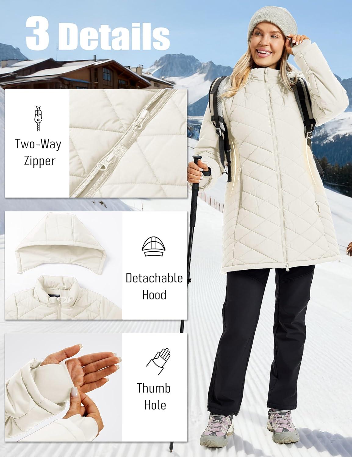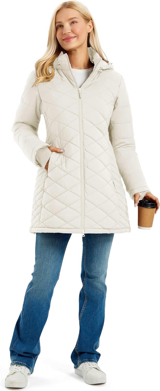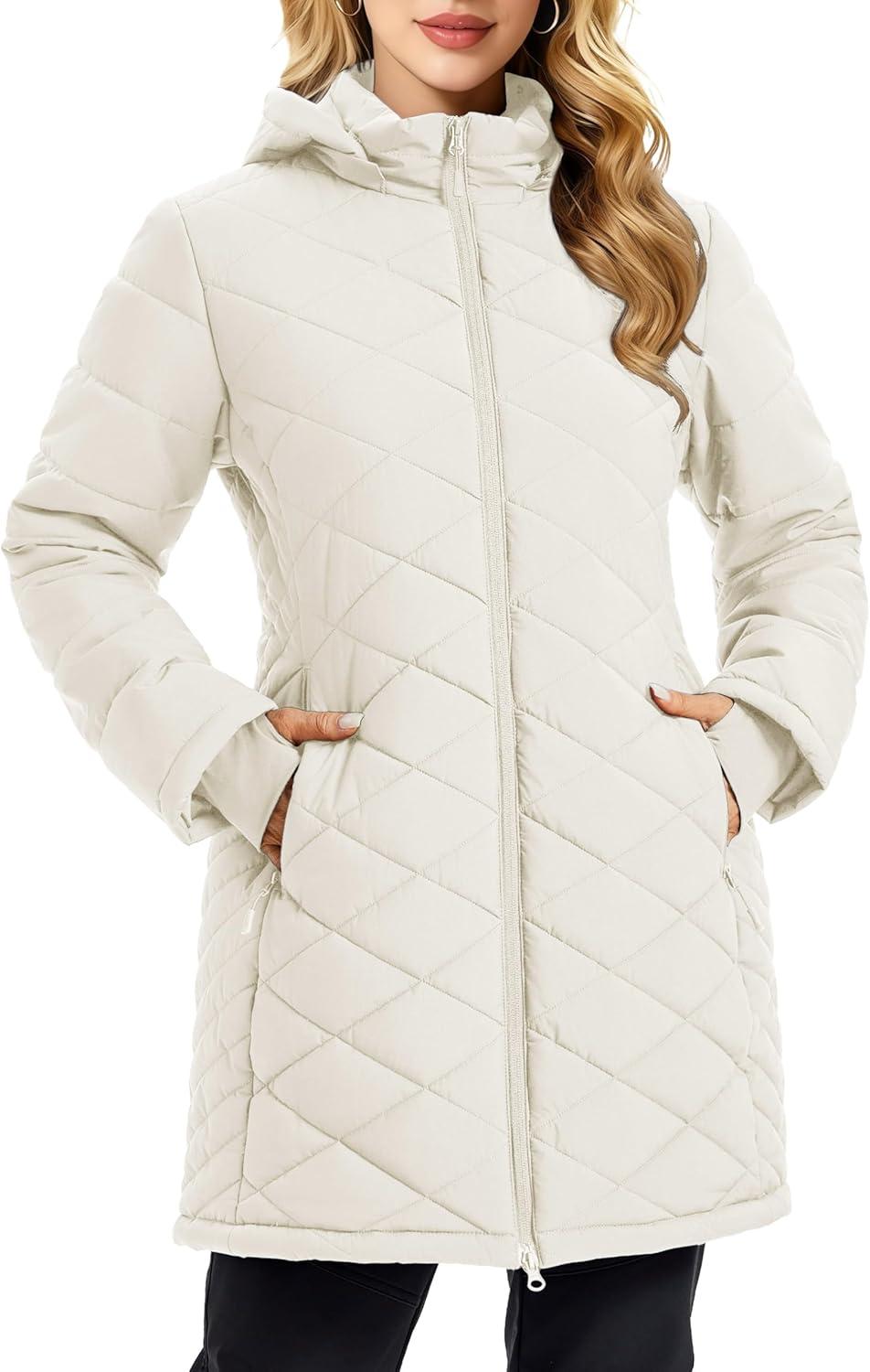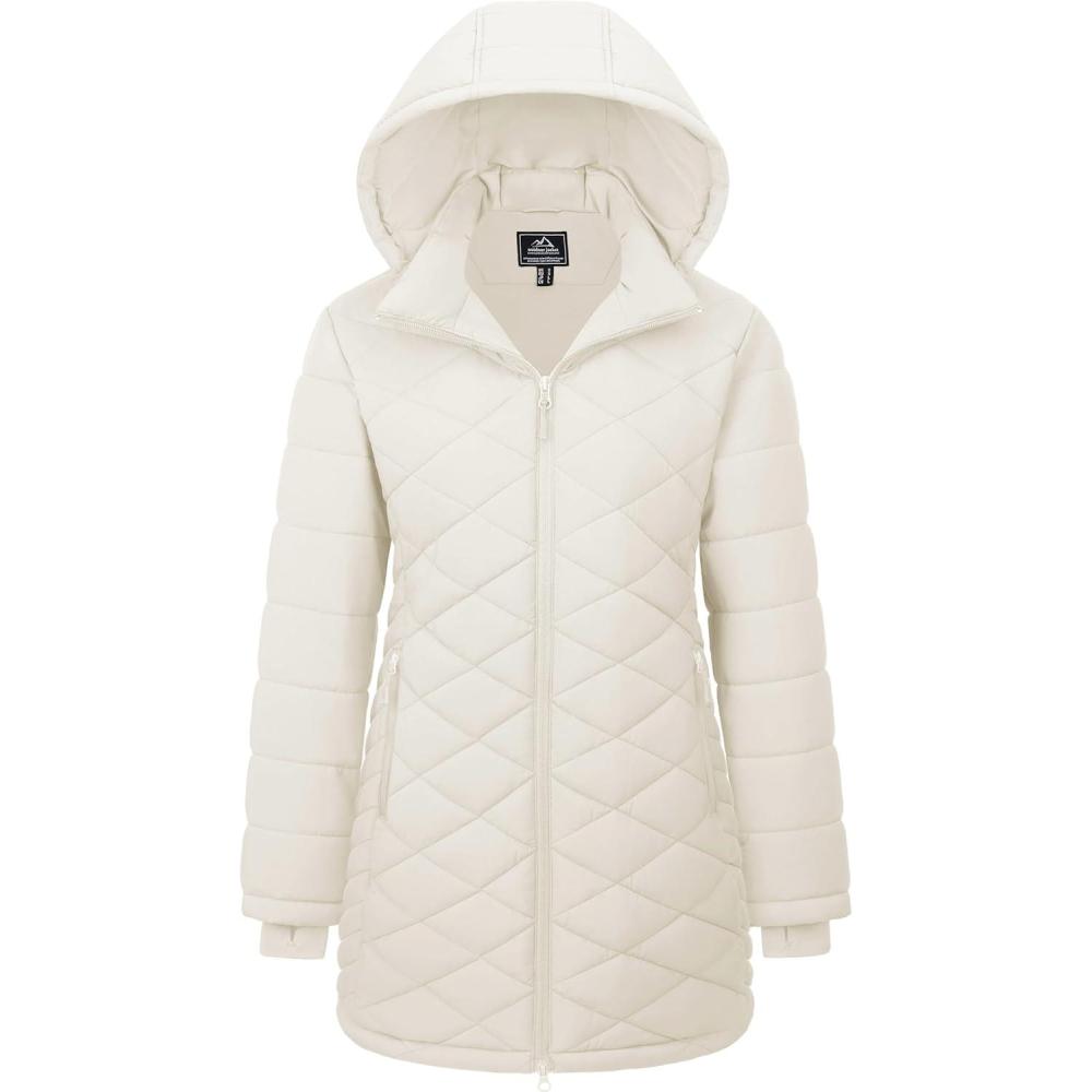 MAGCOMSEN Women’s Long Winter Quilted Puffer Jackets Lightweight Warm Insulated Coat Waterproof Outwear Parkas with Hood(Beige)