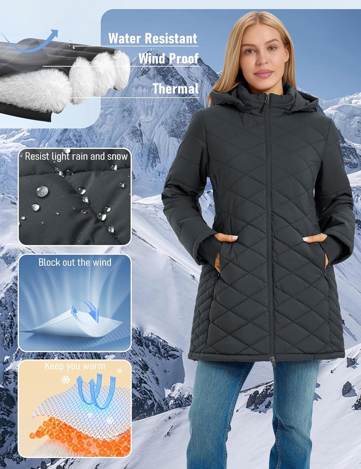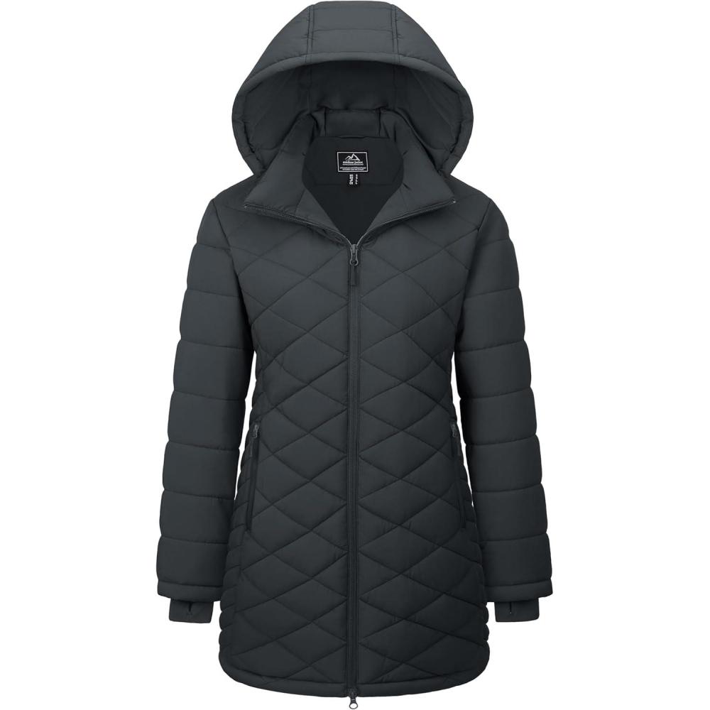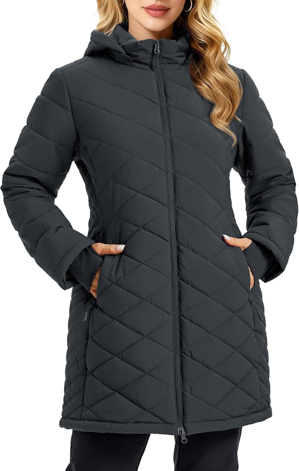 MAGCOMSEN Women’s Long Winter Quilted Puffer Jackets Lightweight Warm Insulated Coat Waterproof Outwear Parkas with Hood(Dark Grey)