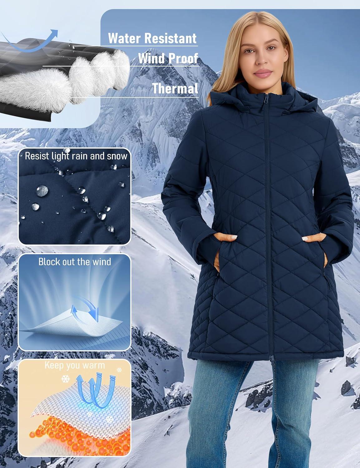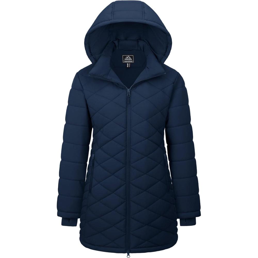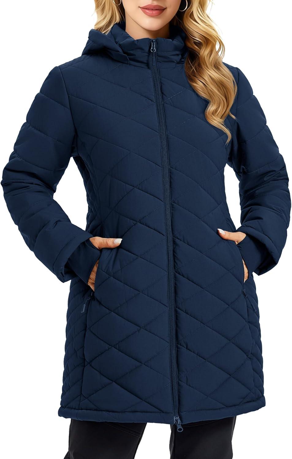 MAGCOMSEN Women’s Long Winter Quilted Puffer Jackets Lightweight Warm Insulated Coat Waterproof Outwear Parkas with Hood(Navy)