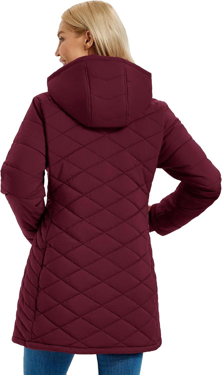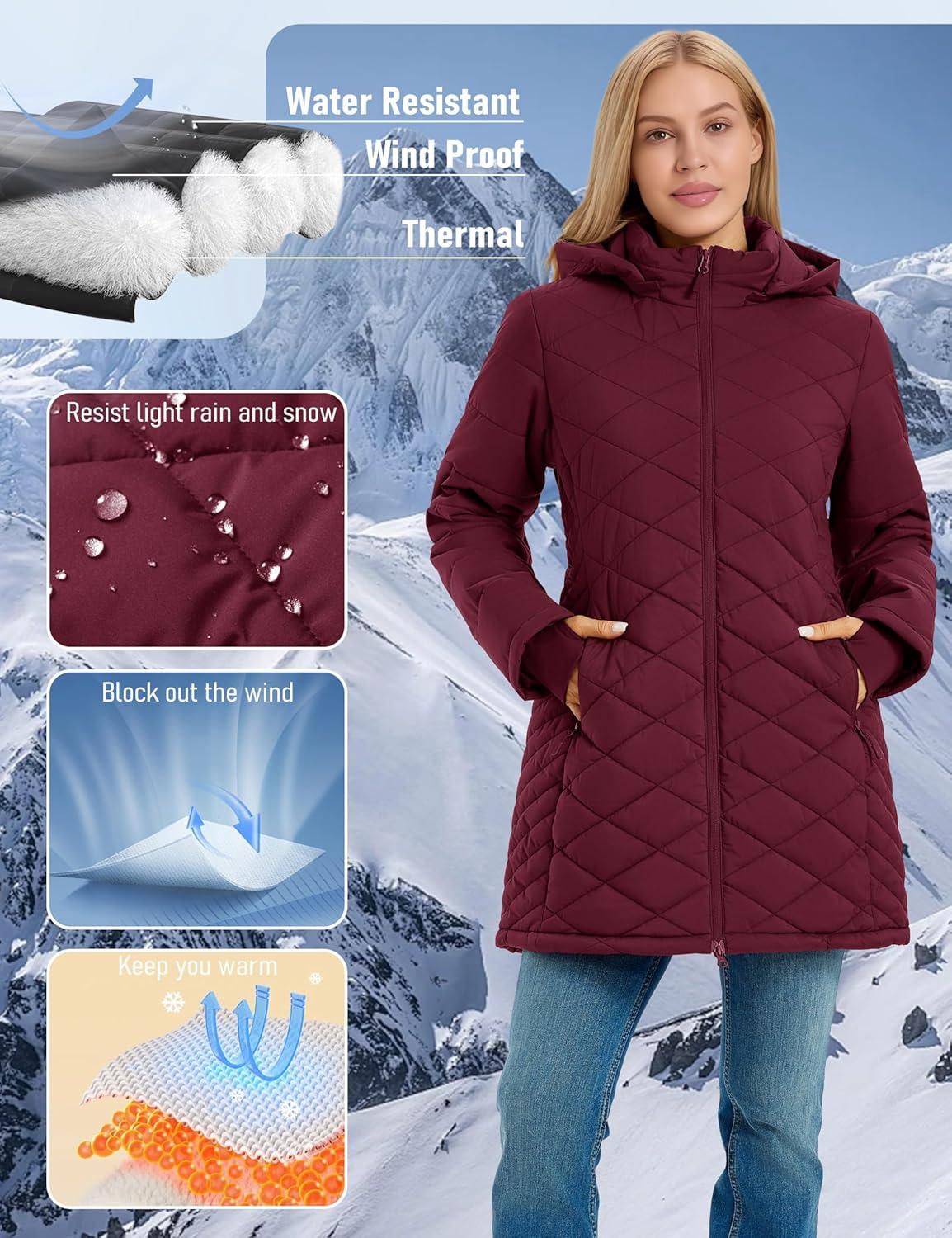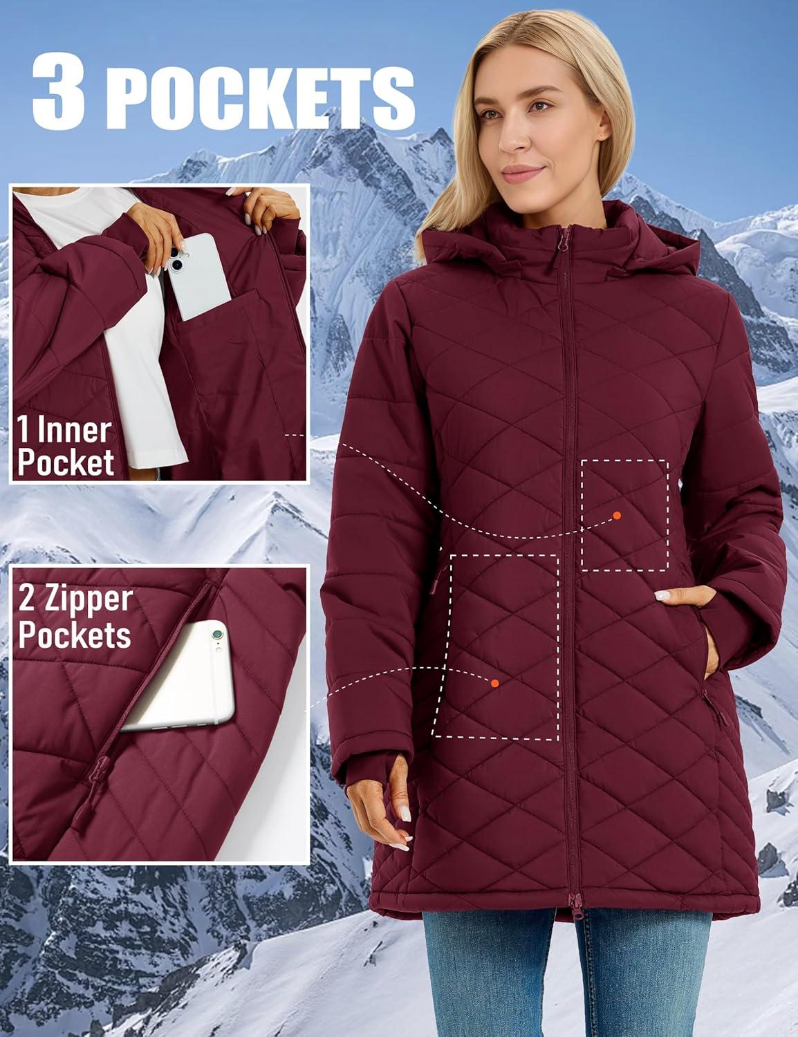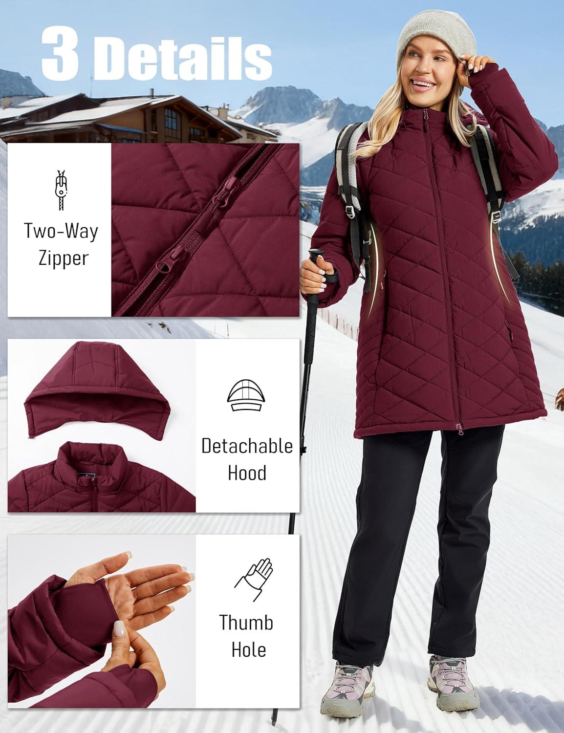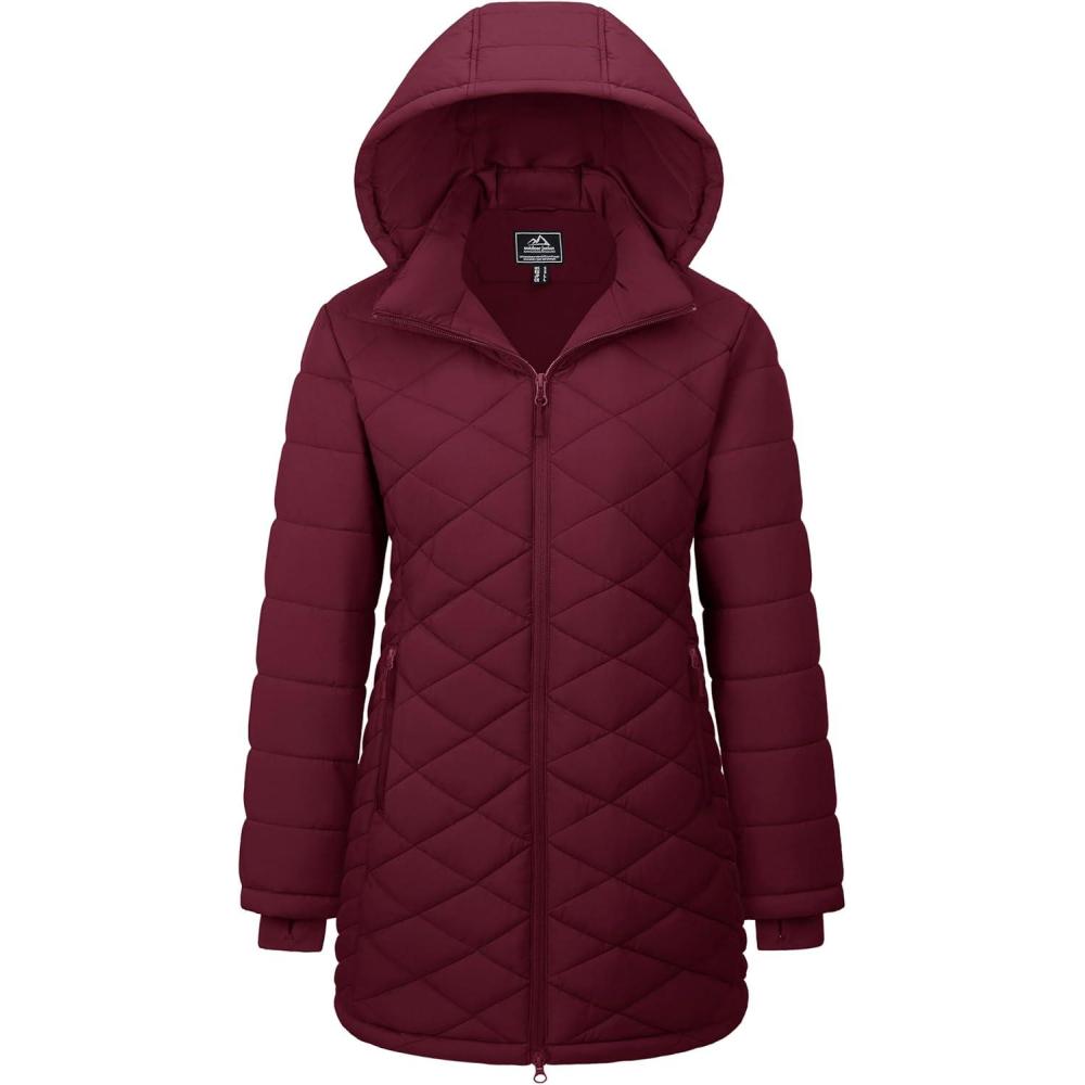 MAGCOMSEN Women’s Long Winter Quilted Puffer Jackets Lightweight Warm Insulated Coat Waterproof Outwear Parkas with Hood(Wine Red)