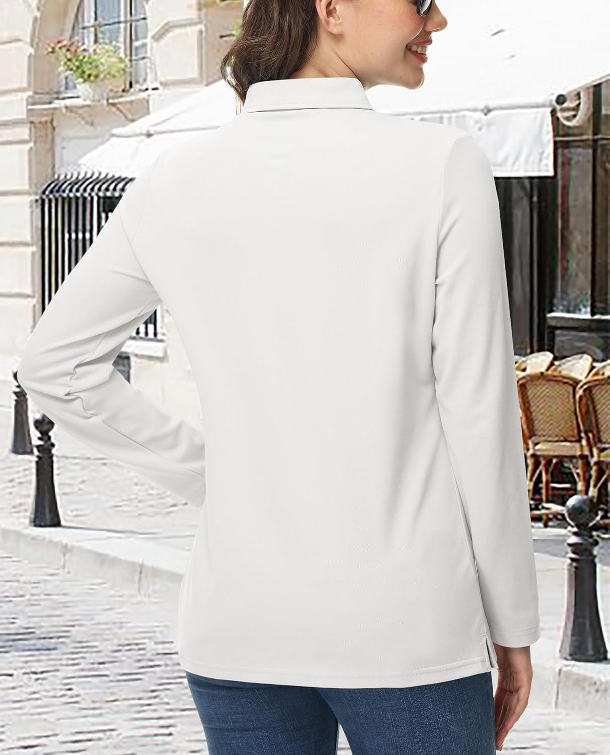 MAGCOMSEN Women’s Polo Shirts Long Sleeve Cotton Collared T Shirt Golf Shirt Business Casual Tee Uniform Tops 3-Button(White)