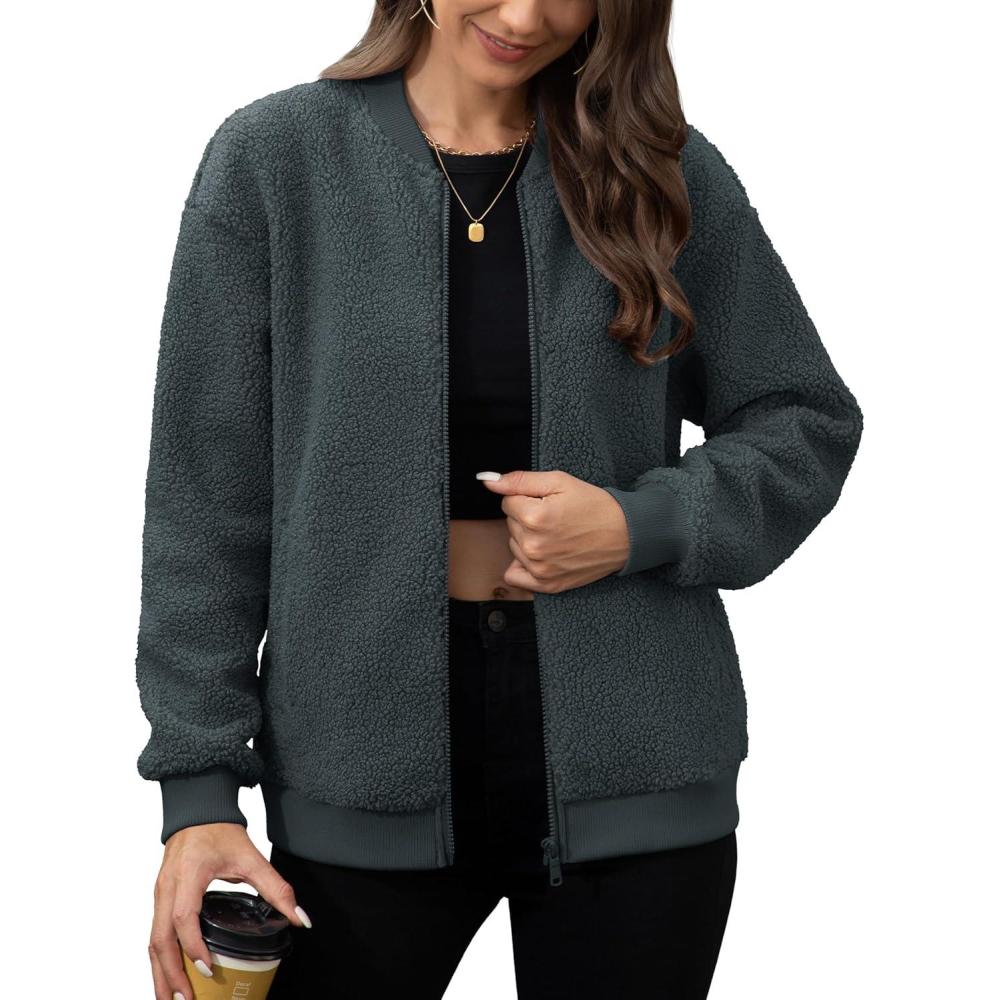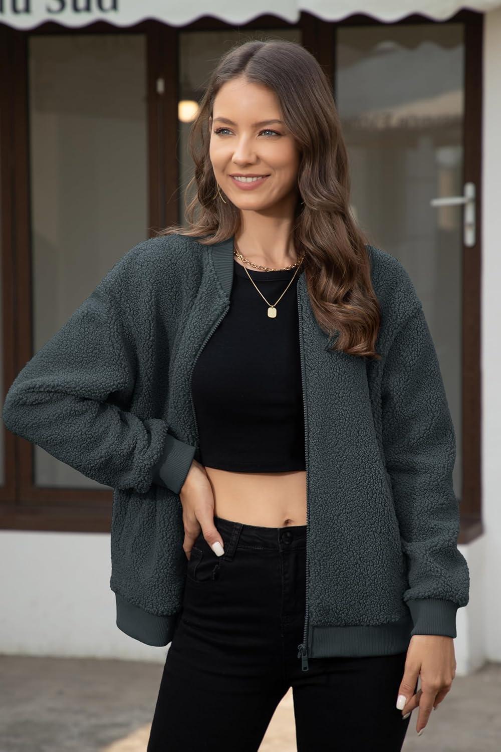 MAGCOMSEN Women’s Sherpa Fleece Jacket Long Sleeve Fuzzy Comfy Fall Coat Bomber Zip Up Winter Jackets with Pockets(Darkgrey)