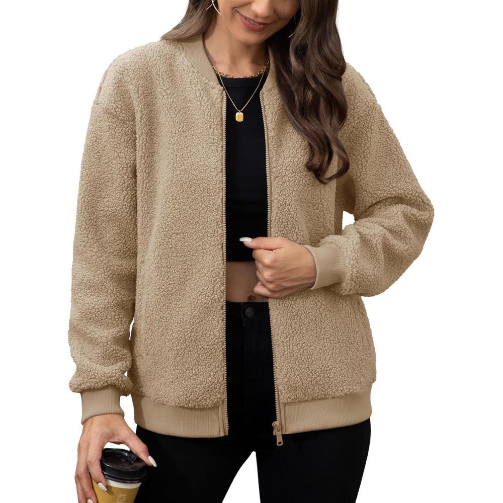 MAGCOMSEN Women’s Sherpa Fleece Jacket Long Sleeve Fuzzy Comfy Fall Coat Bomber Zip Up Winter Jackets with Pockets(Khaki)
