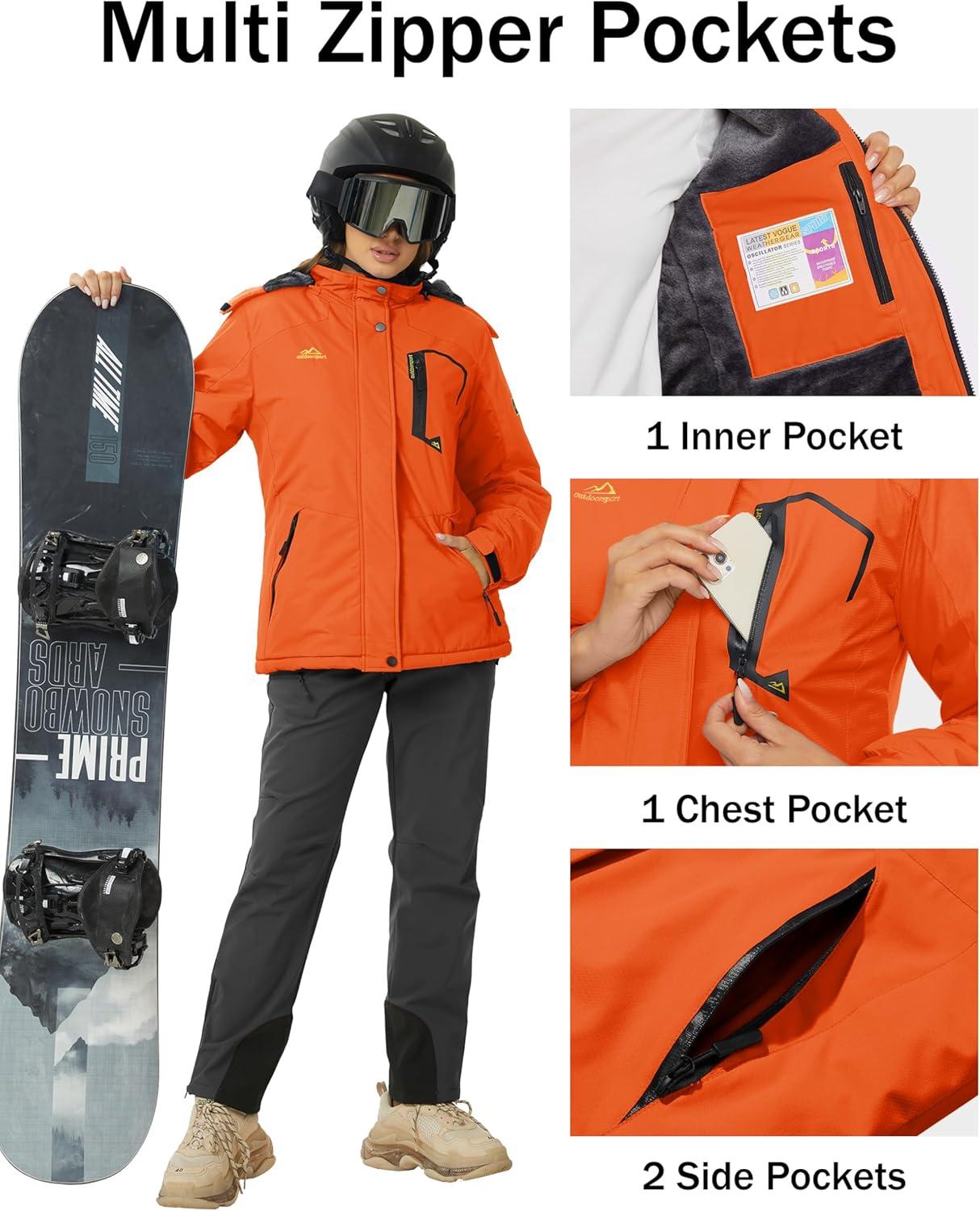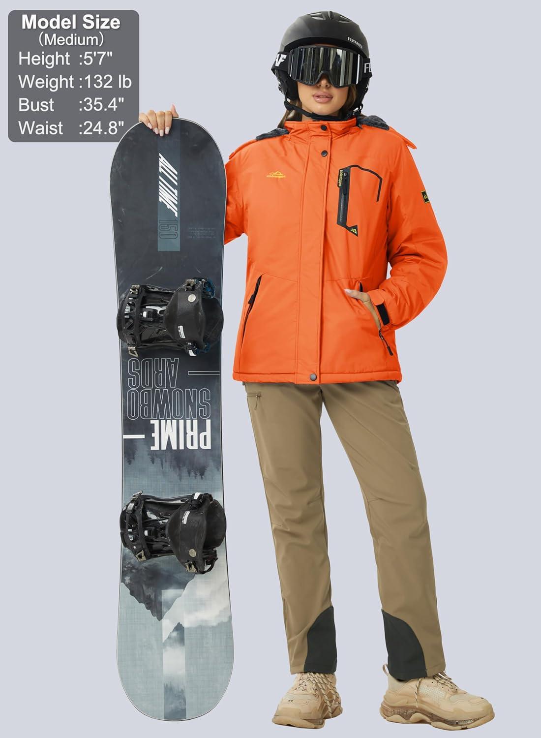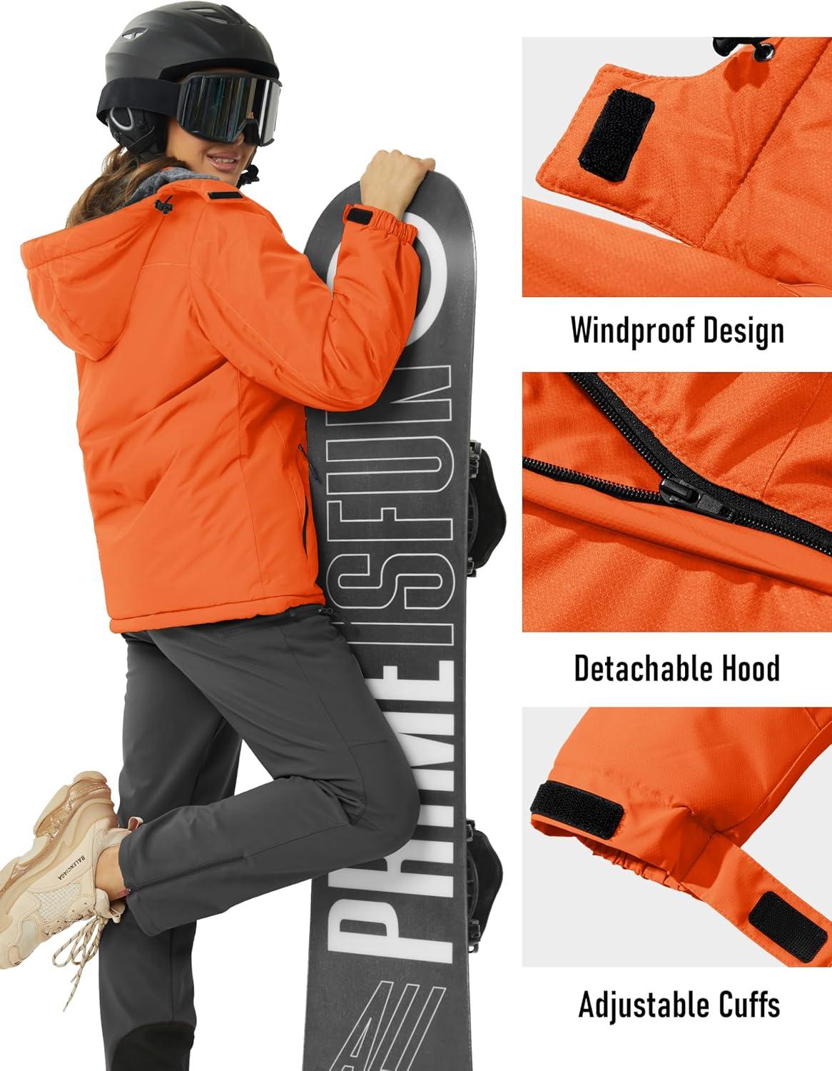 MAGCOMSEN Womens Ski Jacket Waterproof Insulated Snow Jacket Warm Windproof Winter Coats with Hood Fleece Lined Jacket(Orange)