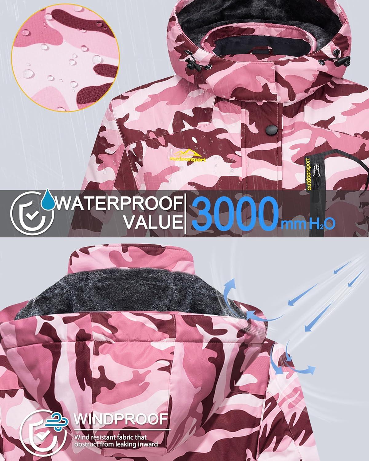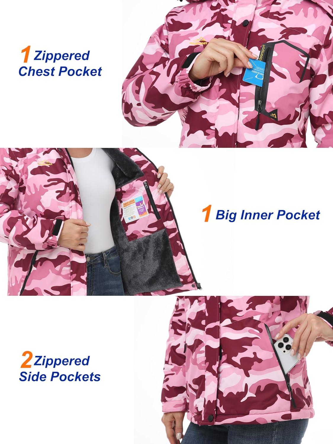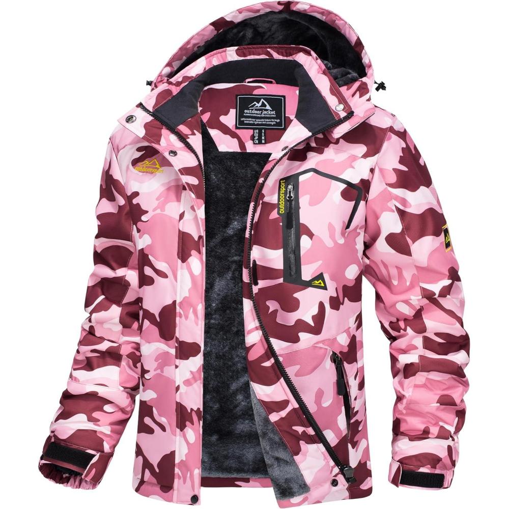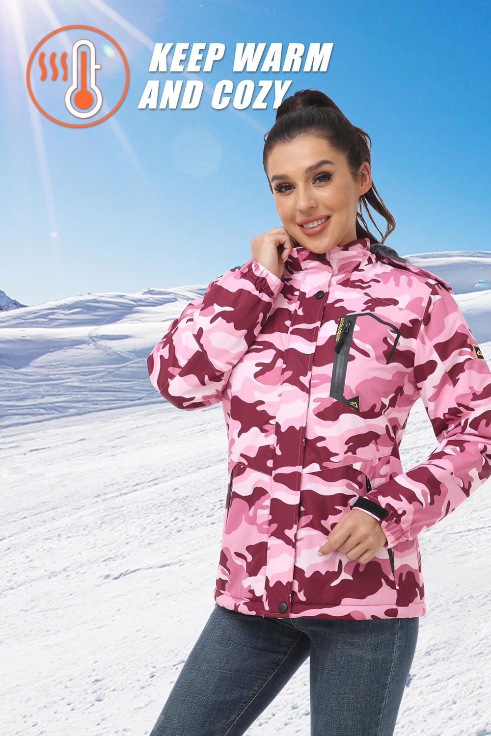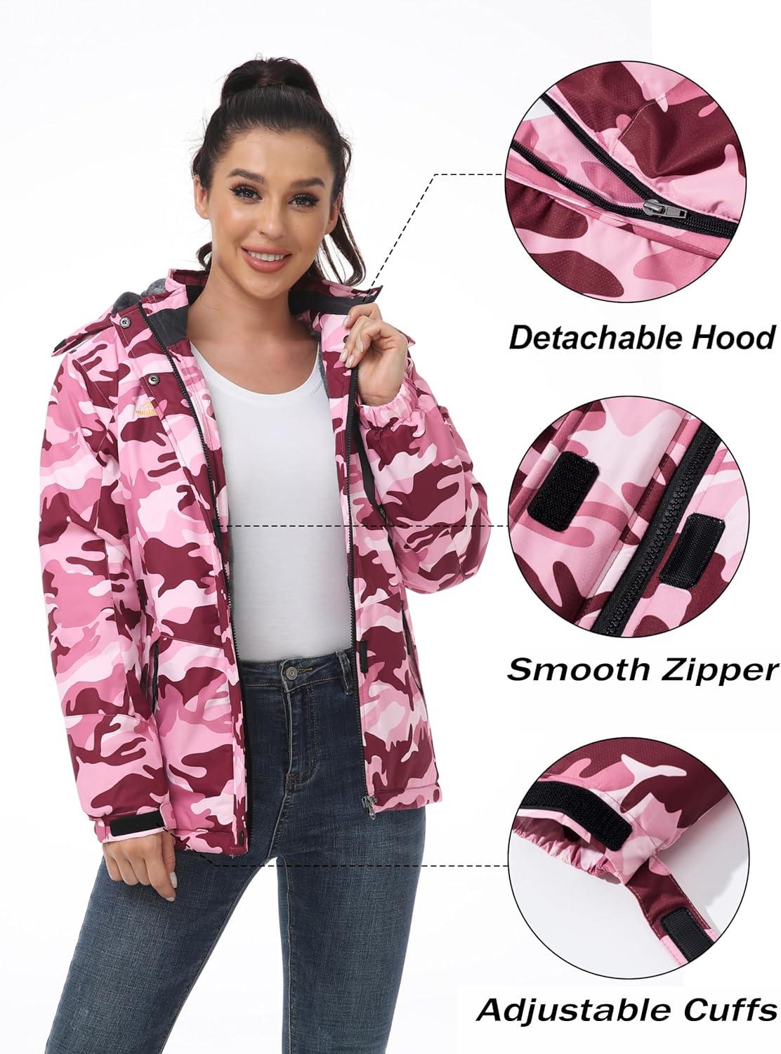 MAGCOMSEN Womens Ski Jacket Waterproof Insulated Snow Jacket Warm Windproof Winter Coats with Hood Fleece Lined Jacket(Pink Camo)